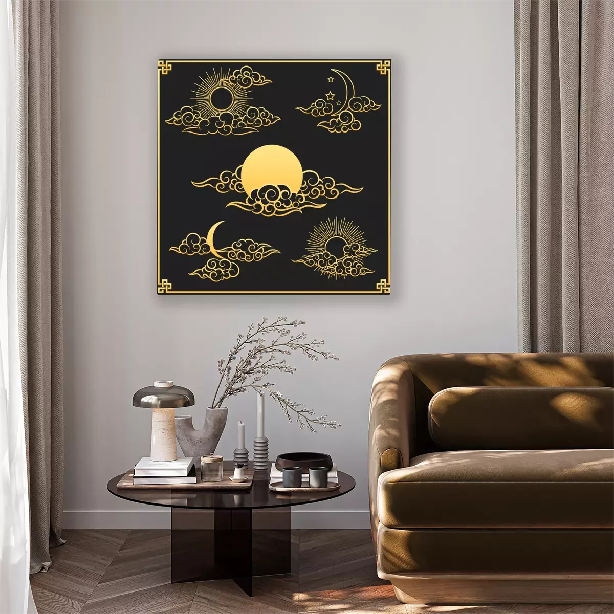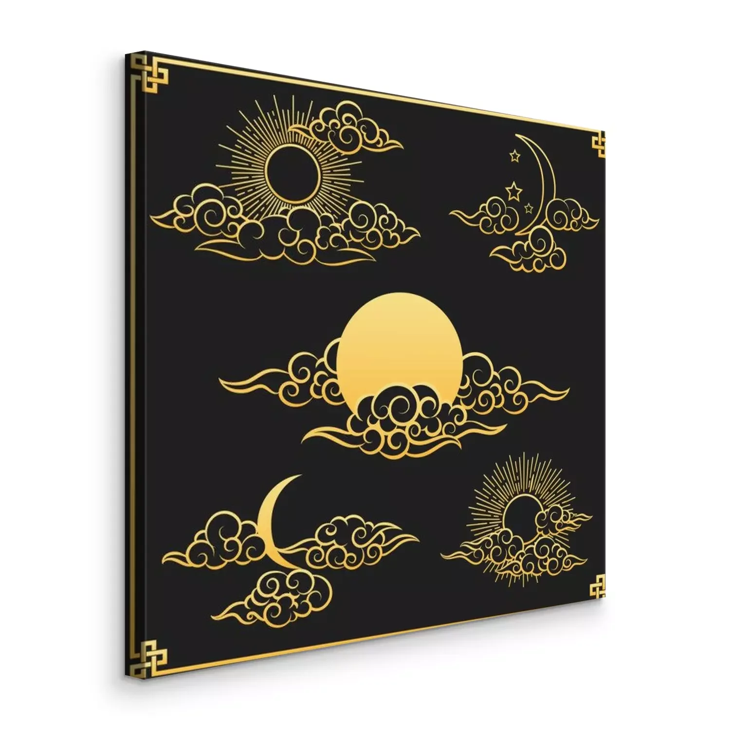 Canvas Oriental clouds, sun and moon. Gold sun and moon with clouds in old decorative traditional asian or chinese style vector illustration