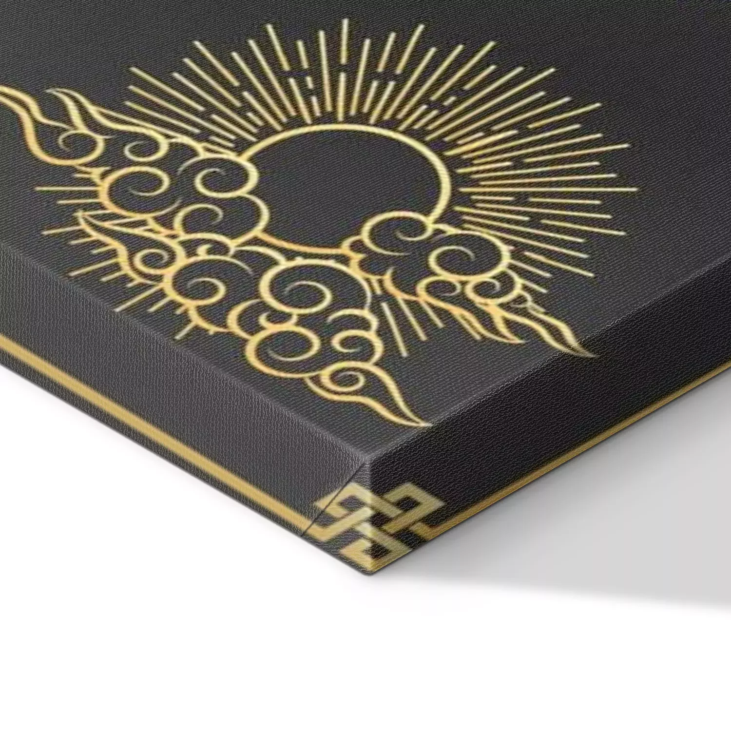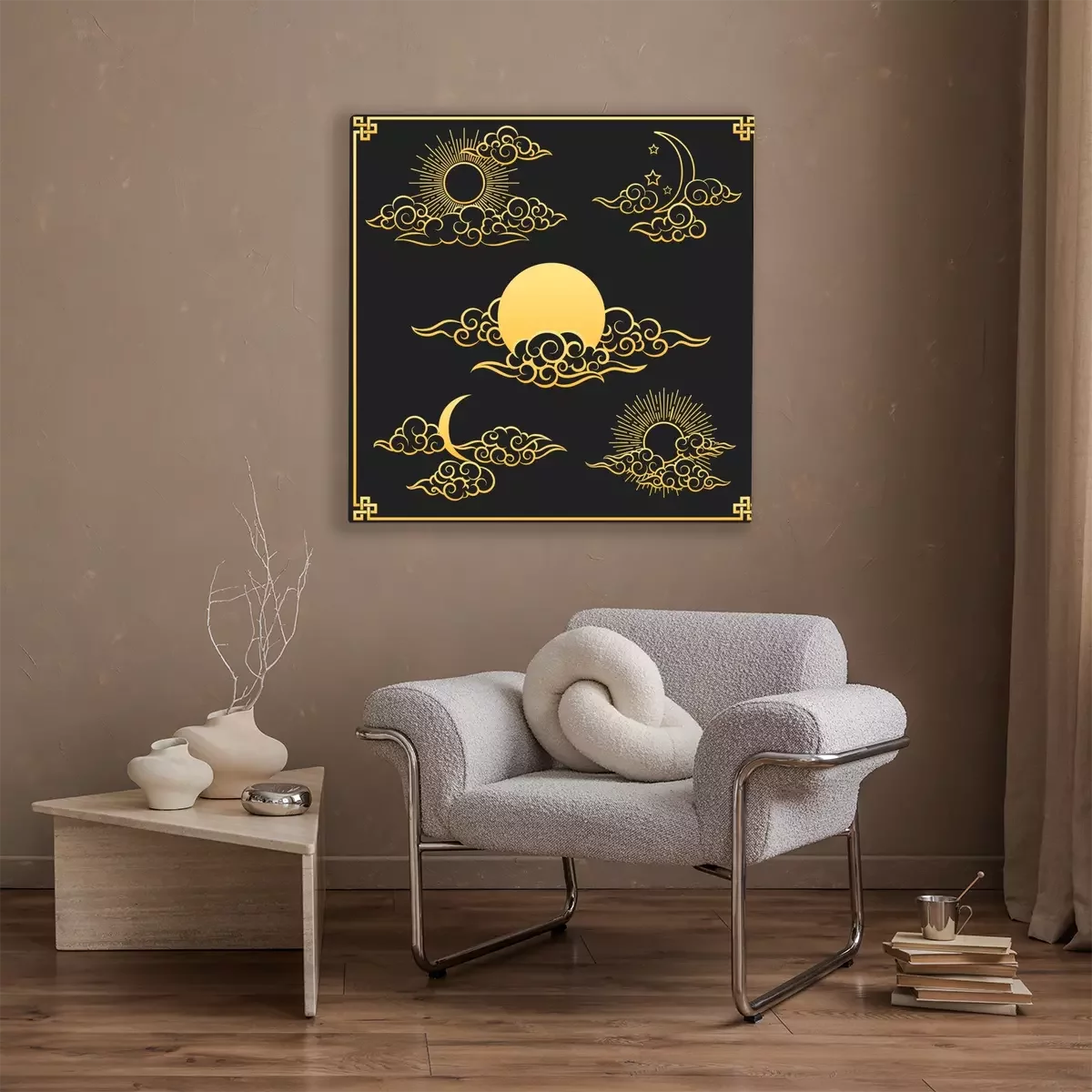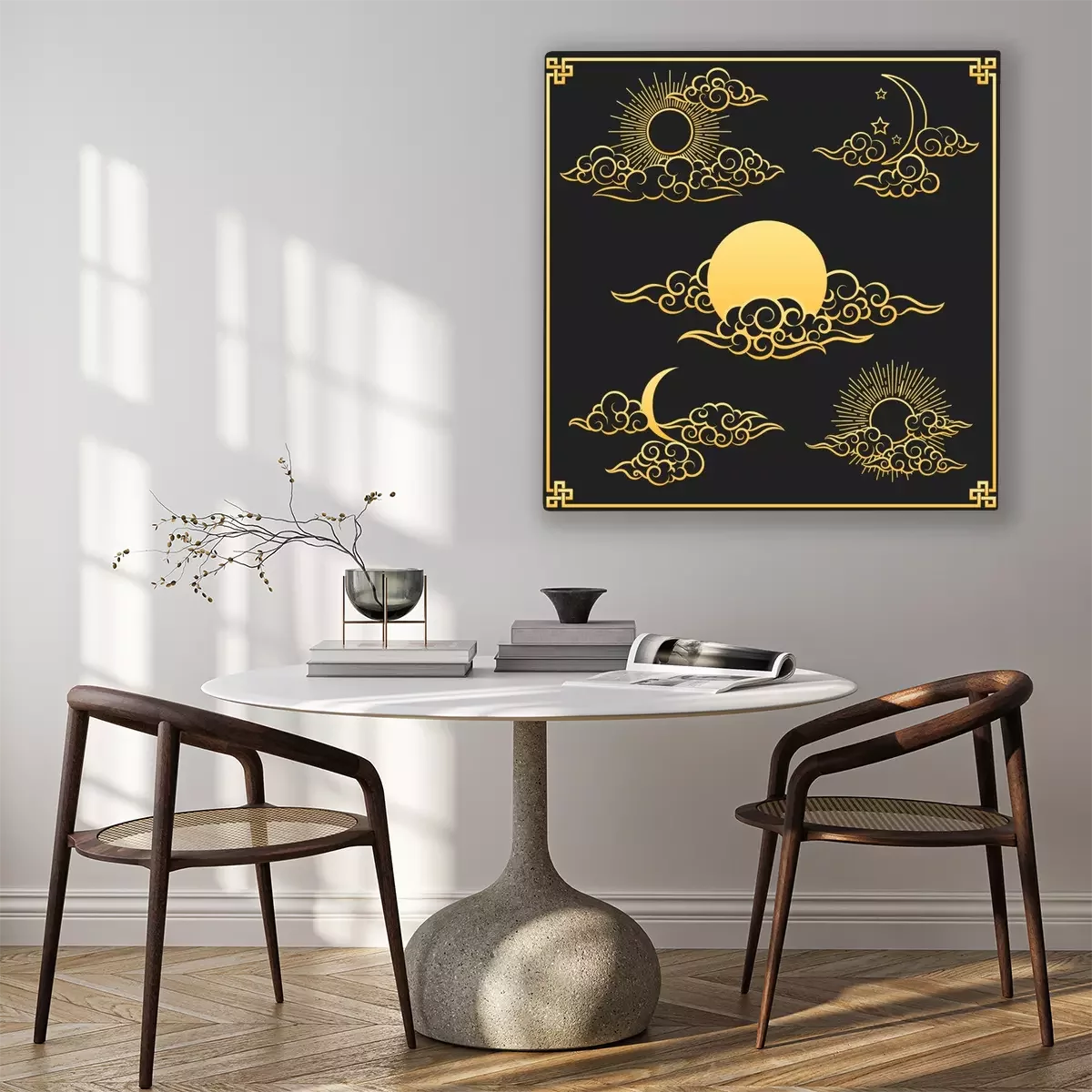 Canvas: Oriental clouds, sun and moon. Gold sun and moon with clouds in old decorative traditional asian or chinese style vector illustration