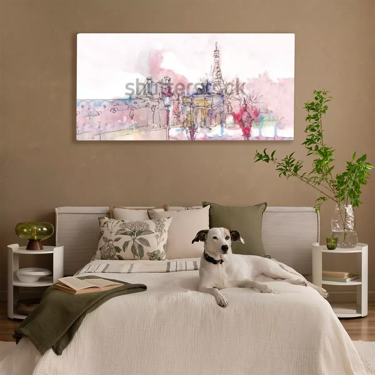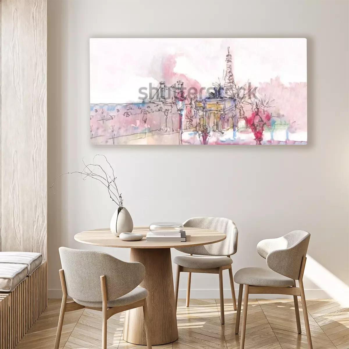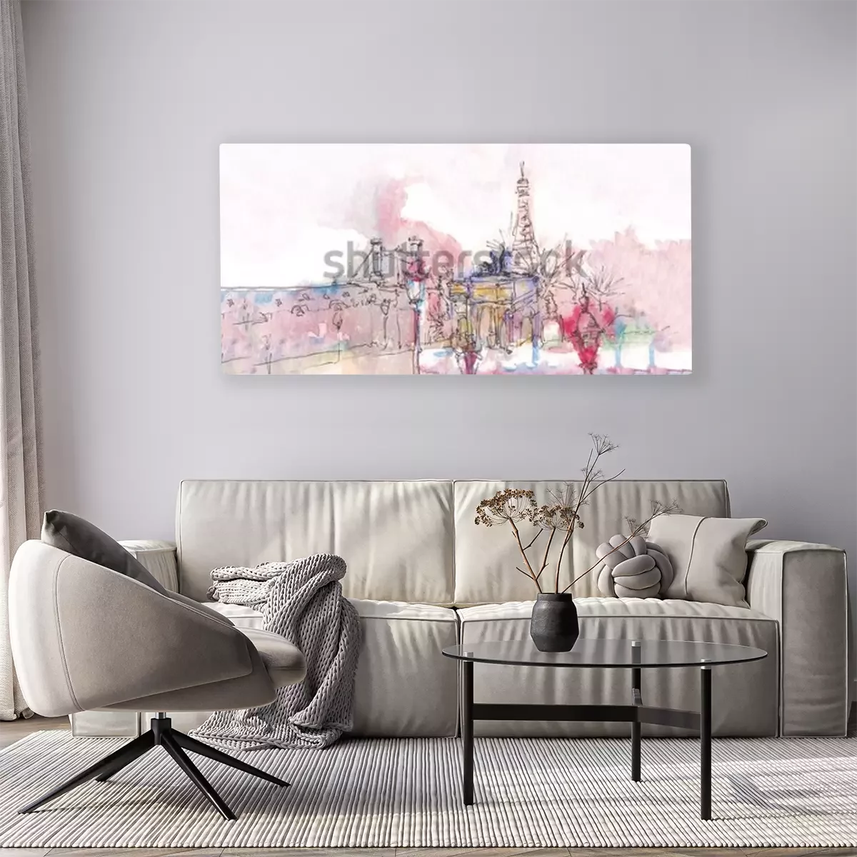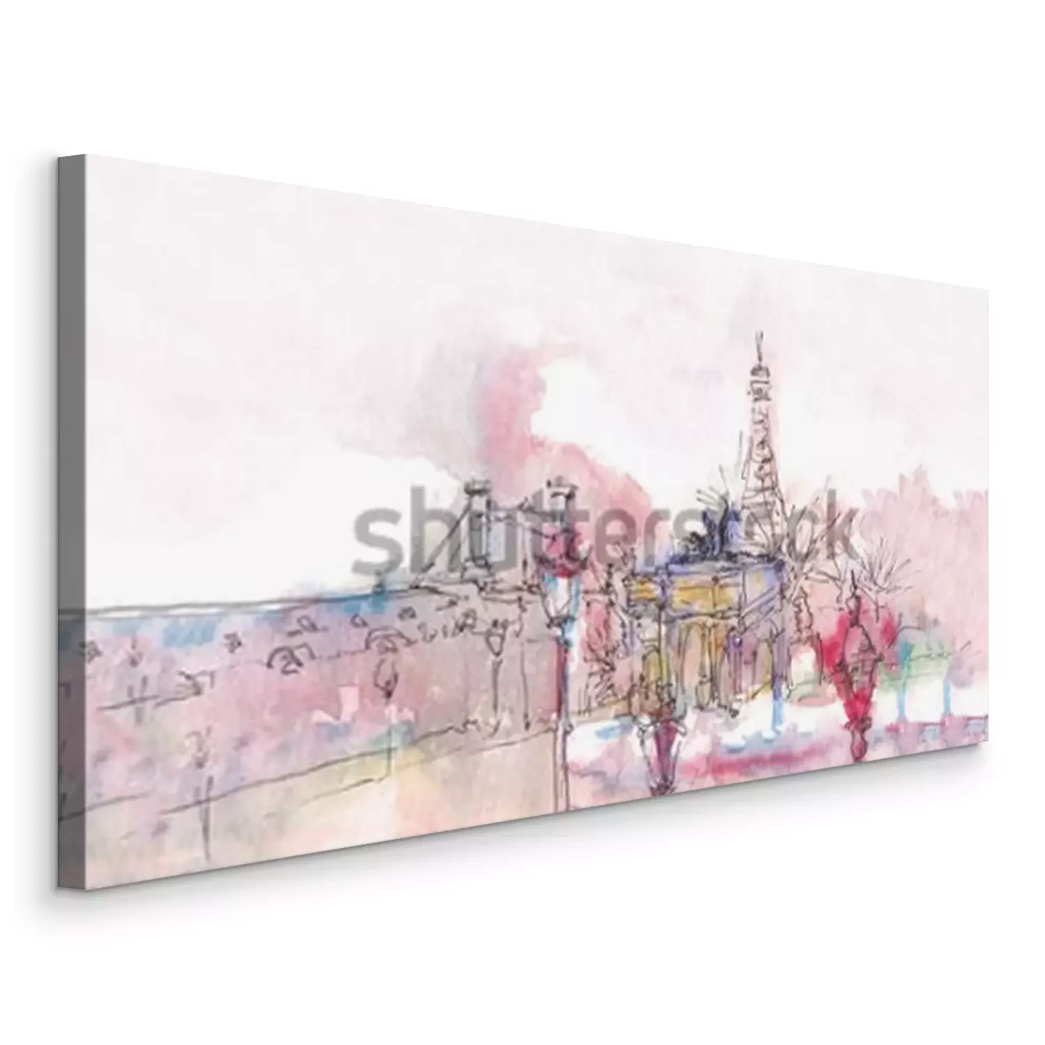Canvas: Oriëntatiepunt van Parijs met waterverf in een regenachtige dag - oude museummening met erachter de Toren van Eiffel. Aquarel chic. Parijse panorama. Parijse aquarel panorama. Chique landschap
