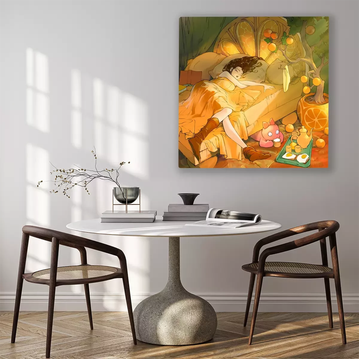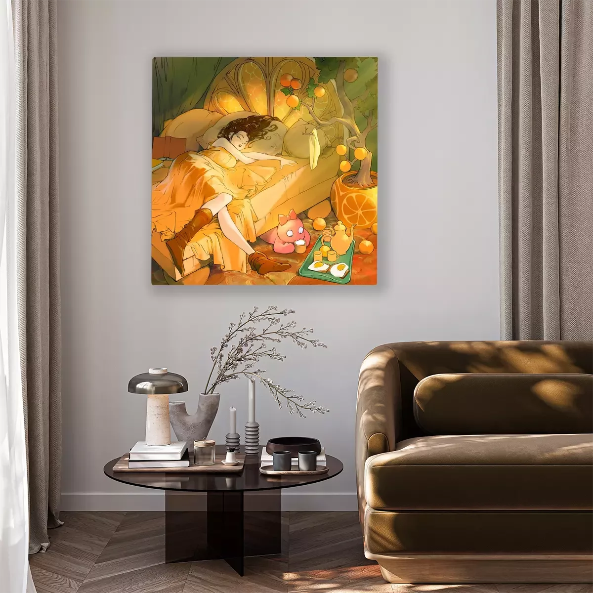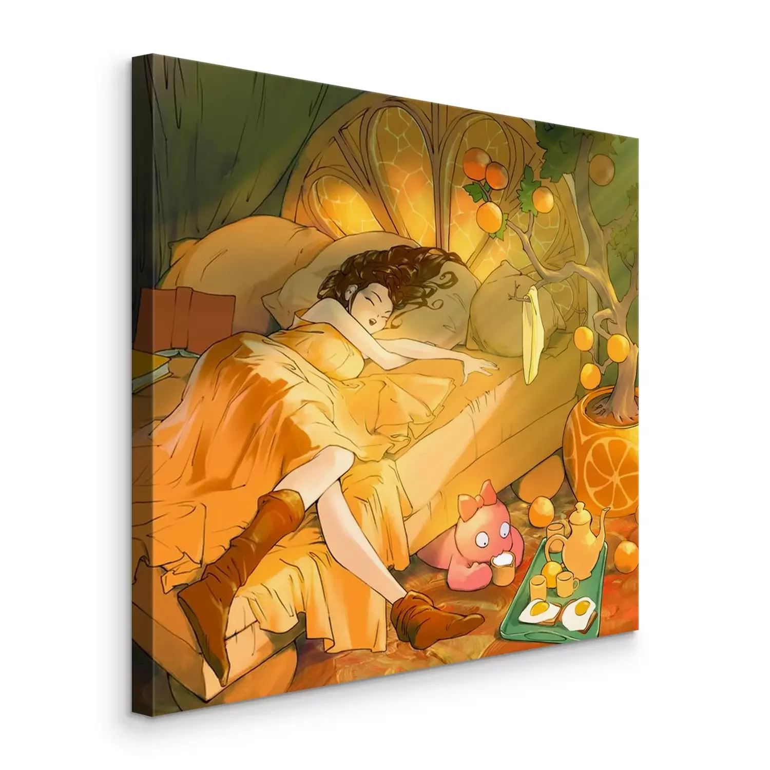 Canvas Original cartoon anime illustration of a funny cute girl sleeping in her cozy bed in the morning