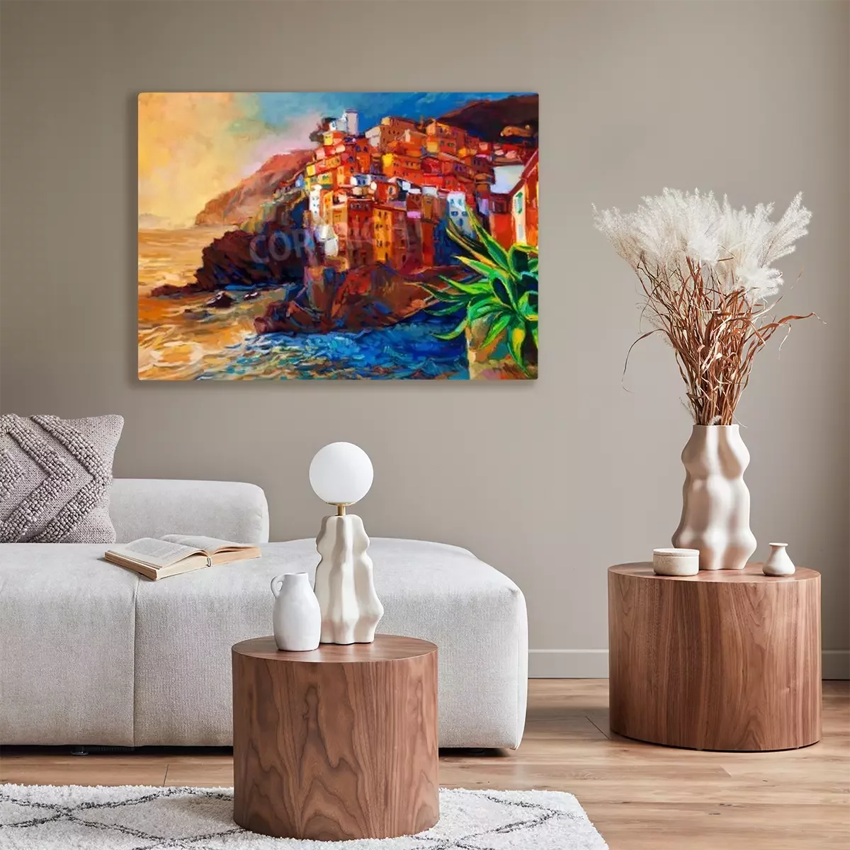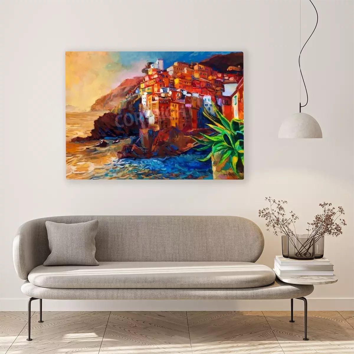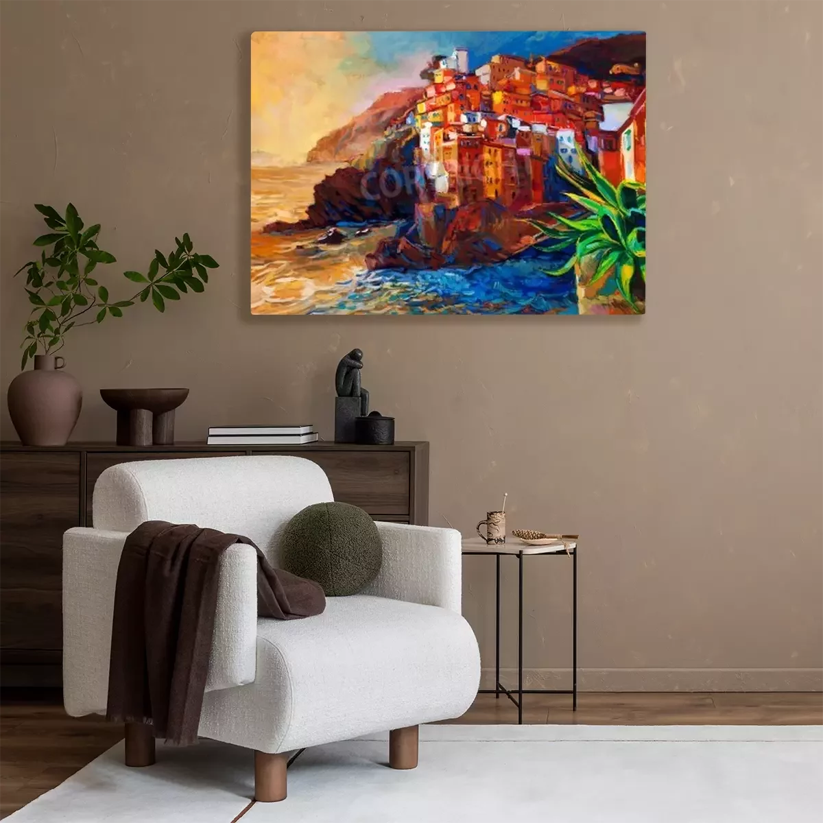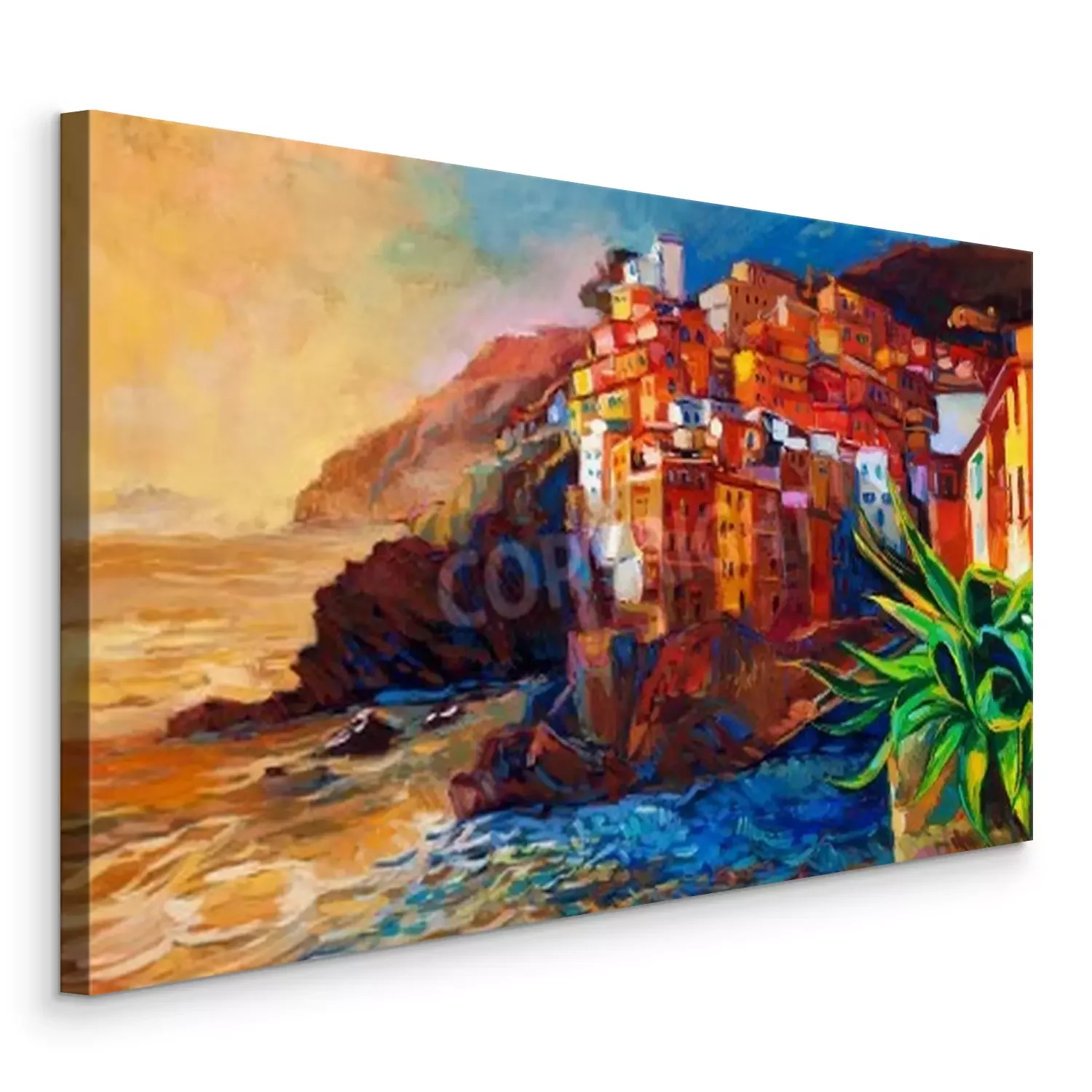 Canvas: Origineel abstract olieverfschilderij van een dorp op de Cinque Terre kust aan de Italiaanse Riviera.Modern Impressionisme
