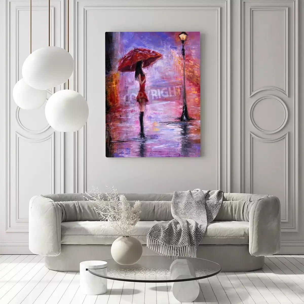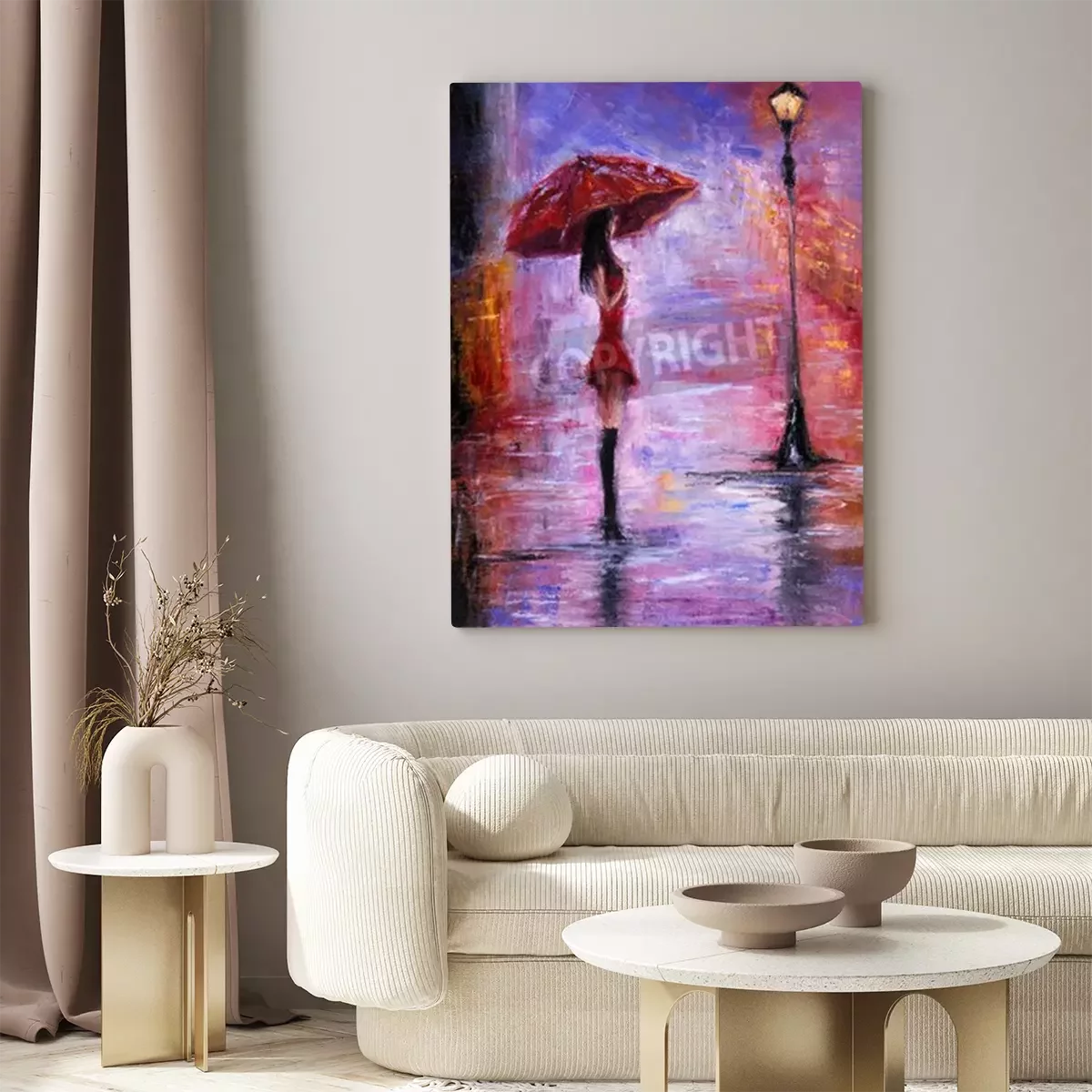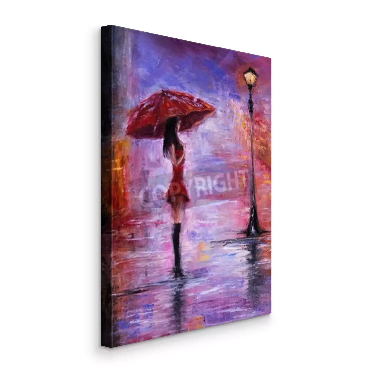 Canvas Origineel olieverfschilderij toont mooie jonge vrouw in het rood, met rode paraplu in de buurt van een straat lamp op canvas. Modern Impressionisme, het modernisme, marinisme