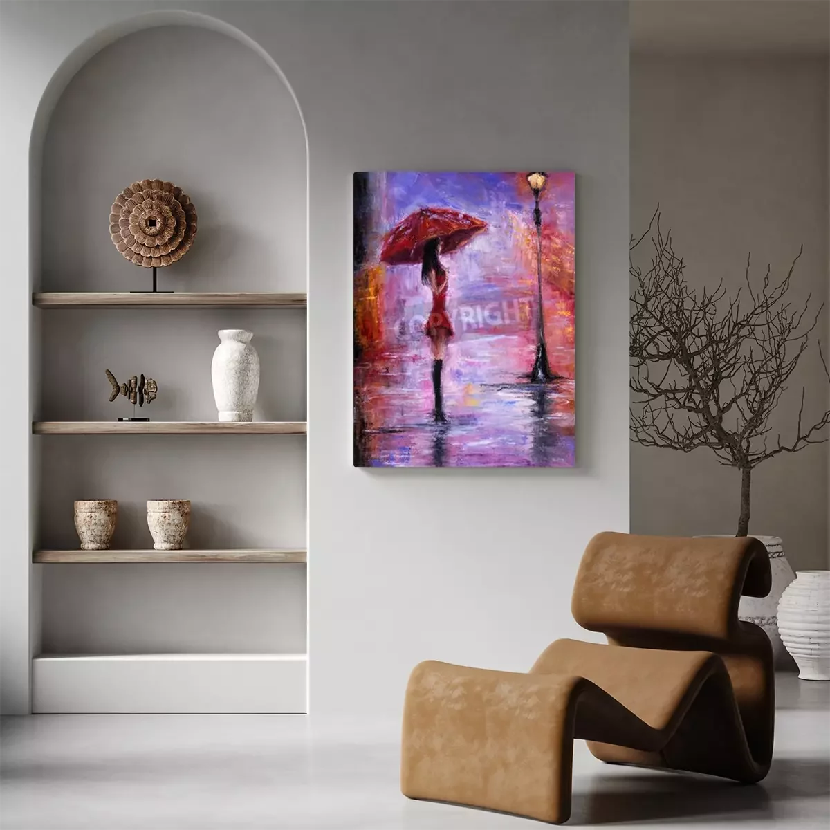 Canvas: Origineel olieverfschilderij toont mooie jonge vrouw in het rood, met rode paraplu in de buurt van een straat lamp op canvas. Modern Impressionisme, het modernisme, marinisme