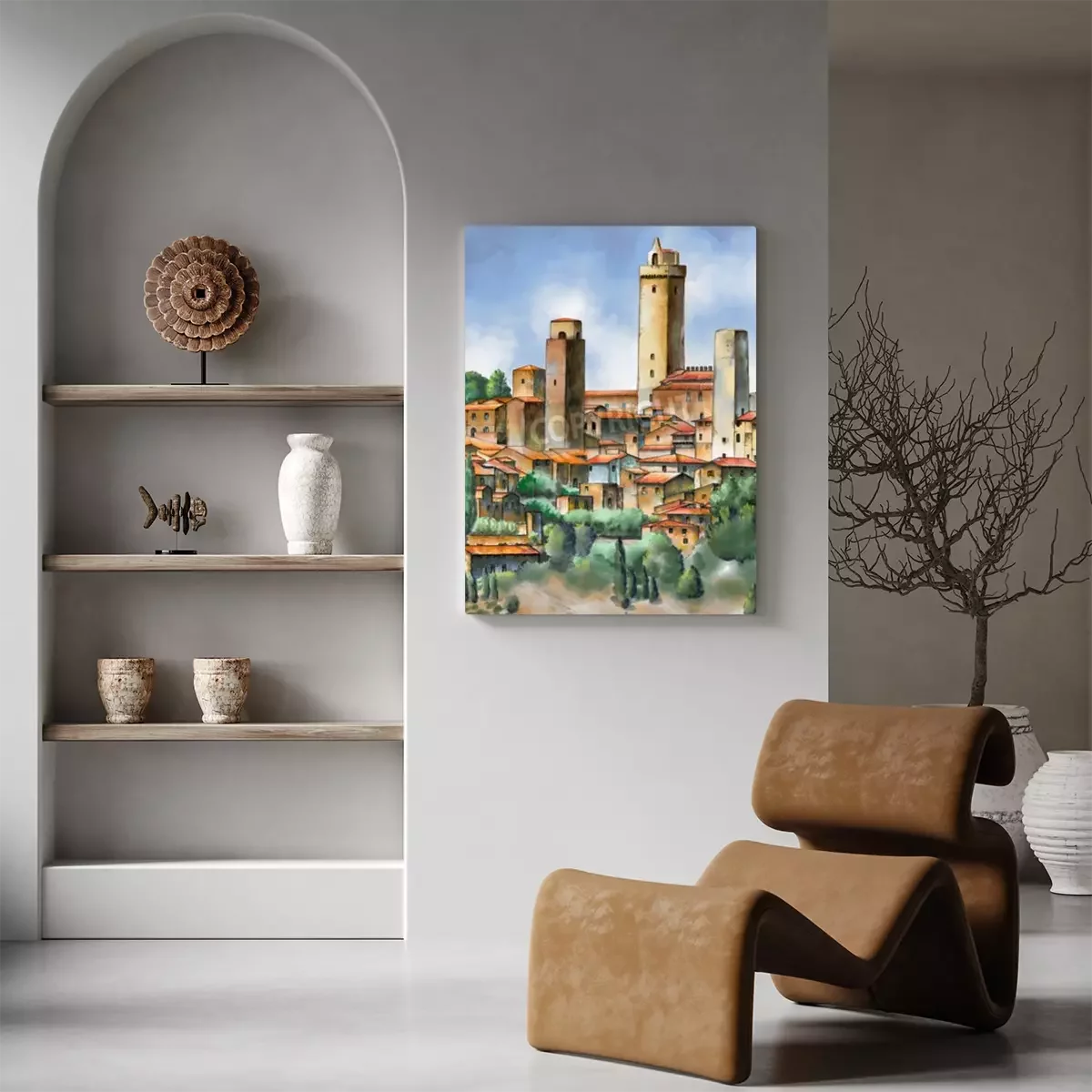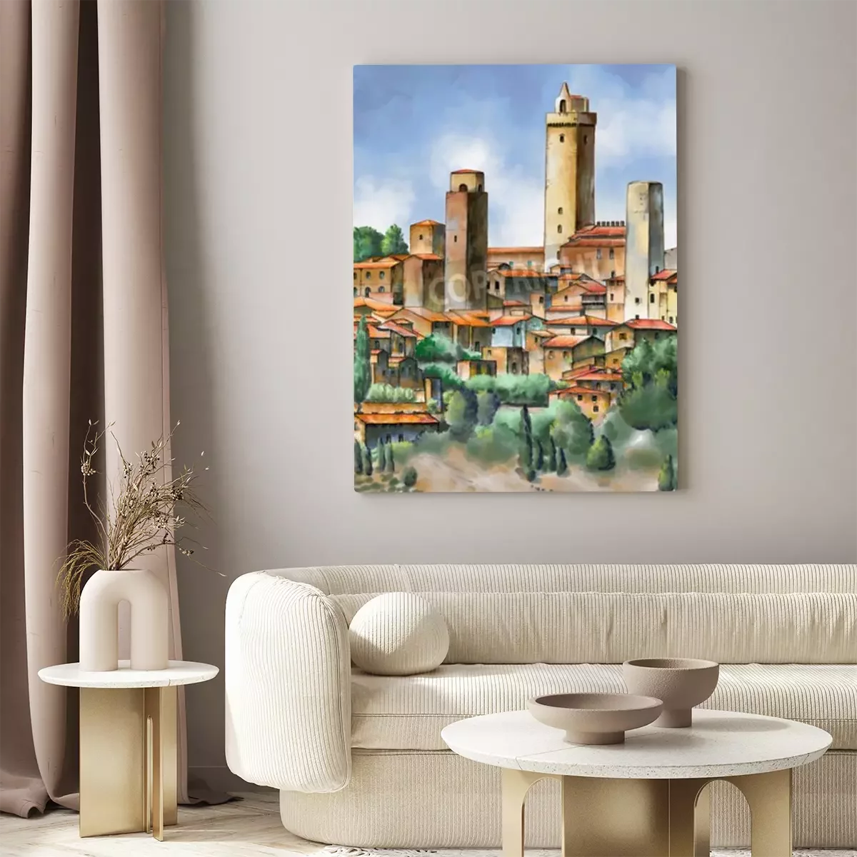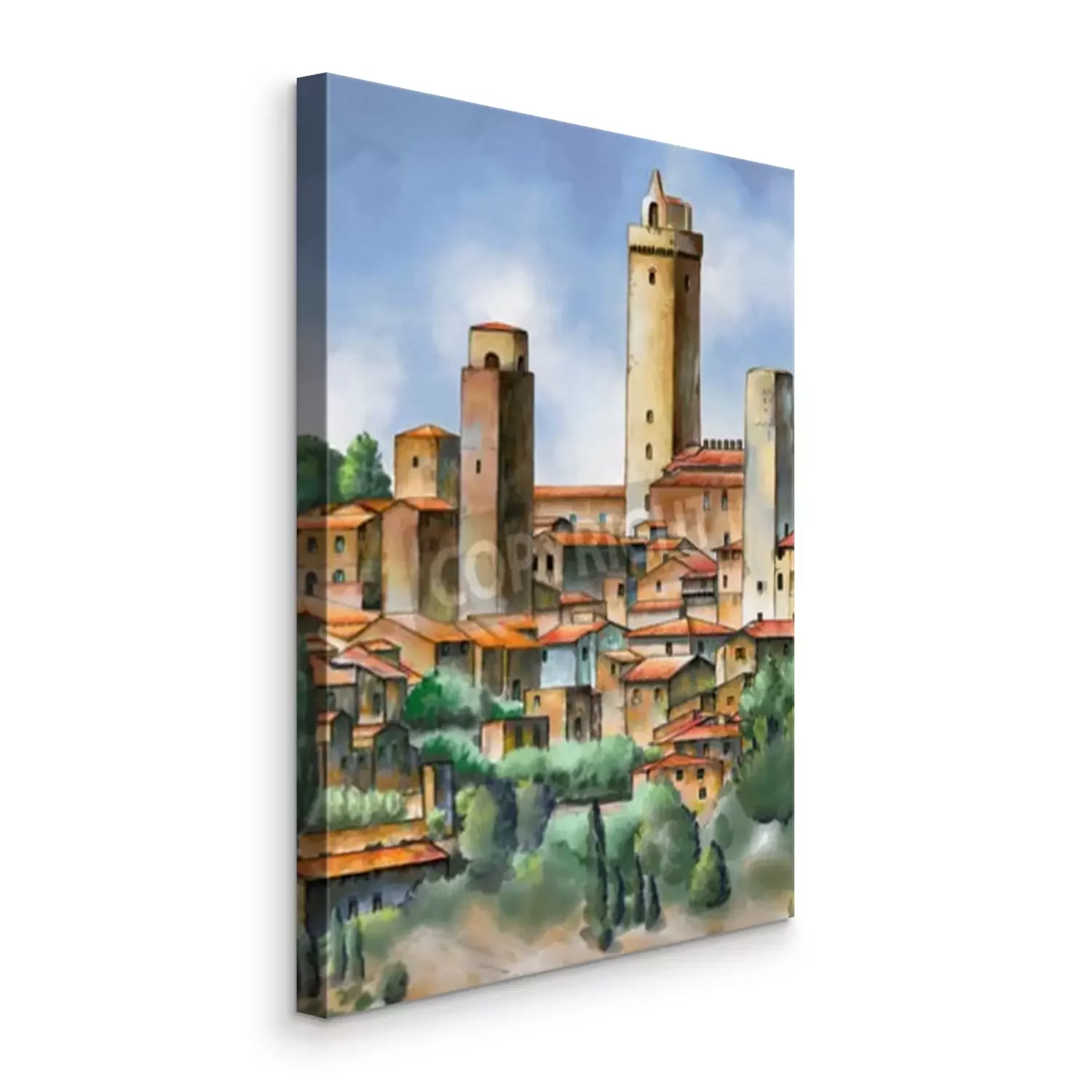 Canvas: Originele aquarel schilderij van San Gimignano in Toscane, Italië.