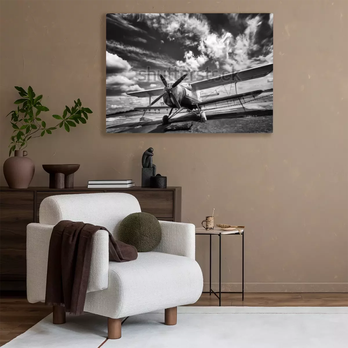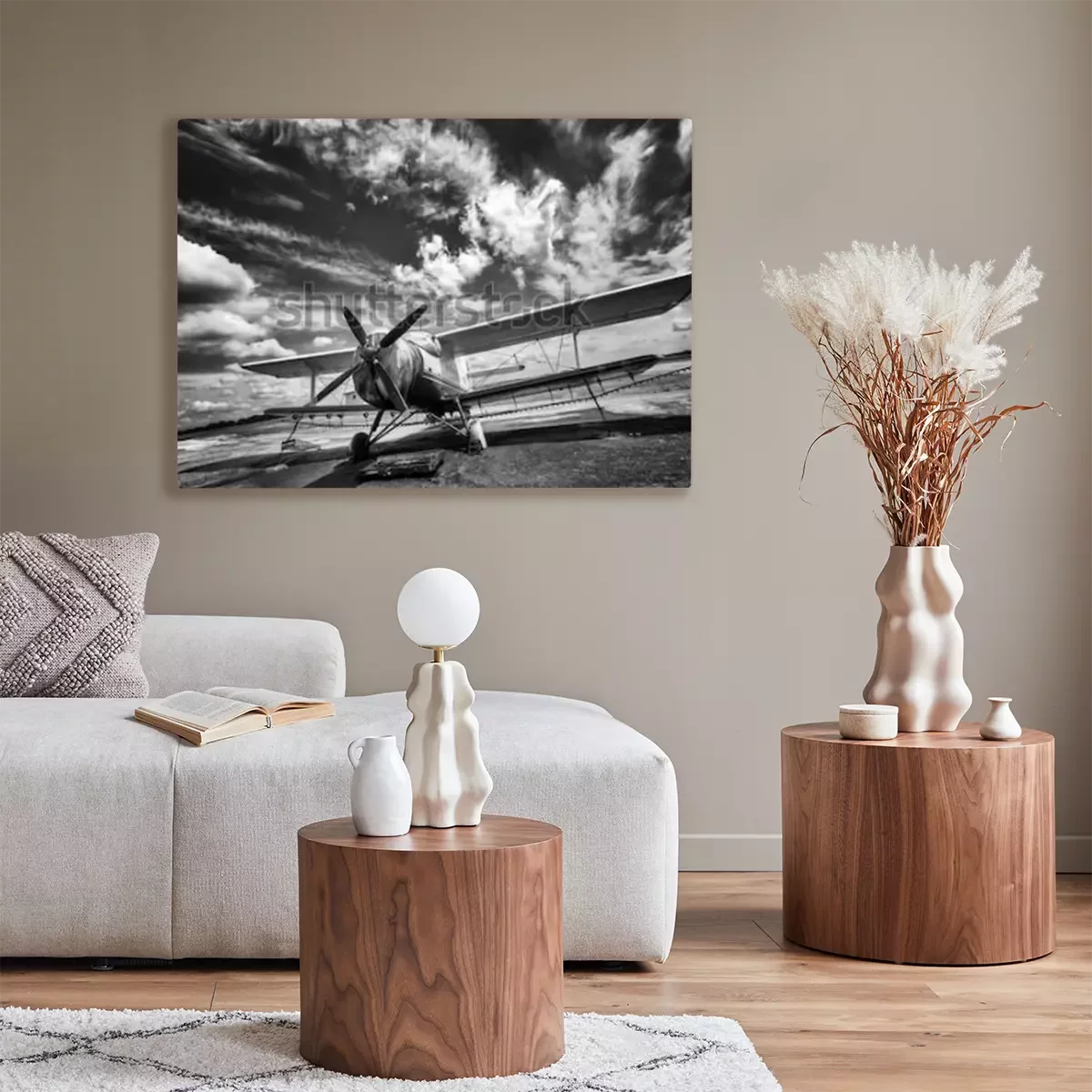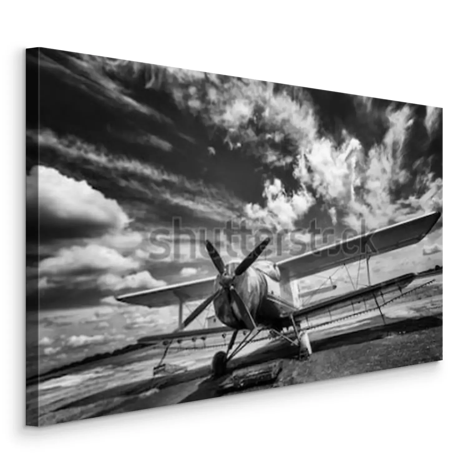 Canvas: Oud vliegtuig op gebied in zwart-wit