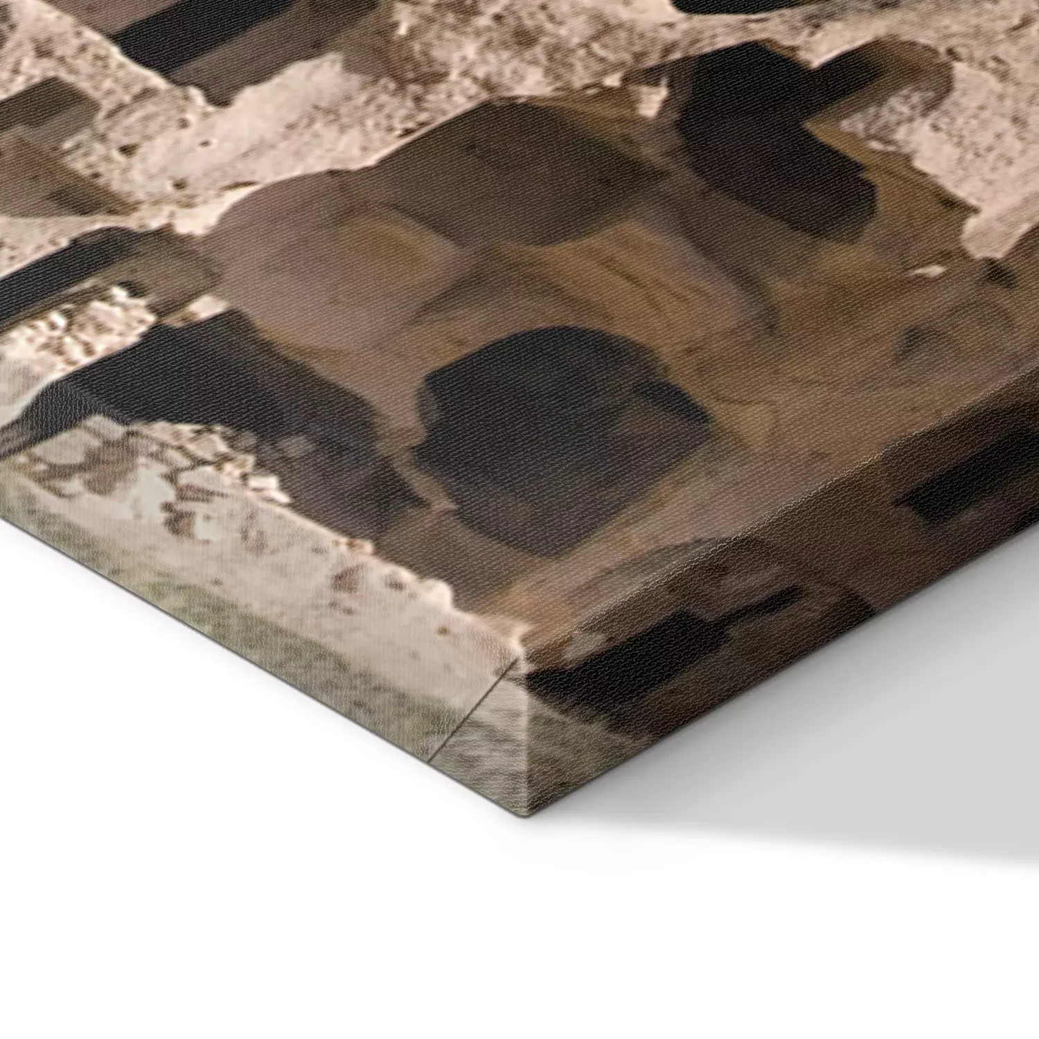 De print wordt aangebracht op hoogwaardig canvas dat op een schildersweefgetouw (spieraam) wordt gespannen. Omdat de print de zijranden bedekt, hoeft het ontwerp niet met een extra kader te worden omlijst. Wij raden ook composities aan die uit meerdere foto's bestaan en zo een coherente compositie vormen.