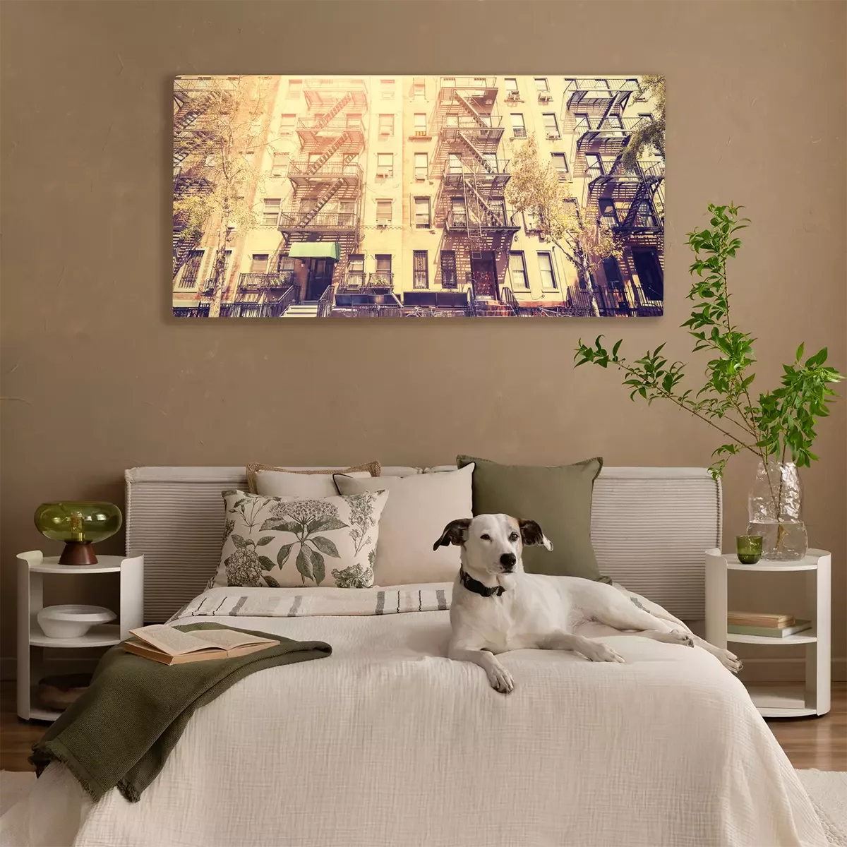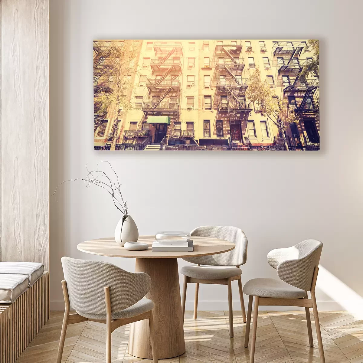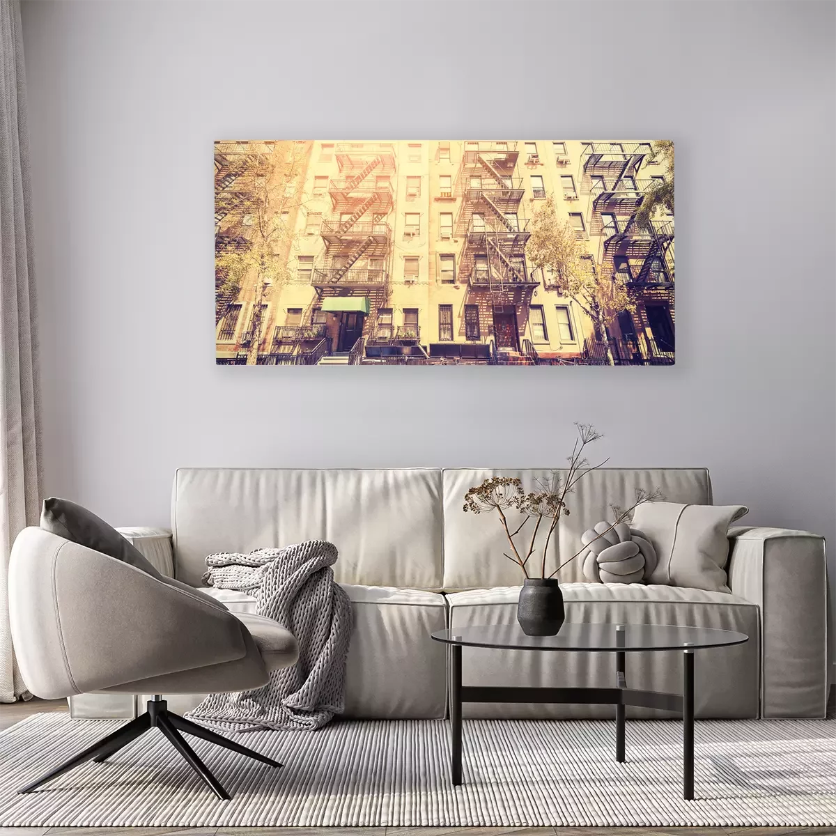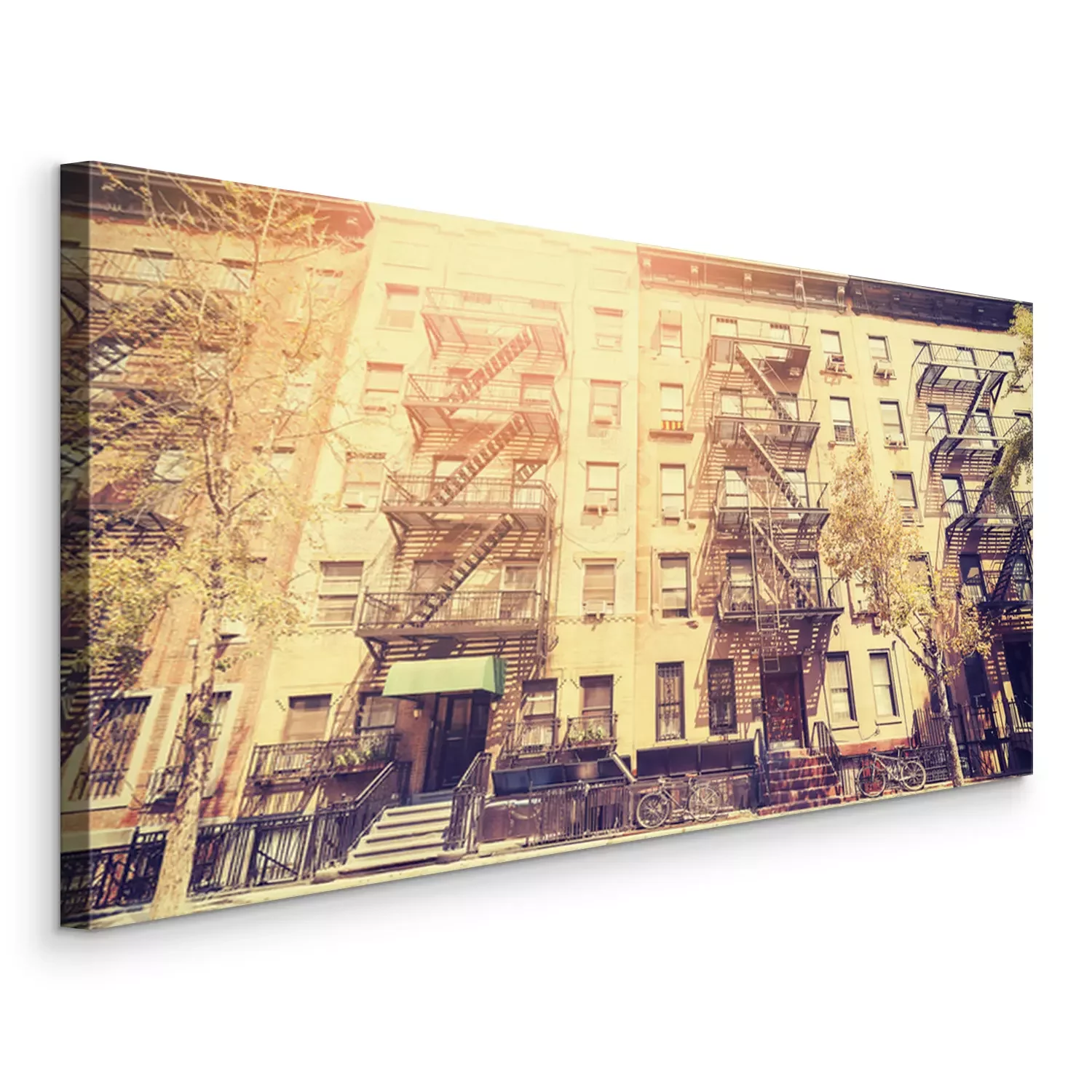 Retro-stijl foto van het gebouw met brandtrap ladders, NYC.