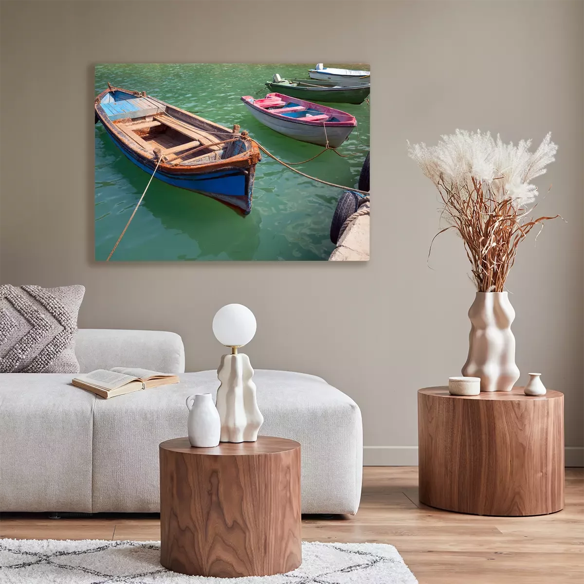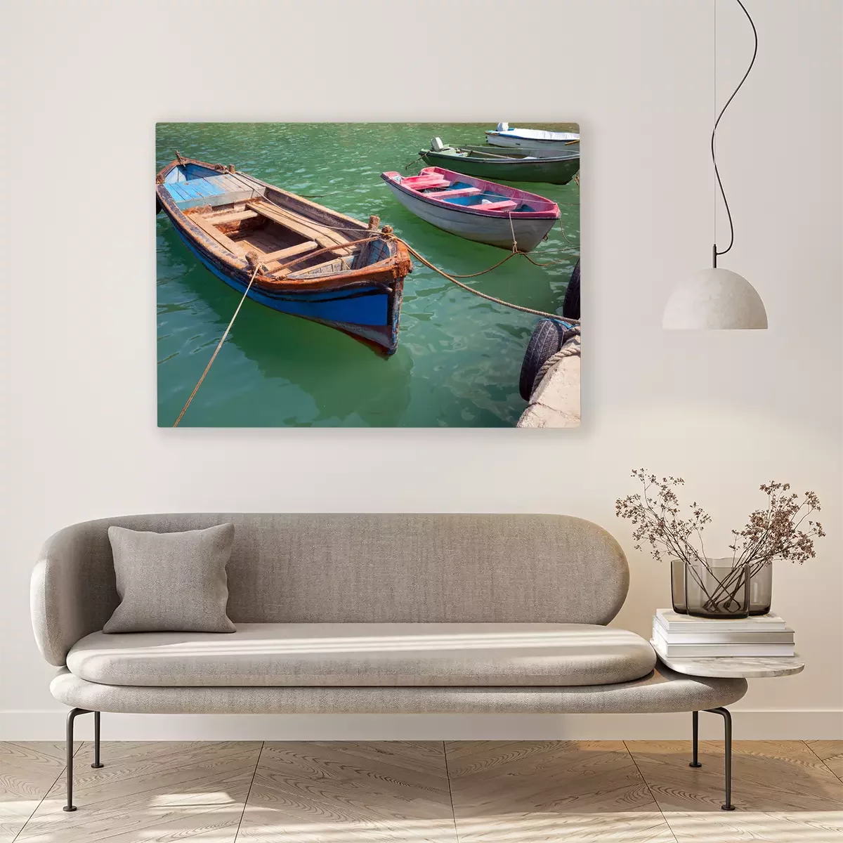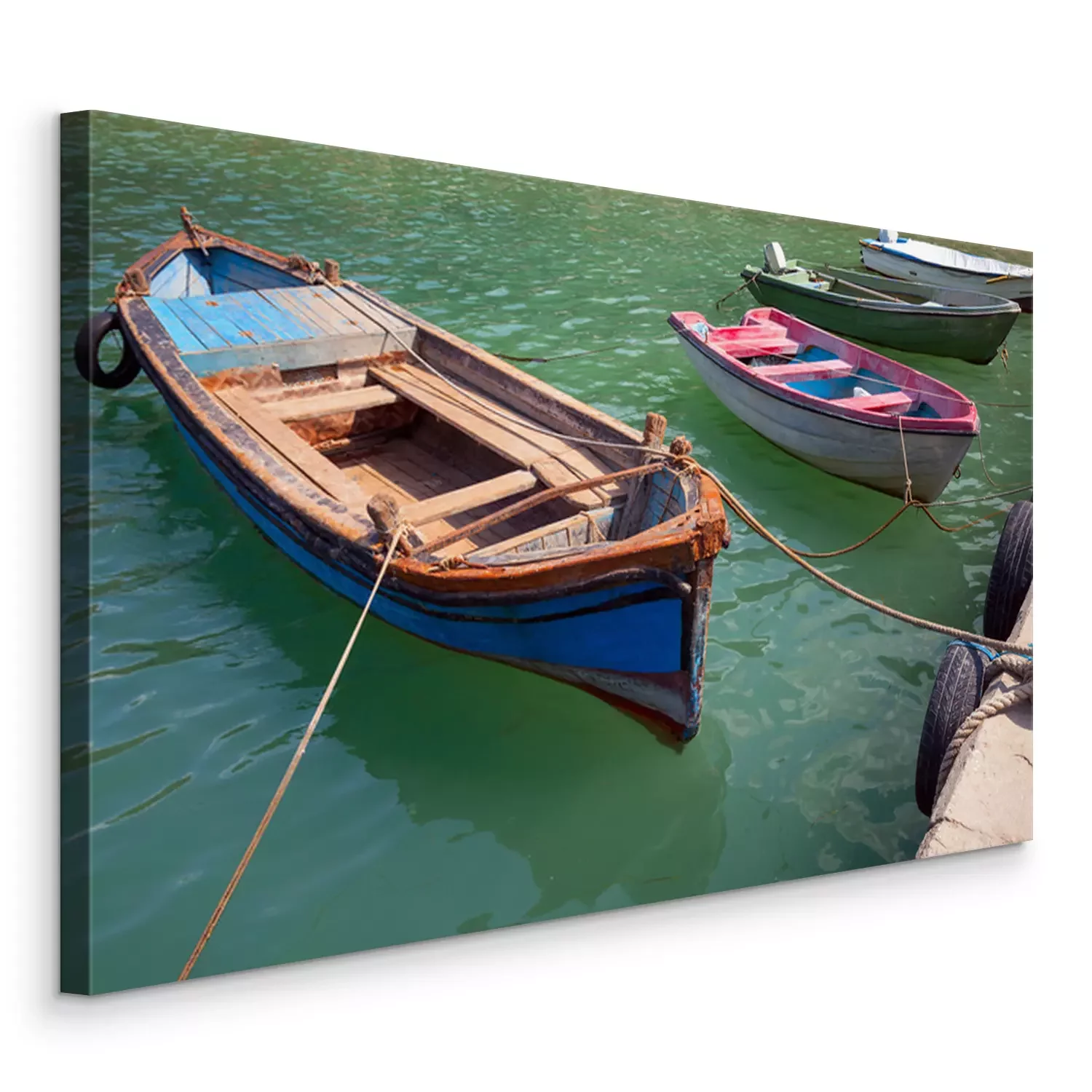 Canvas: Oude kleine houten vissers boten afgemeerd in kleine Bulgaarse stad