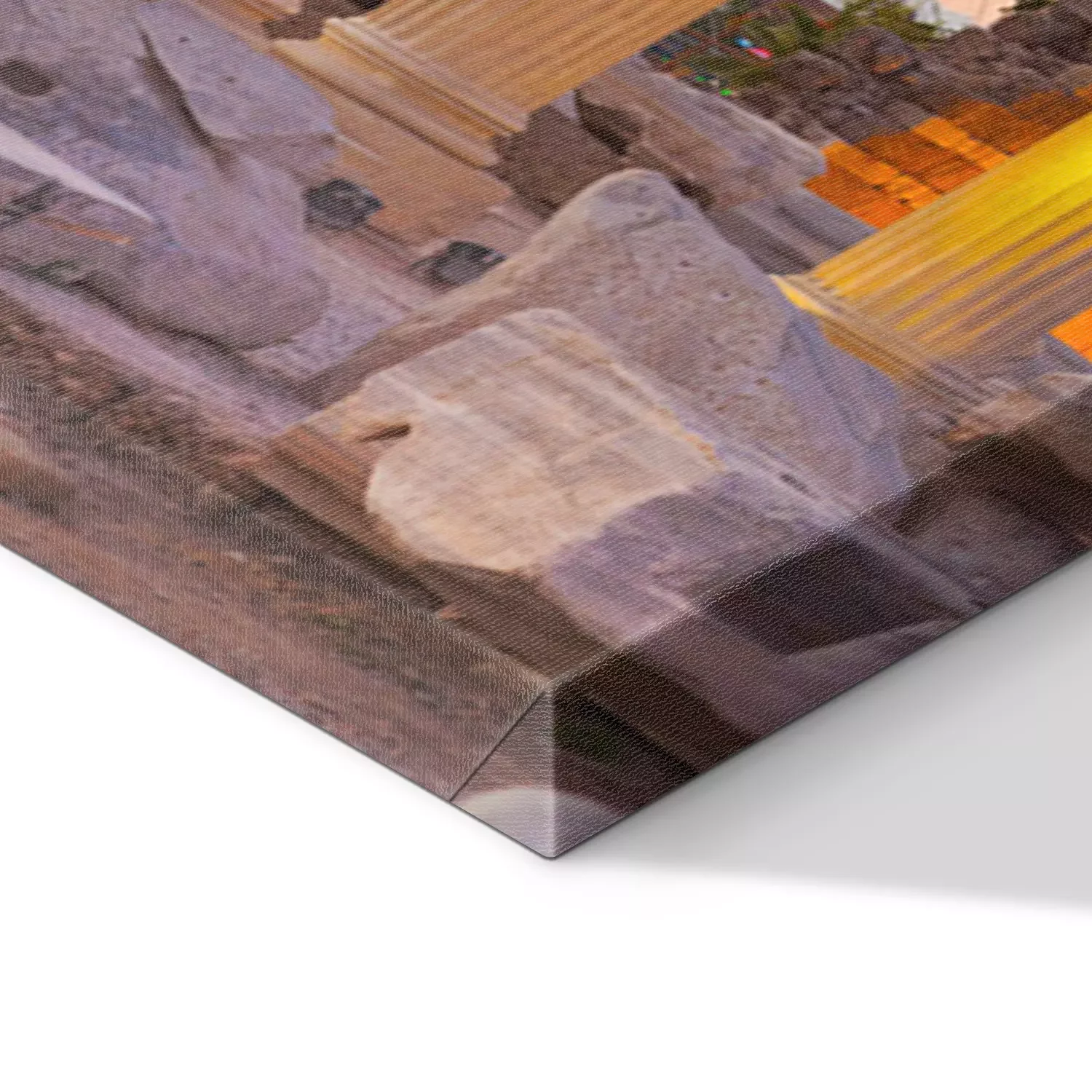 De print wordt aangebracht op hoogwaardig canvas dat op een schildersweefgetouw (spieraam) wordt gespannen. Omdat de print de zijranden bedekt, hoeft het ontwerp niet met een extra kader te worden omlijst. Wij raden ook composities aan die uit meerdere foto's bestaan en zo een coherente compositie vormen.