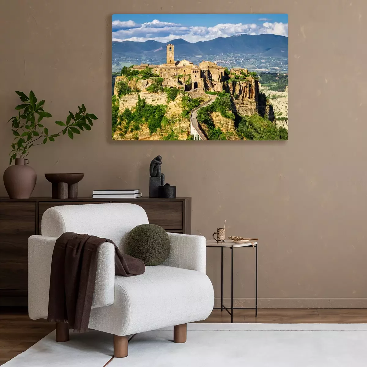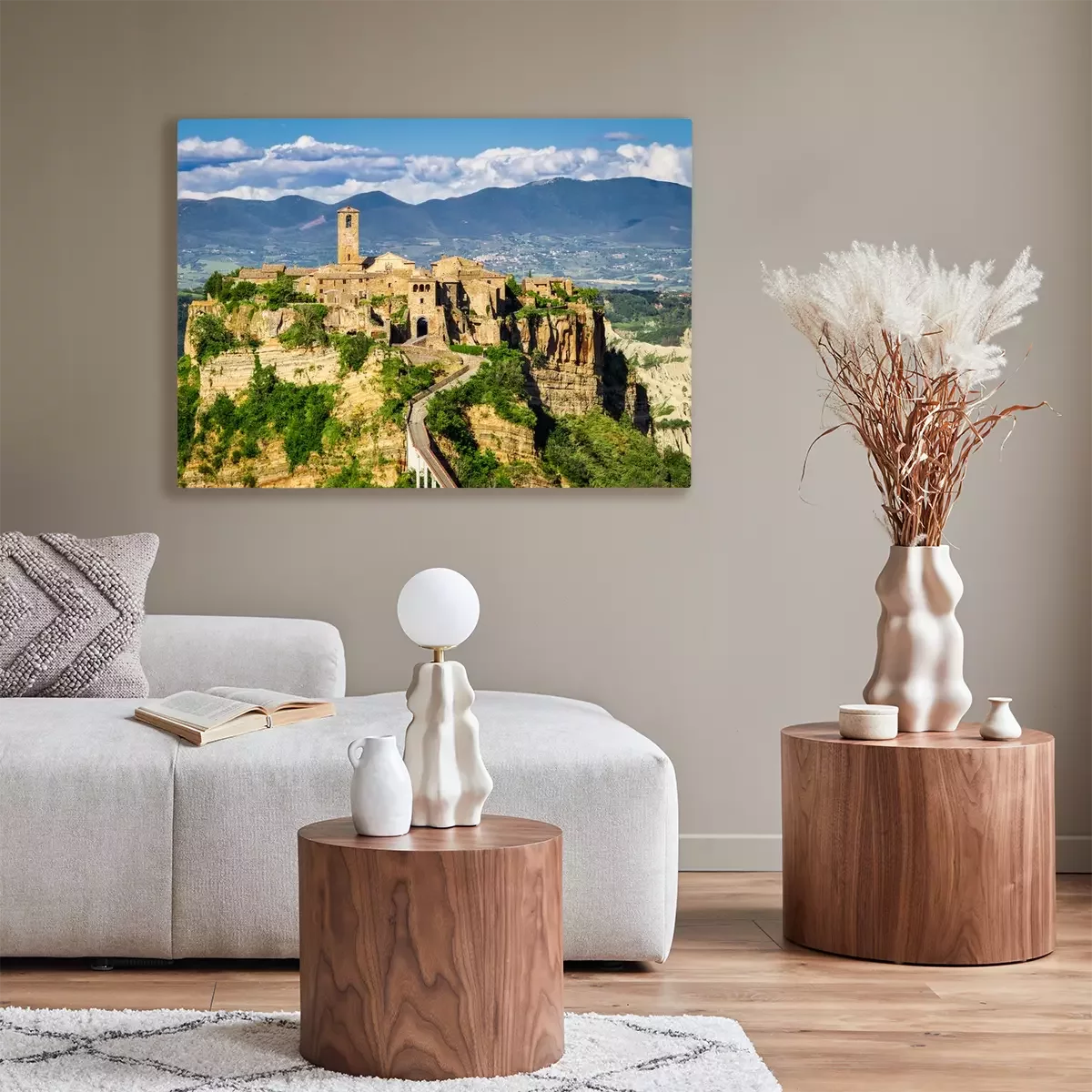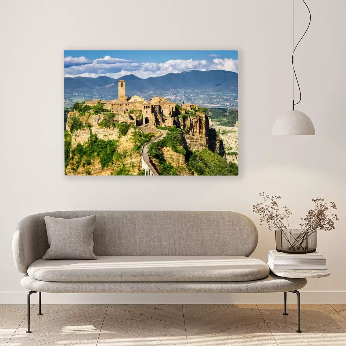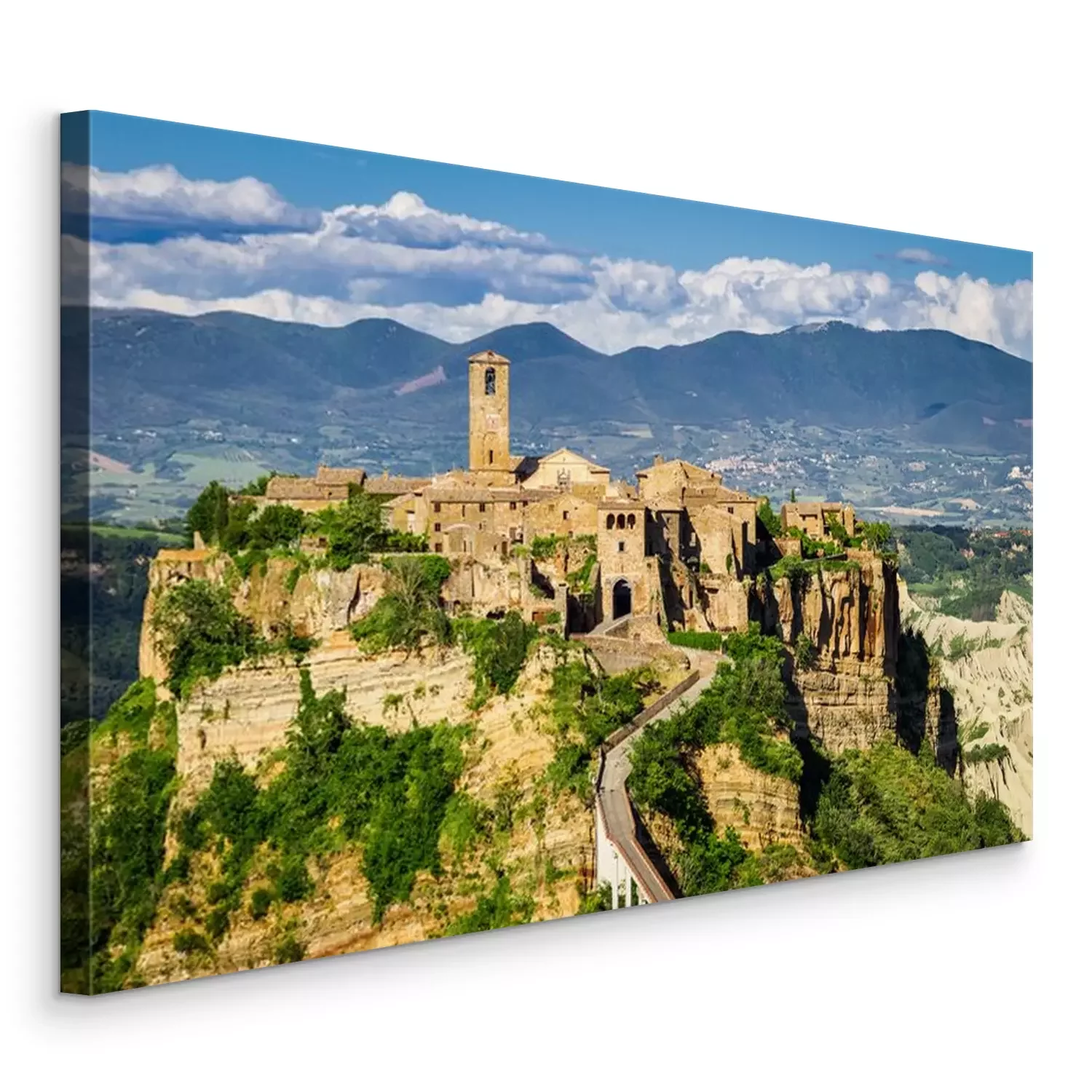 Canvas: Oude stad op de heuvel in Toscane op een bergen achtergrond.