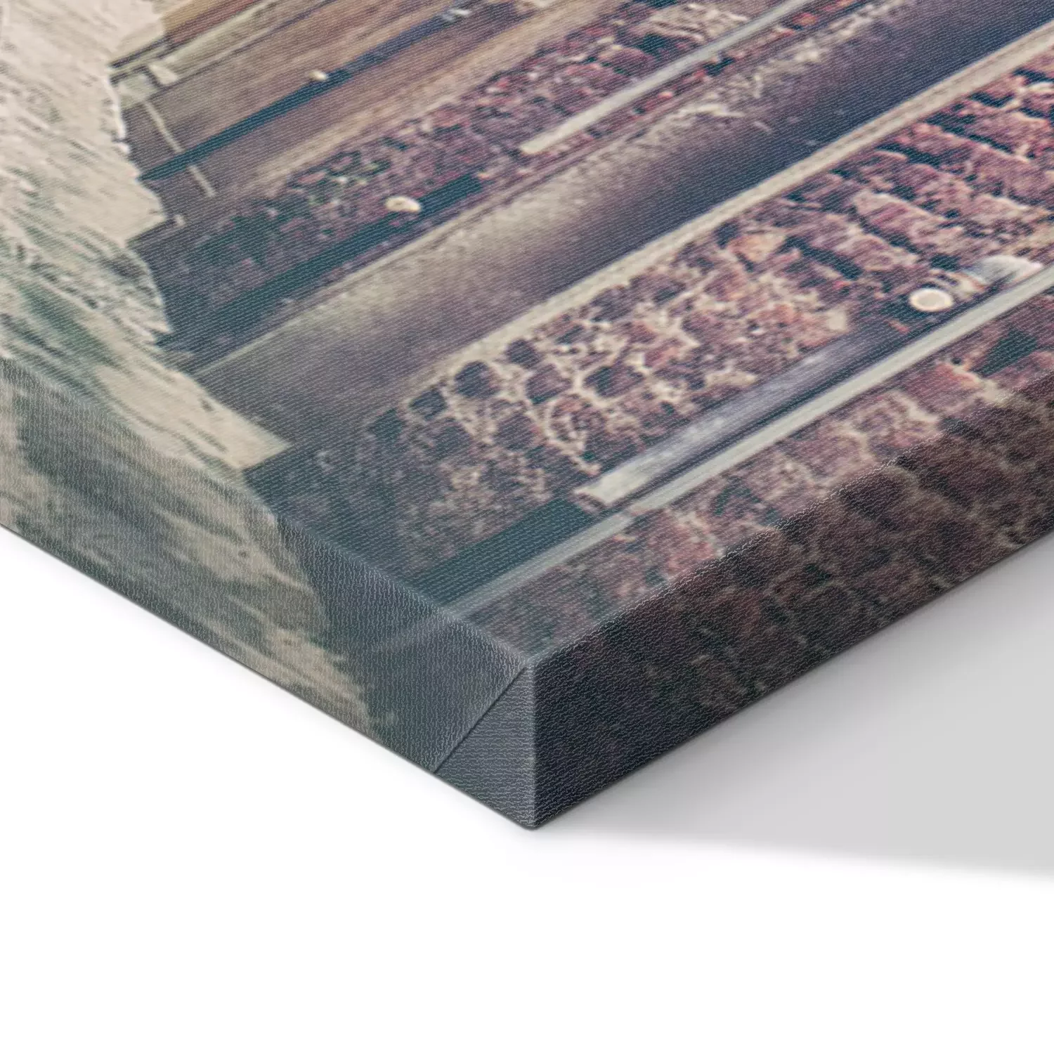 De print wordt aangebracht op hoogwaardig canvas dat op een schildersweefgetouw (spieraam) wordt gespannen. Omdat de print de zijranden bedekt, hoeft het ontwerp niet met een extra kader te worden omlijst. Wij raden ook composities aan die uit meerdere foto's bestaan en zo een coherente compositie vormen.