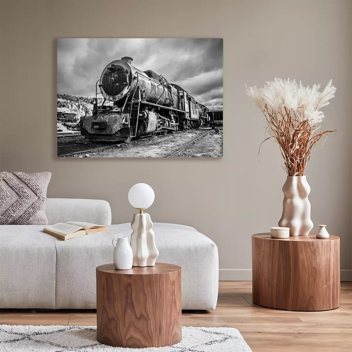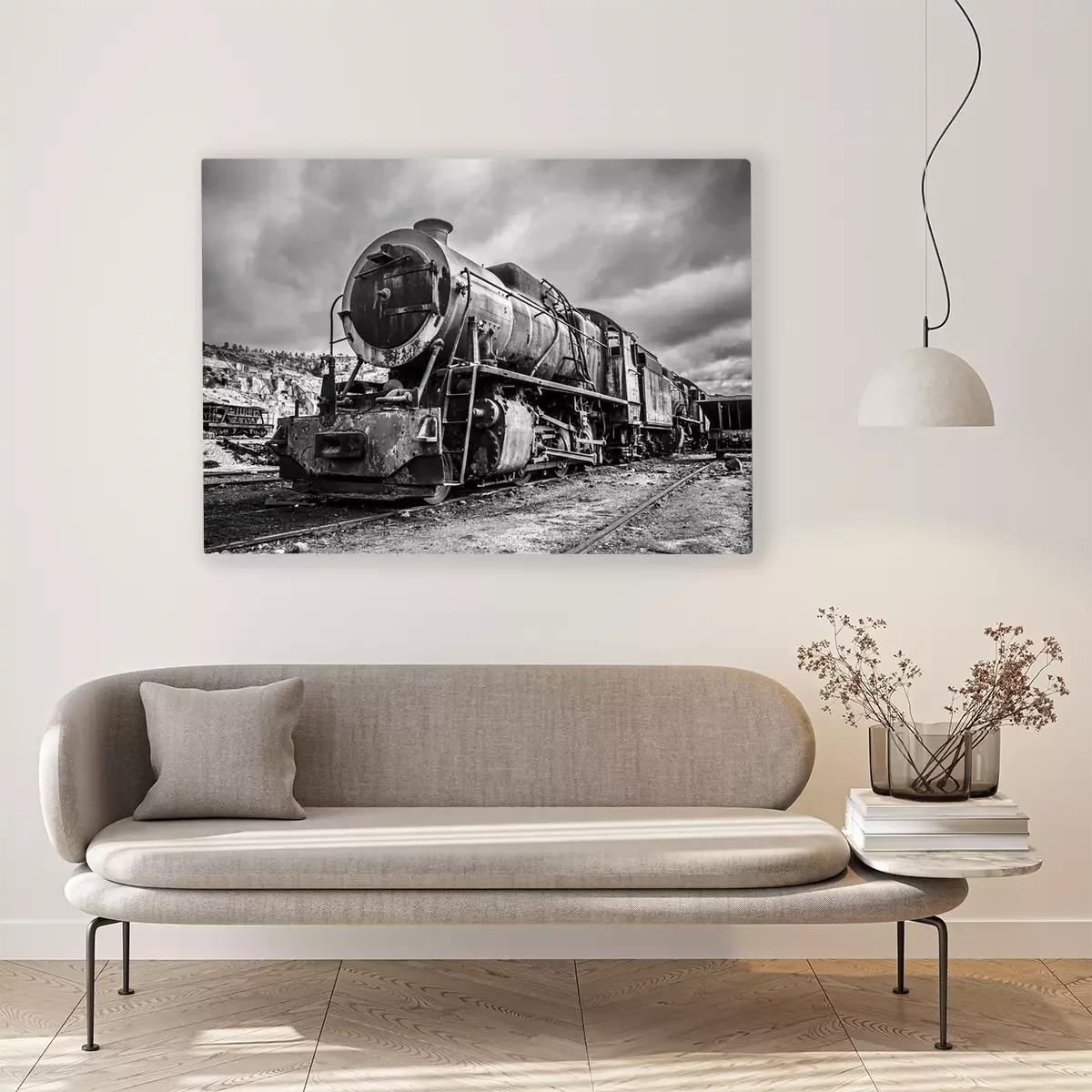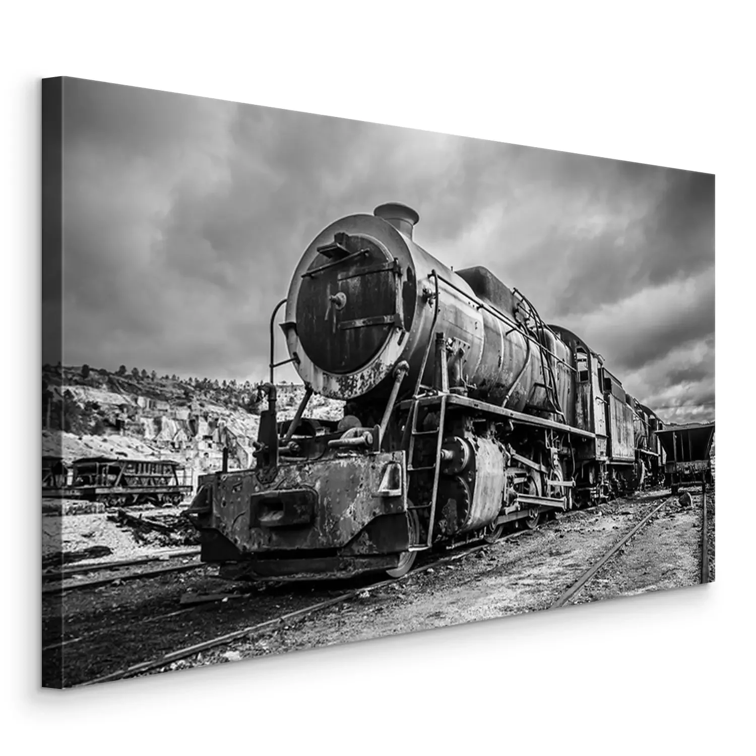 Canvas: Oude verlaten locomotief trein, dramatische zwart-wit versie