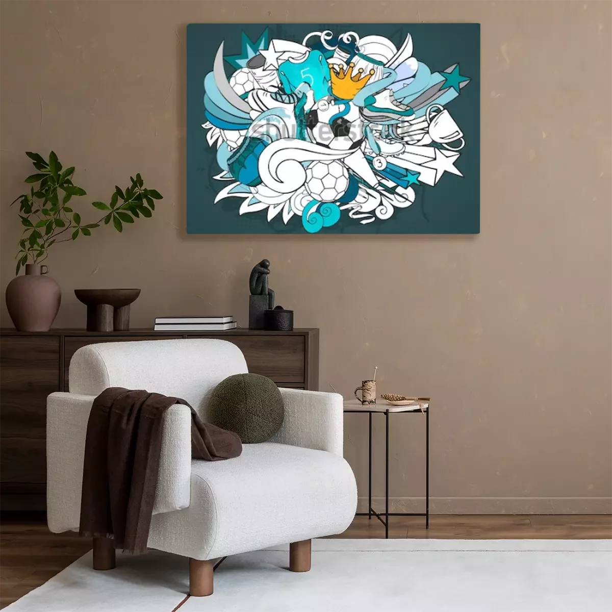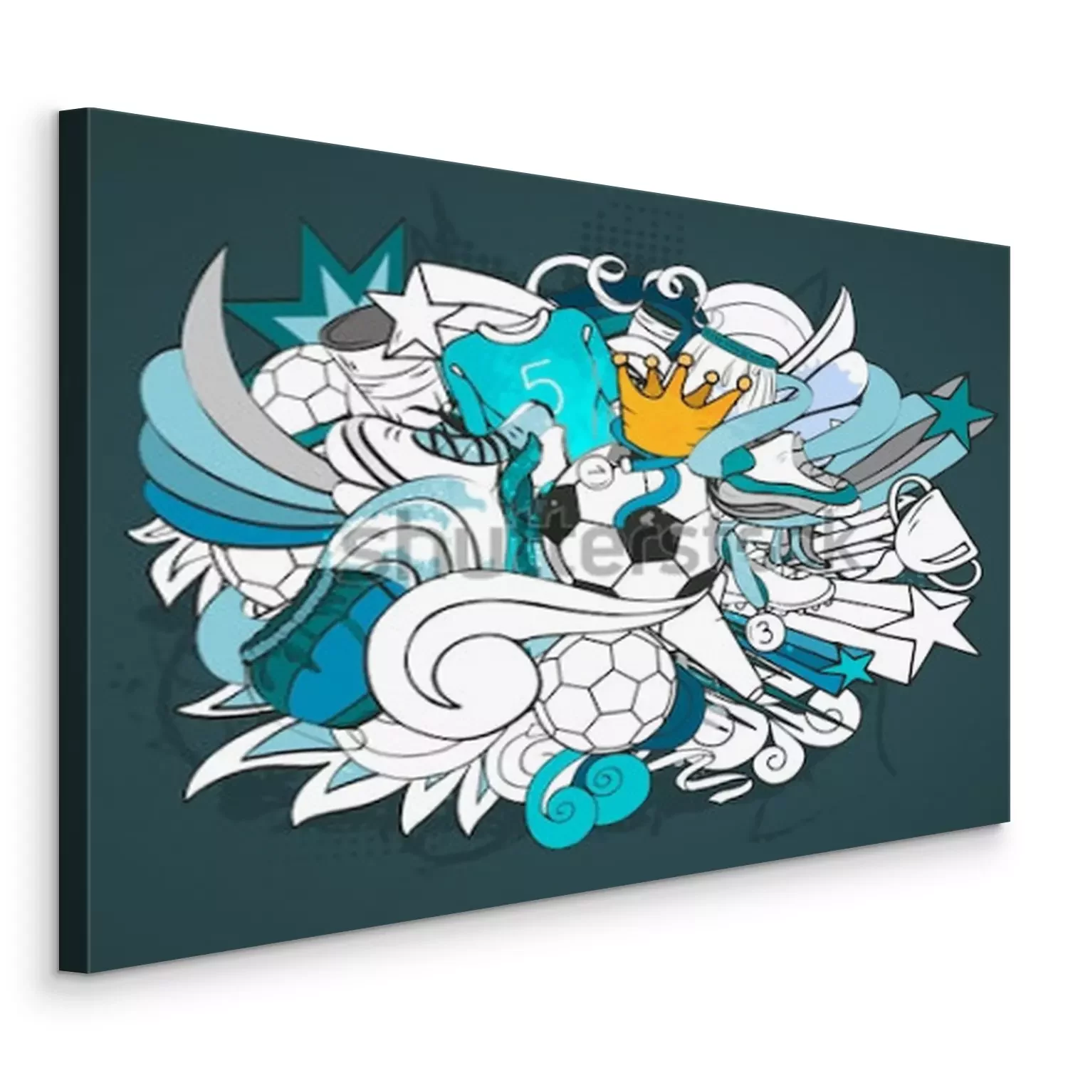 Canvas Outline vector football banner with ball, soccer objects and decoration elements in white and blue colors on navy background