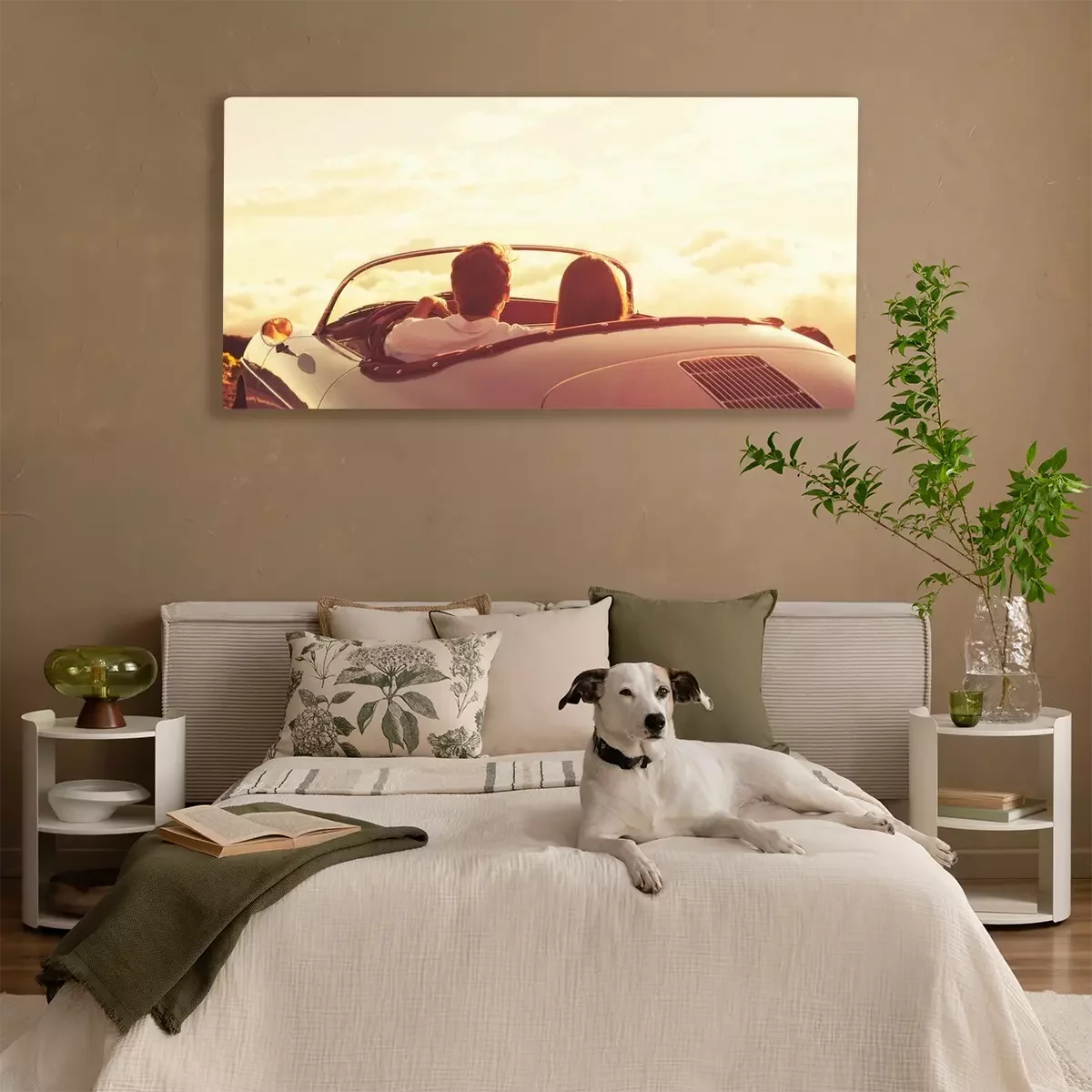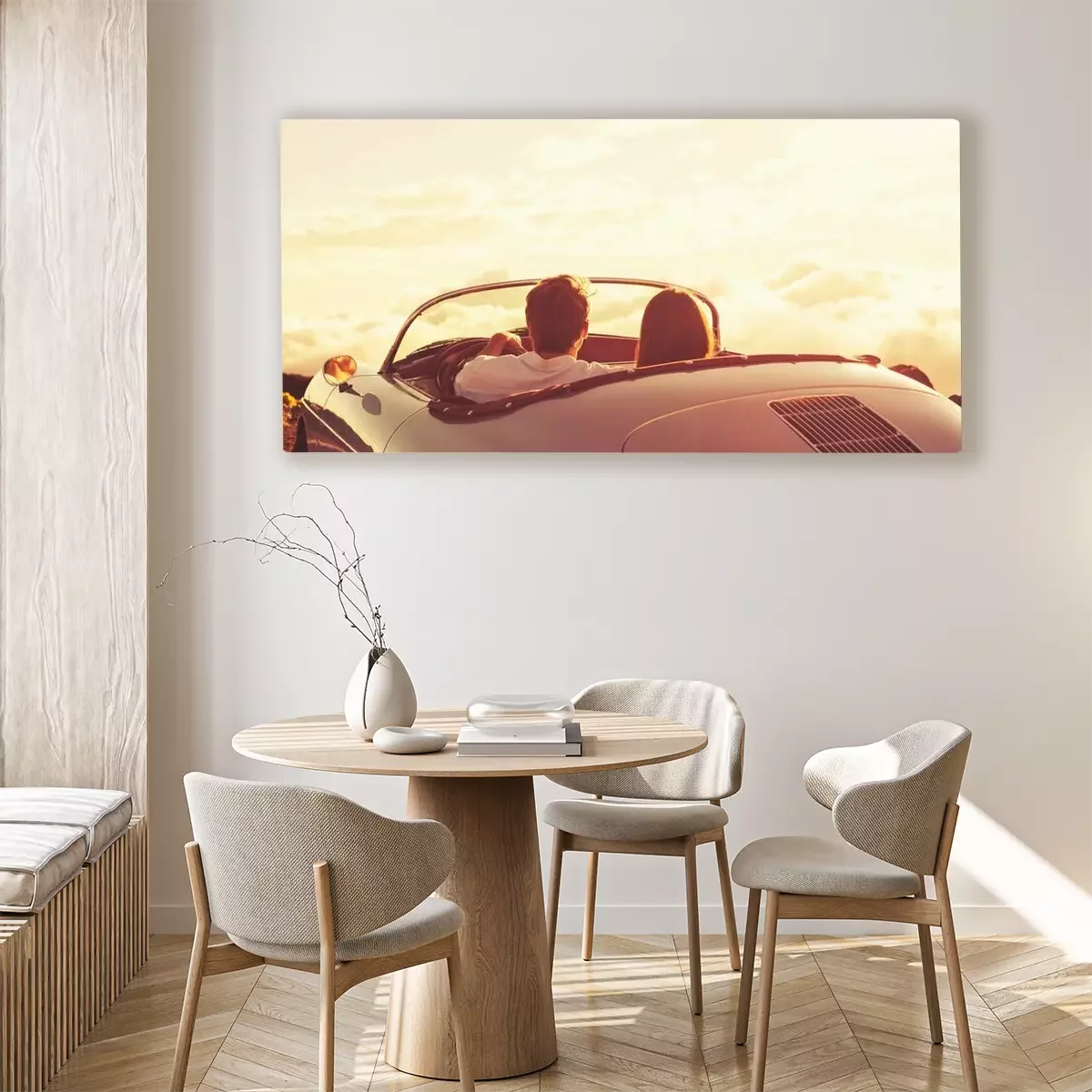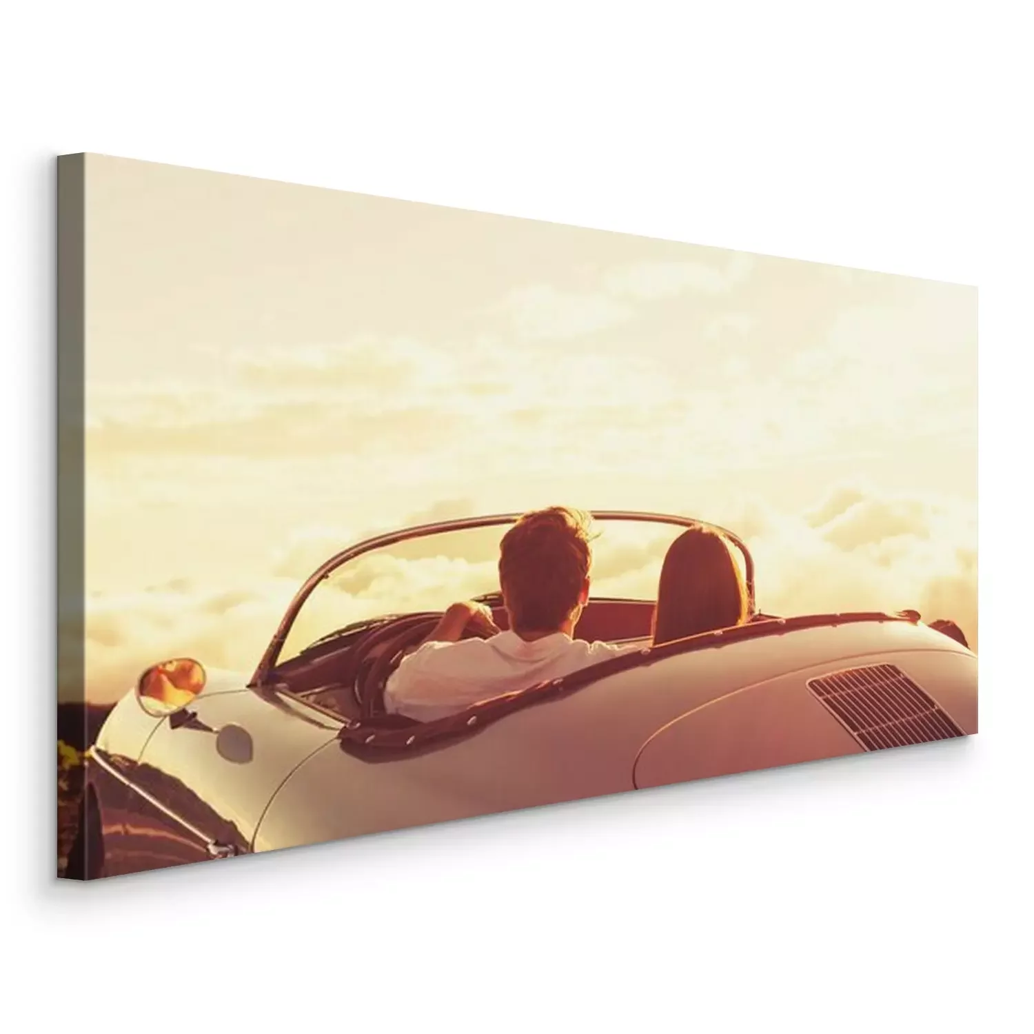 Canvas: Paar kijken naar de zonsondergang in de Classic Vintage Car