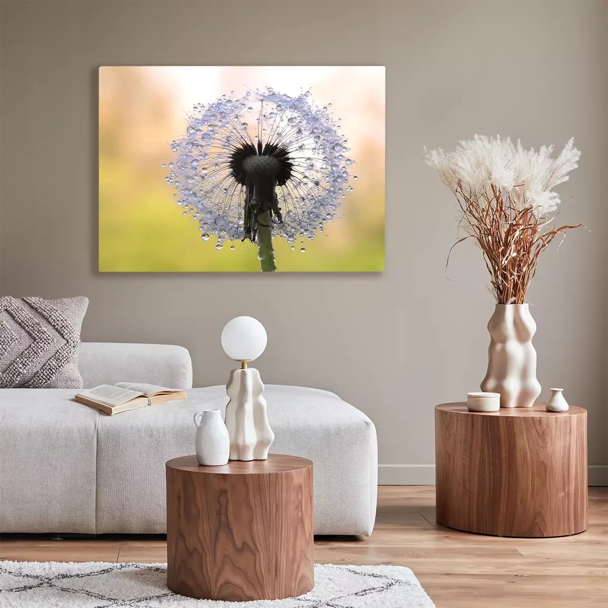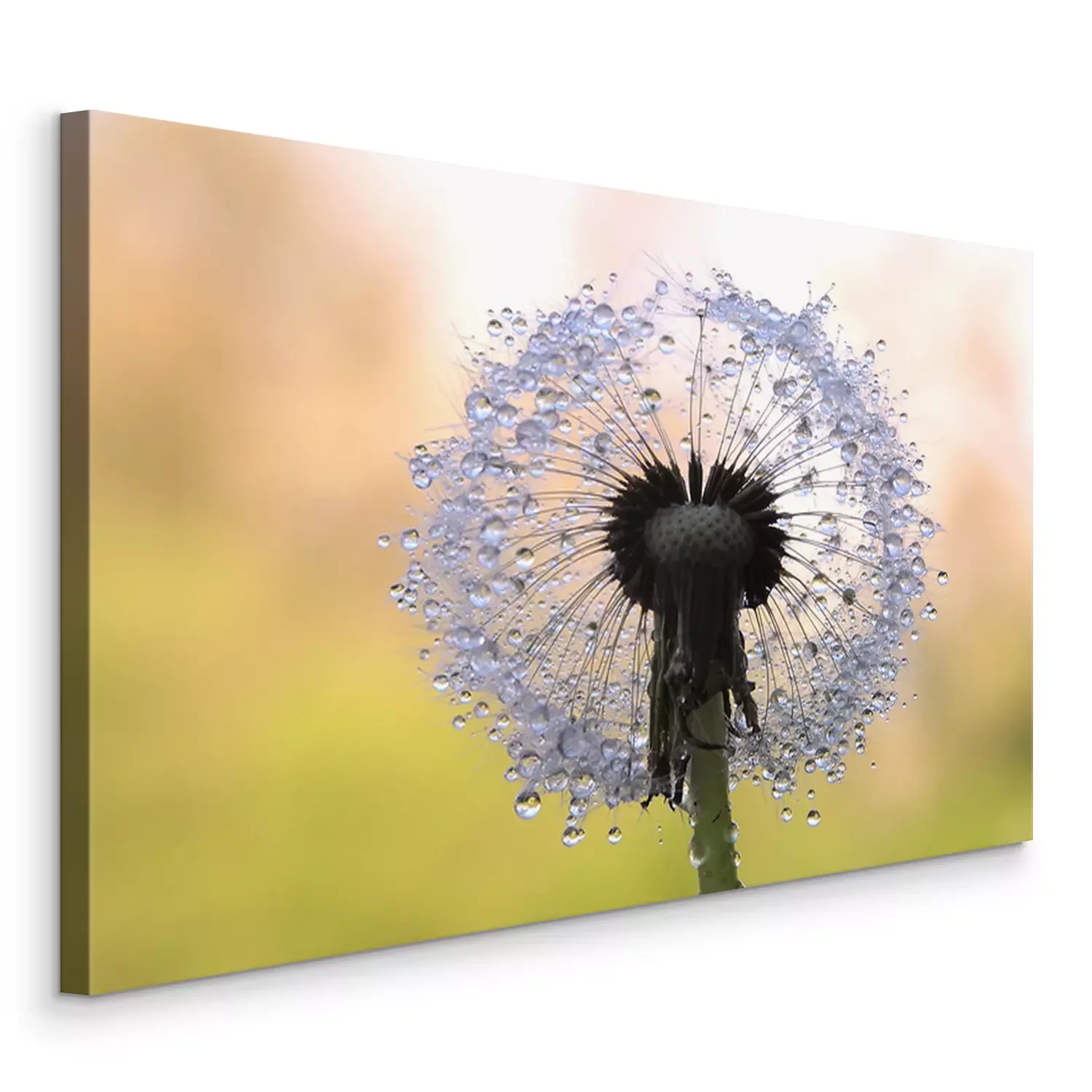 De pluisjes van een paardenbloem zijn bedekt met dauw