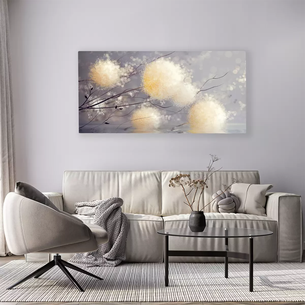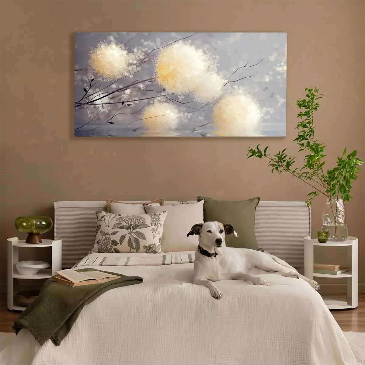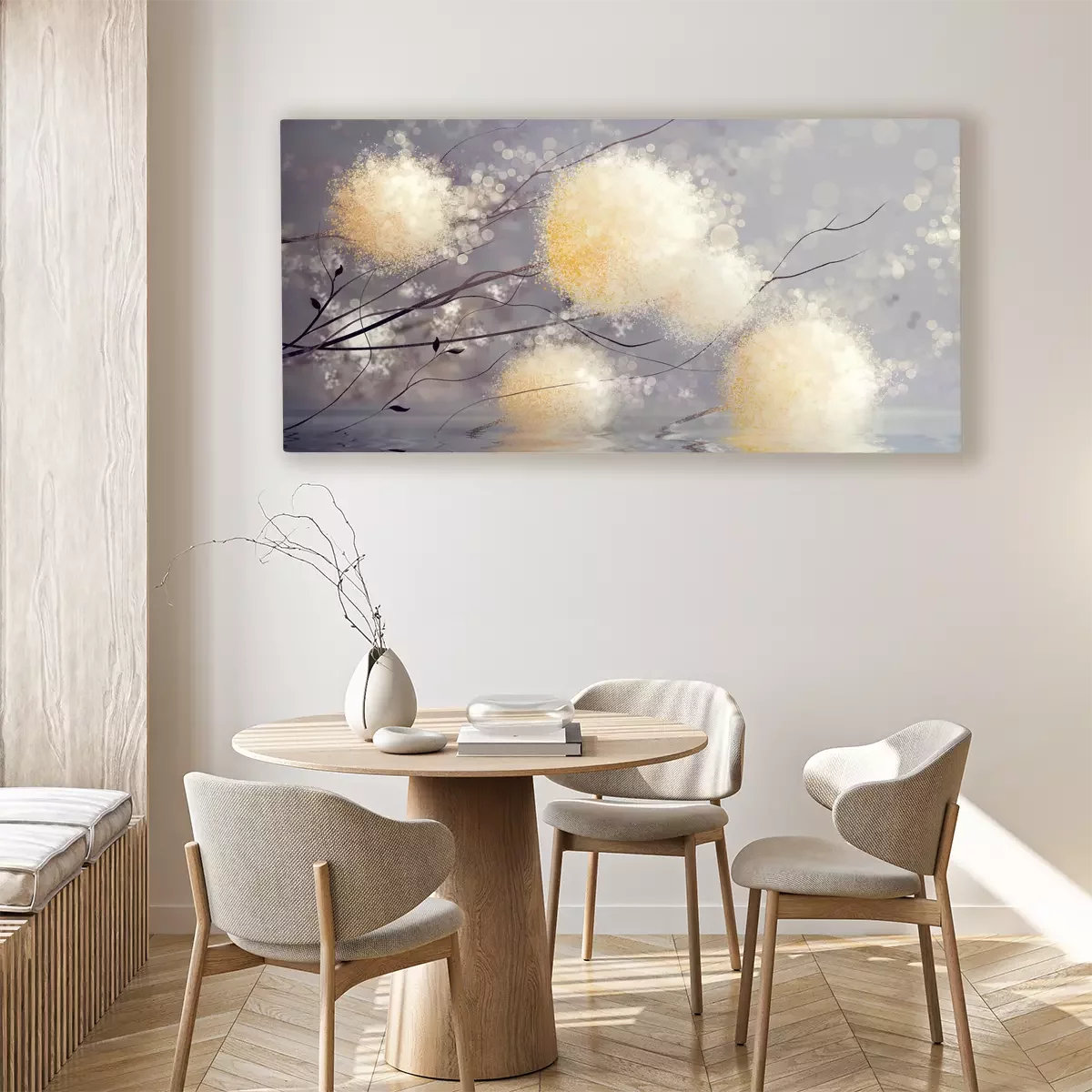 Paardenbloemen in een gouden gloed boven het wateroppervlak