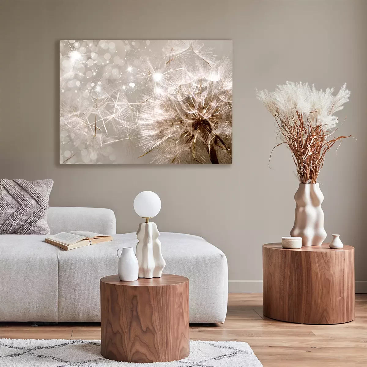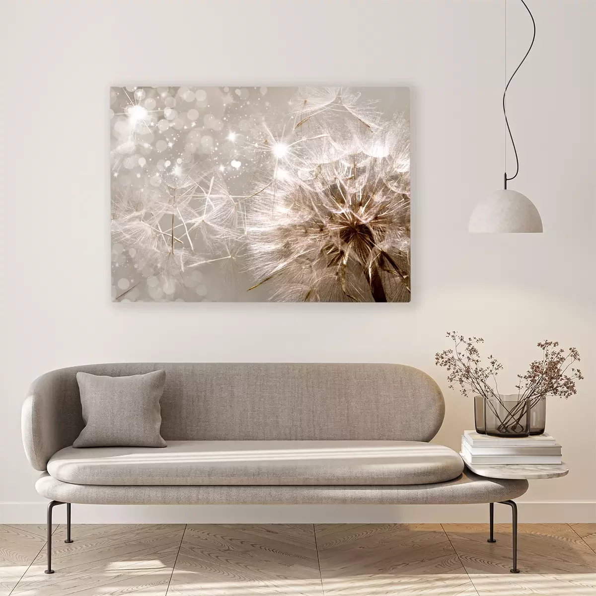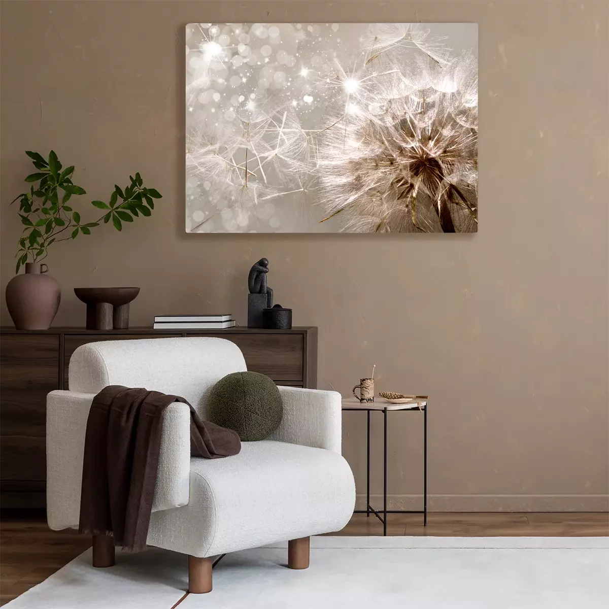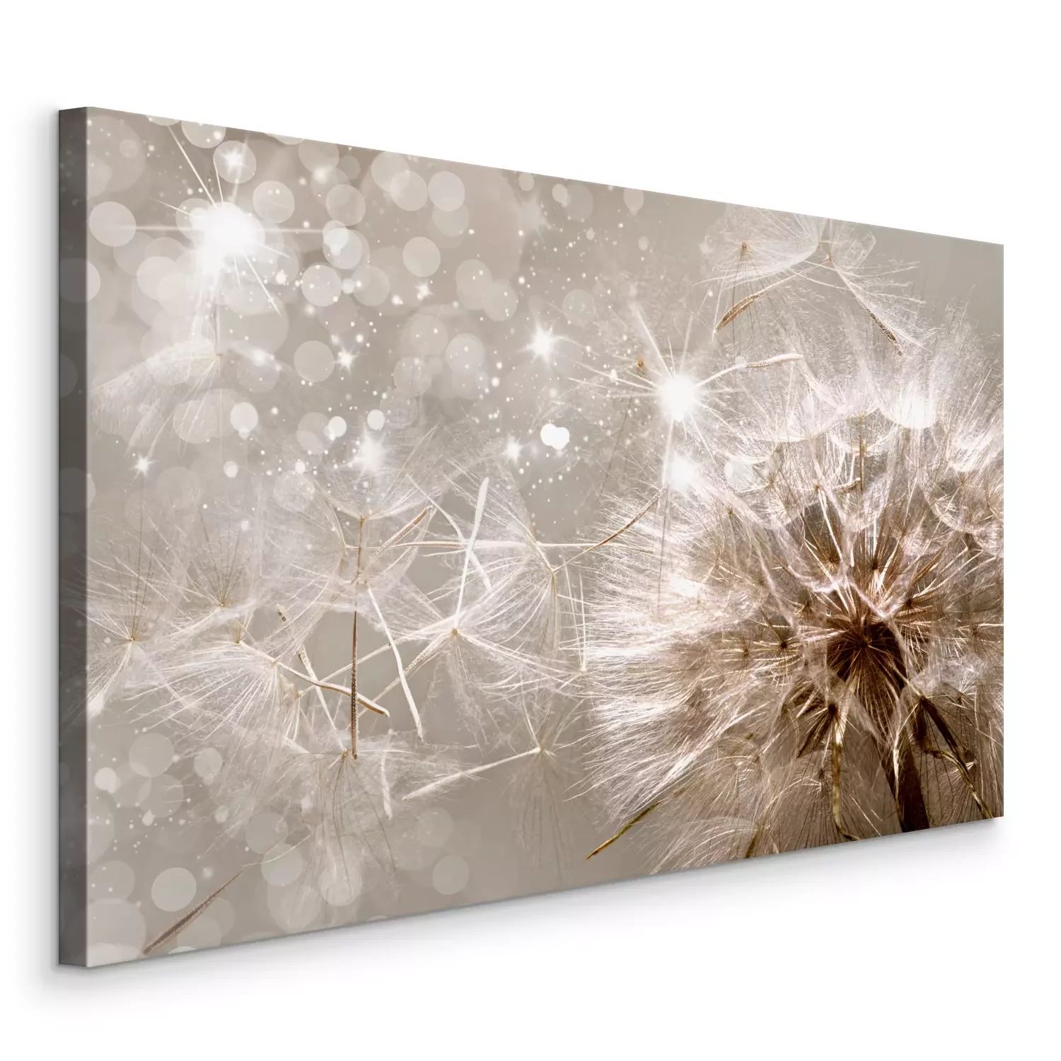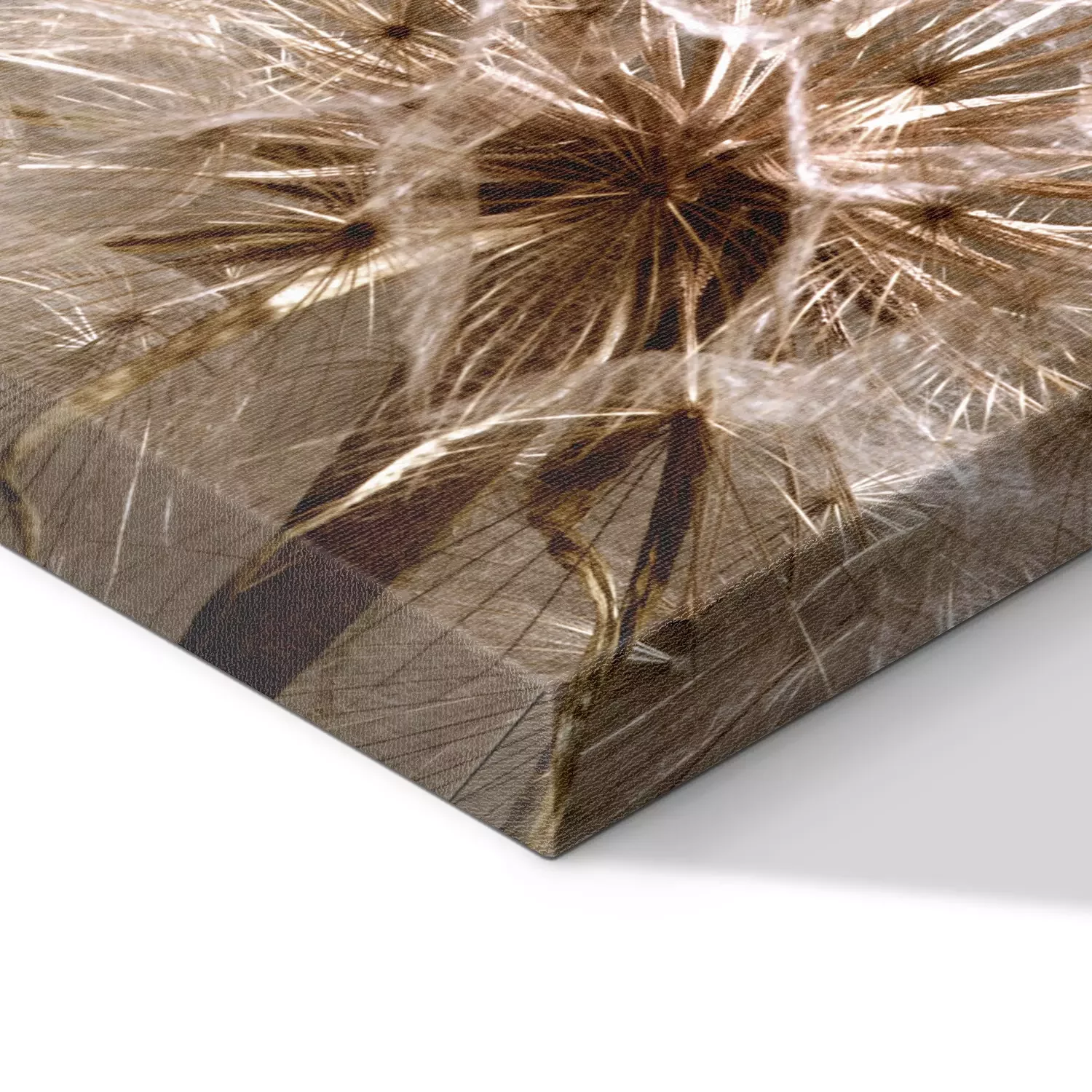 Paardenbloemzaden vliegen weg in de gloed en het licht