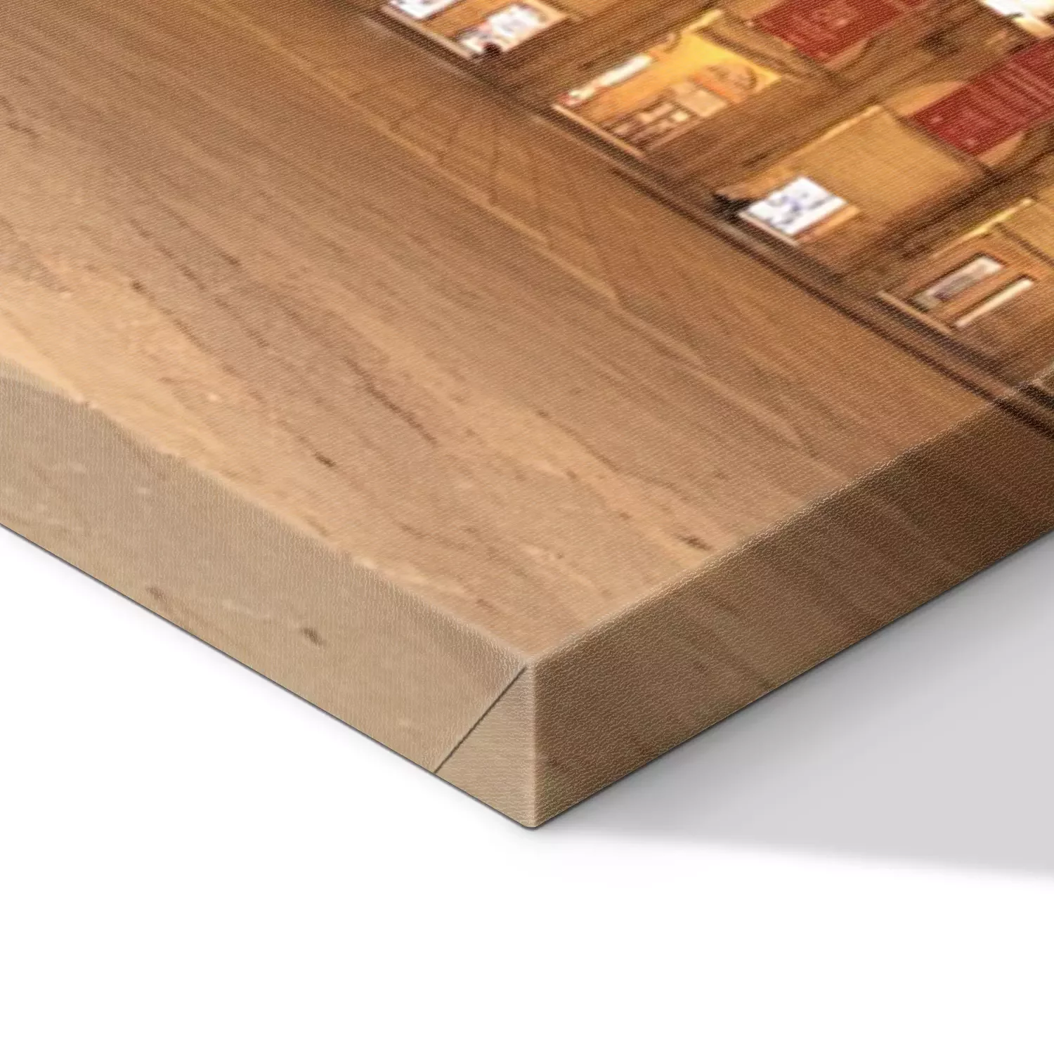De print wordt aangebracht op hoogwaardig canvas dat op een schildersweefgetouw (spieraam) wordt gespannen. Omdat de print de zijranden bedekt, hoeft het ontwerp niet met een extra kader te worden omlijst. Wij raden ook composities aan die uit meerdere foto's bestaan en zo een coherente compositie vormen.