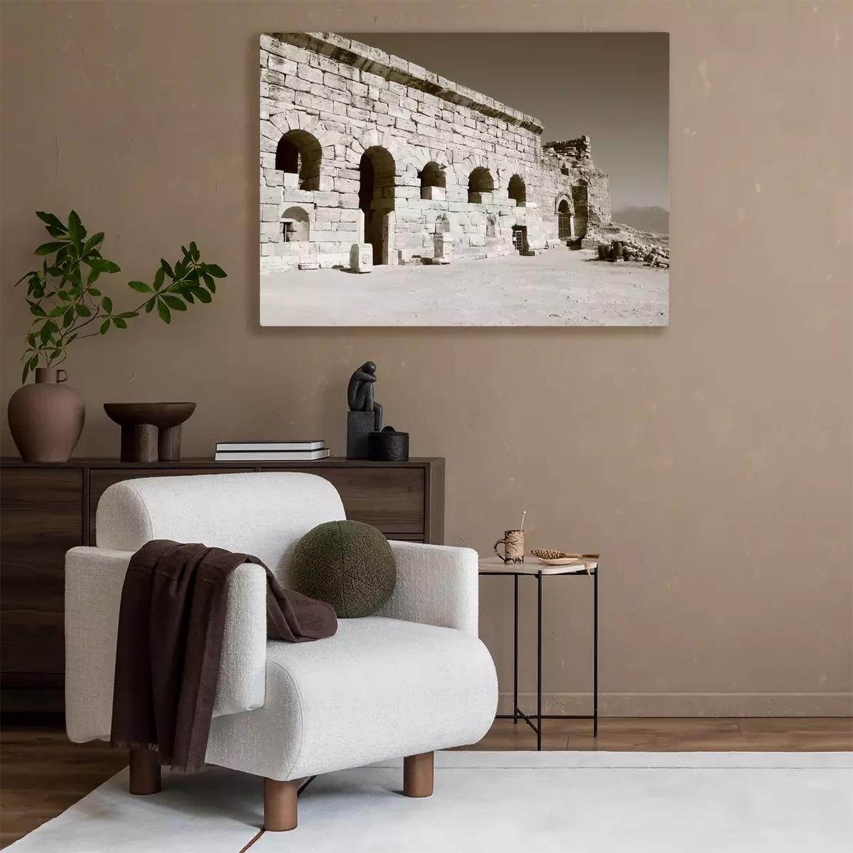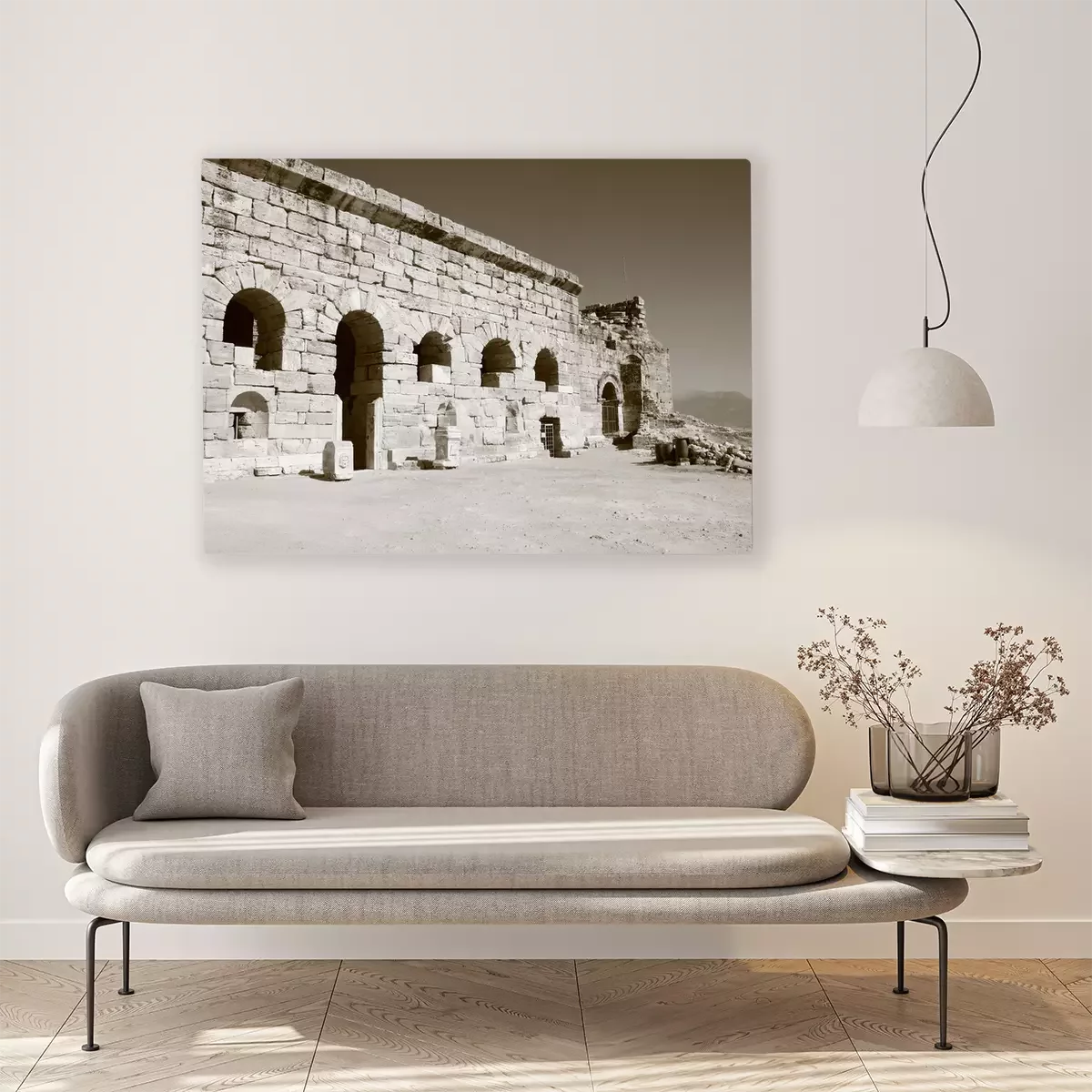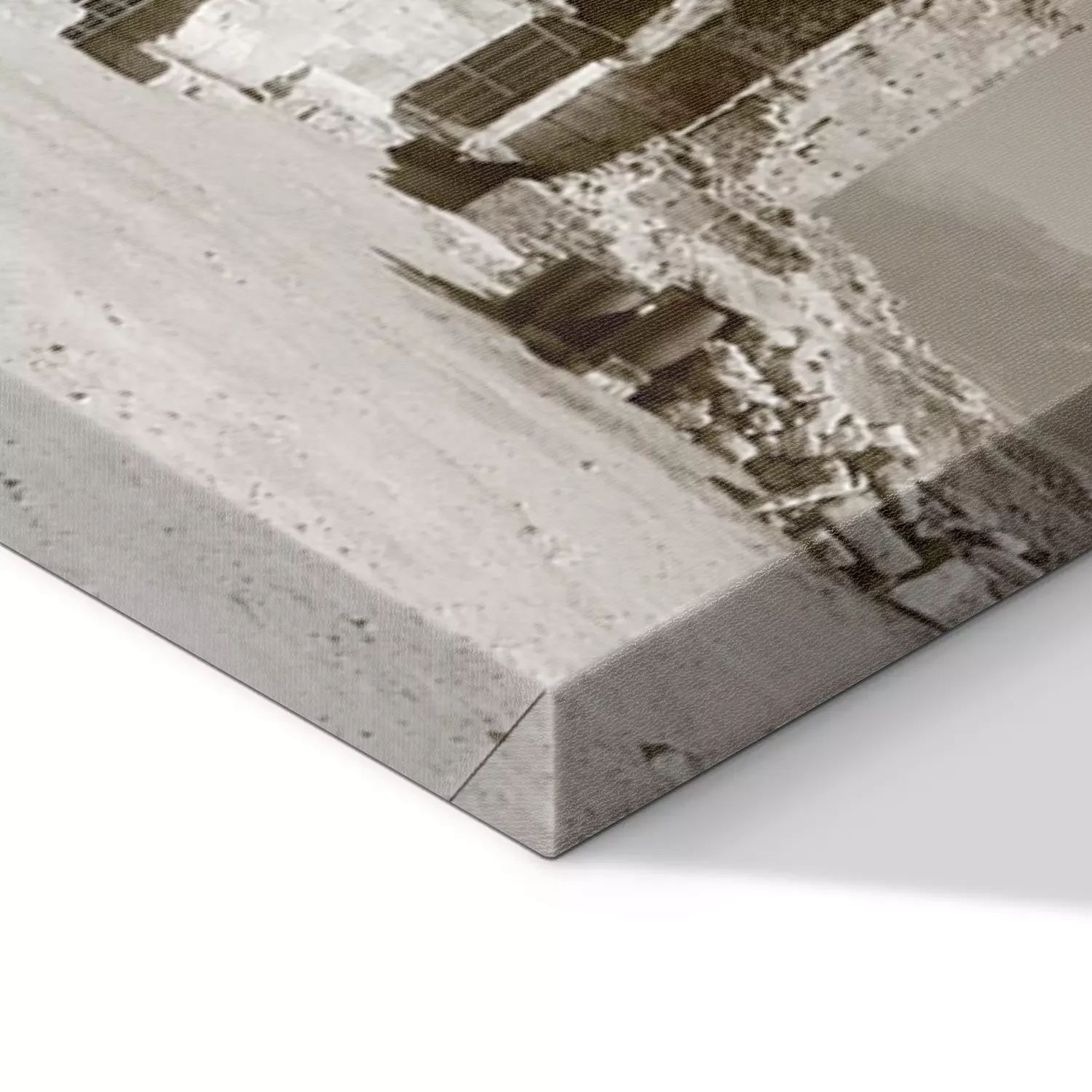 De print wordt aangebracht op hoogwaardig canvas dat op een schildersweefgetouw (spieraam) wordt gespannen. Omdat de print de zijranden bedekt, hoeft het ontwerp niet met een extra kader te worden omlijst. Wij raden ook composities aan die uit meerdere foto's bestaan en zo een coherente compositie vormen.