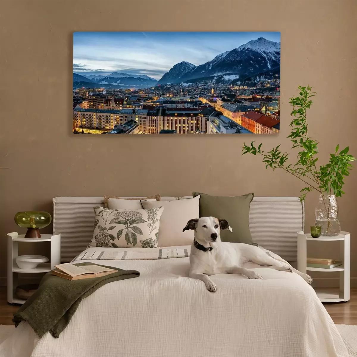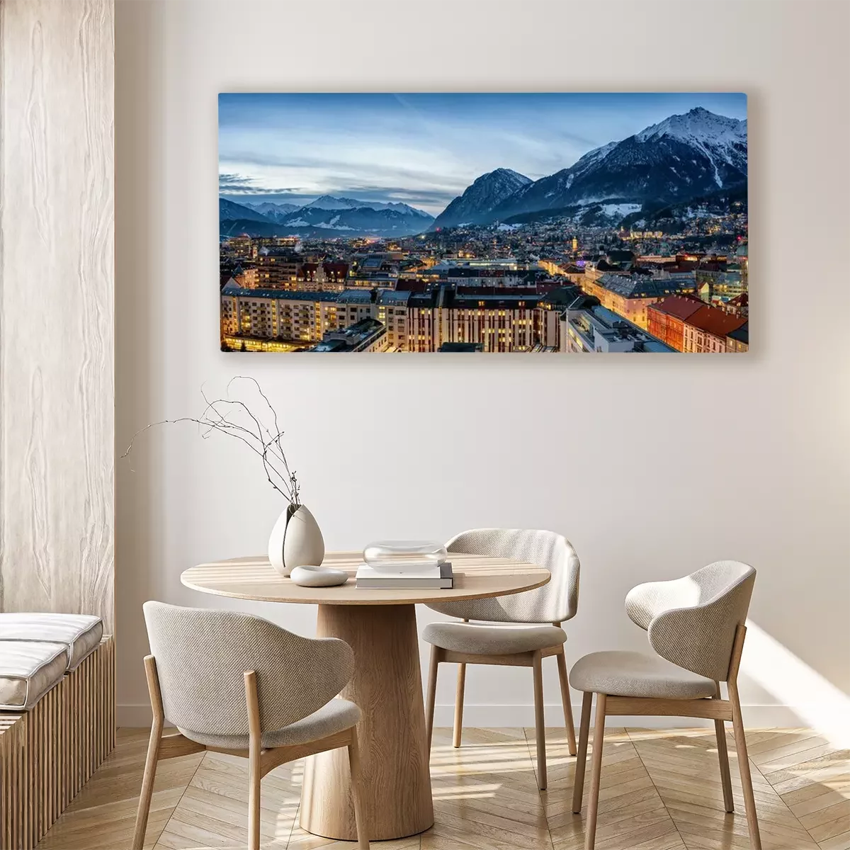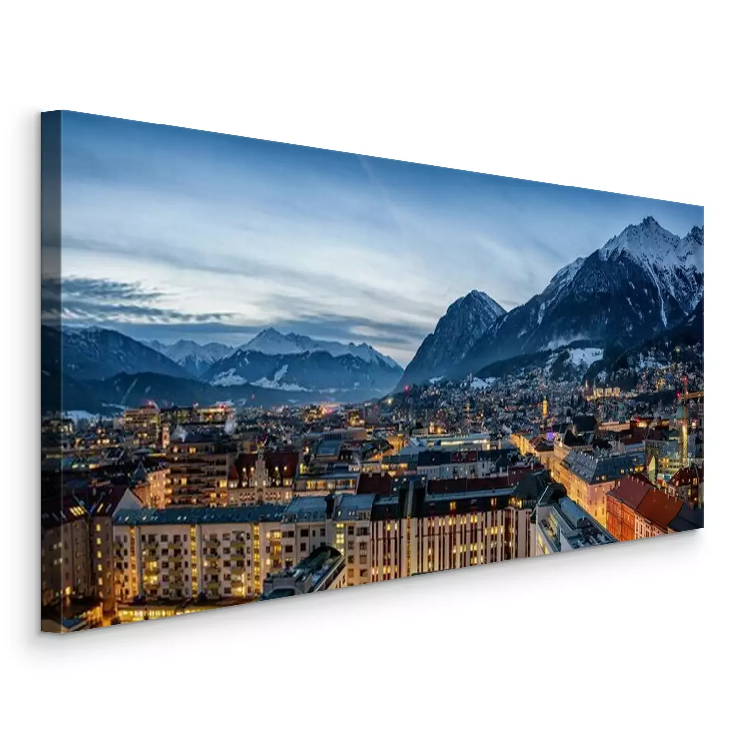 Canvas Panorama der Skyline von Innsbruck, Alpen, Österreich, im Winter am Abend mit schneebedeckten Bergen im Hintergrund