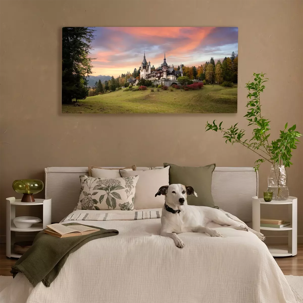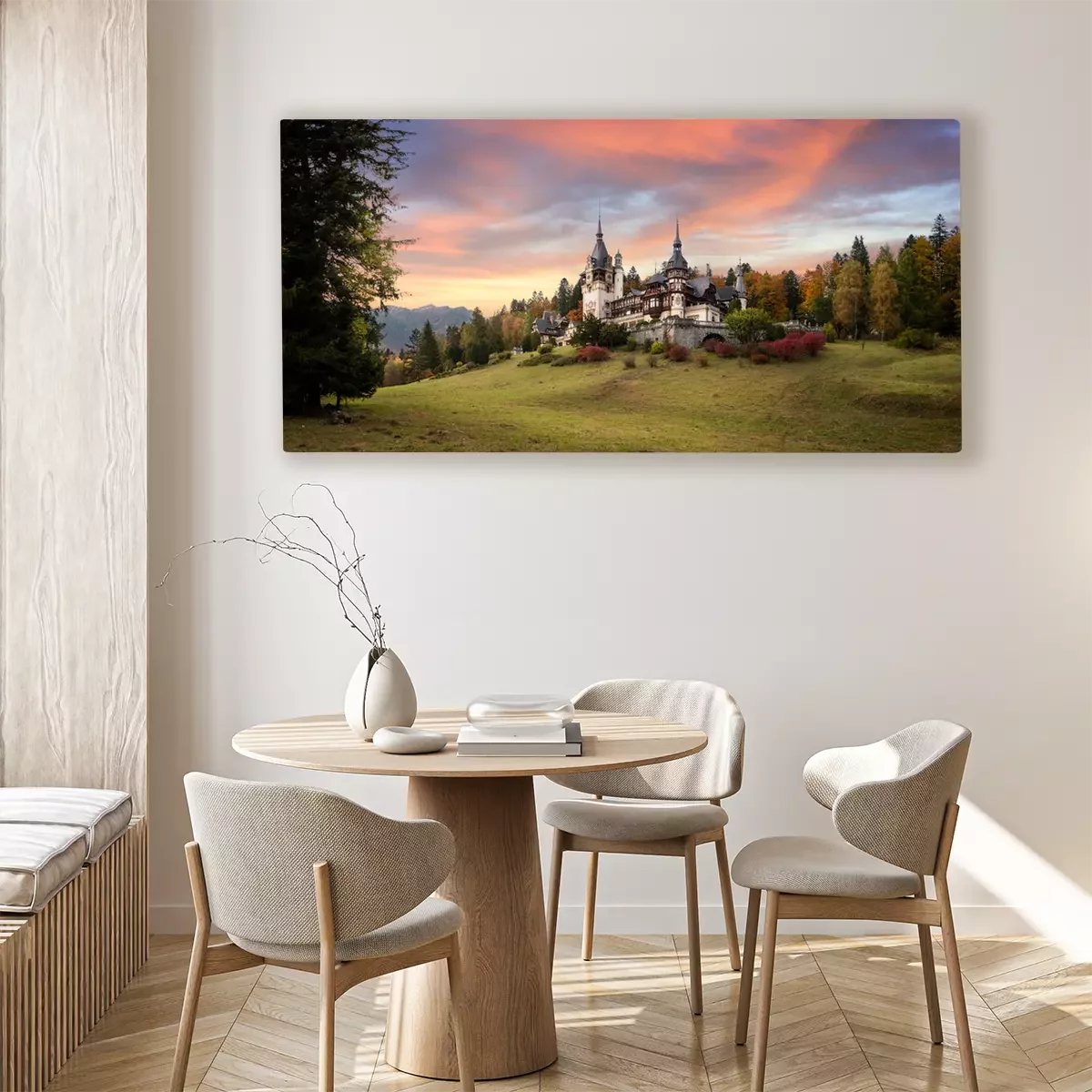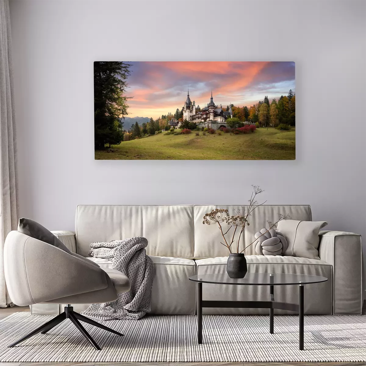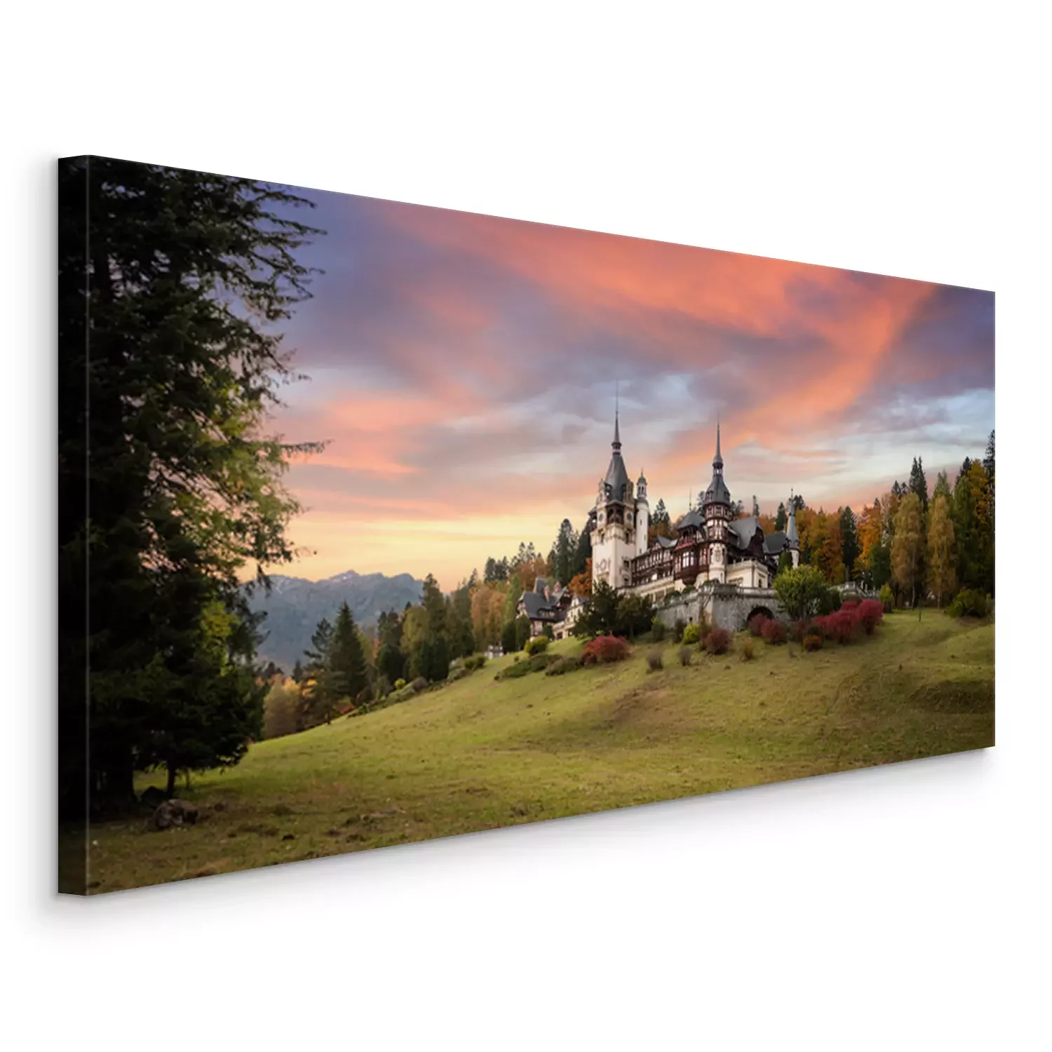 Canvas Panorama of Peles Castle, Romania. Beautiful famous royal castle and ornamental garden in Sinaia landmark of Carpathian Mountains in Europe at sunset. Former Home Of The Romanian Royal Family.