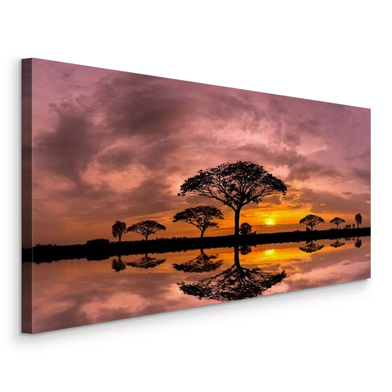 Canvas: Panorama silhouette tree and Mountain with sunset.Tree silhouetted against a setting sun reflection on water.Typical african sunset with acacia trees in Masai Mara, Kenya.