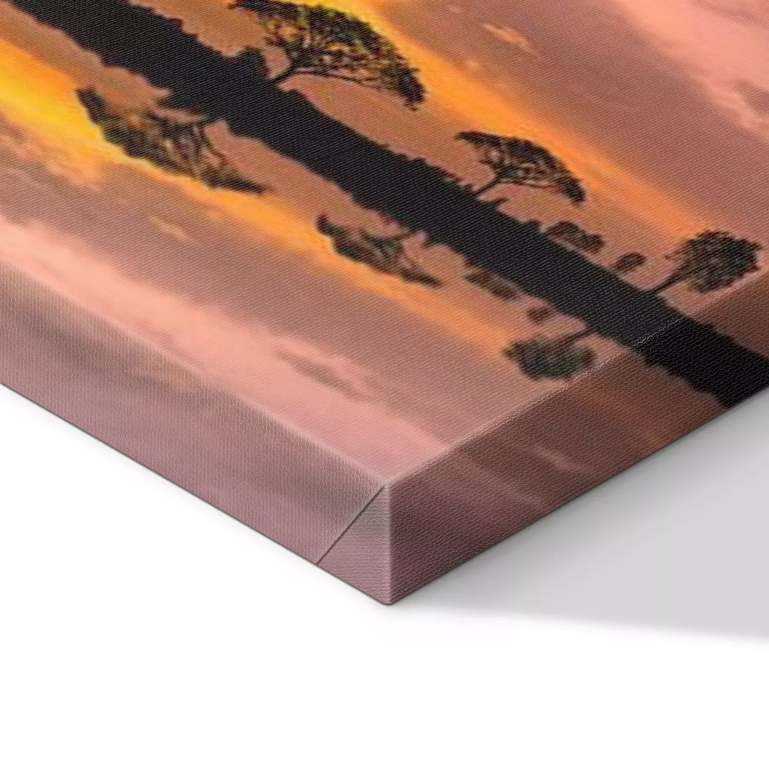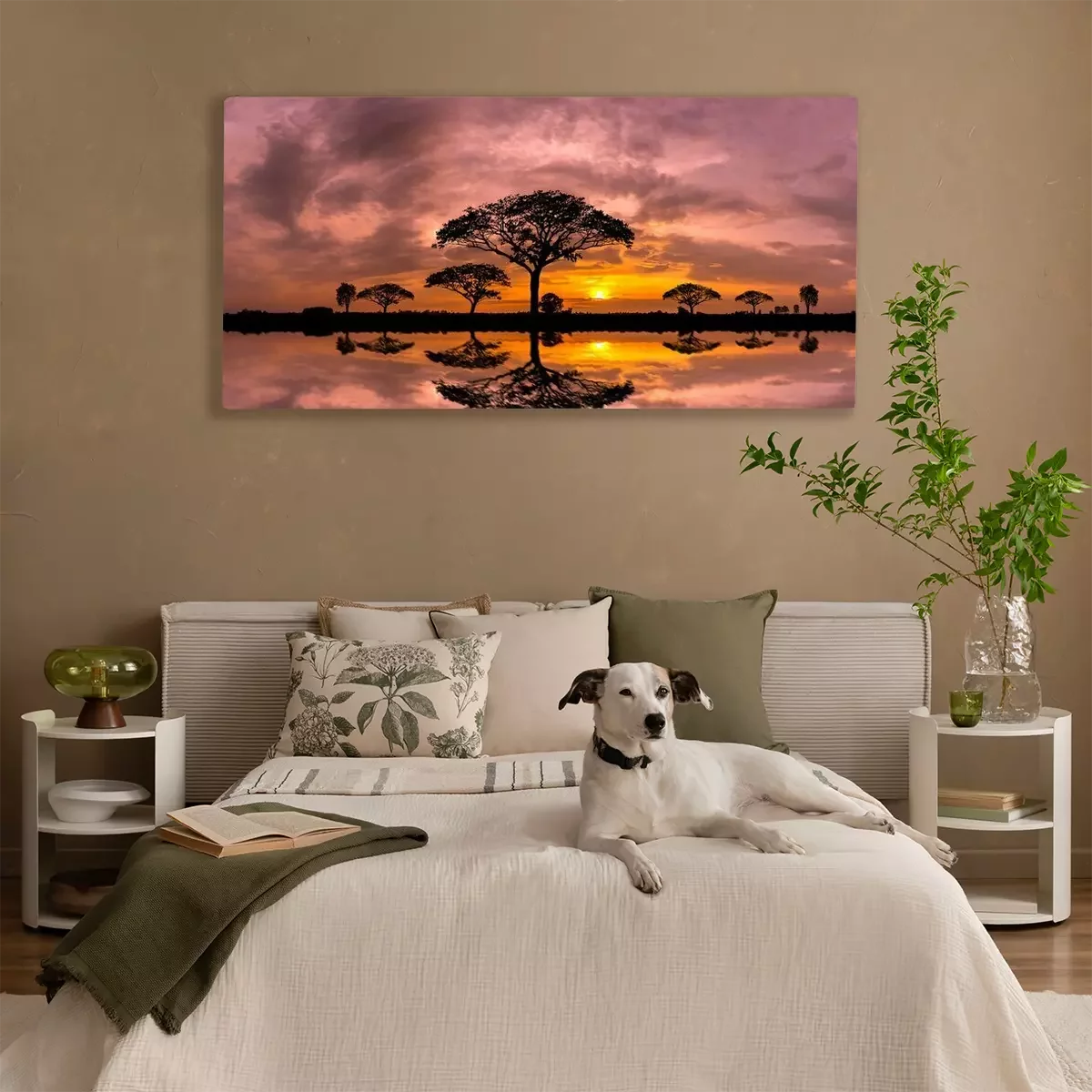 Canvas Panorama silhouette tree and Mountain with sunset.Tree silhouetted against a setting sun reflection on water.Typical african sunset with acacia trees in Masai Mara, Kenya.