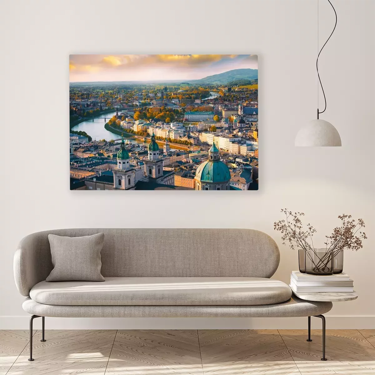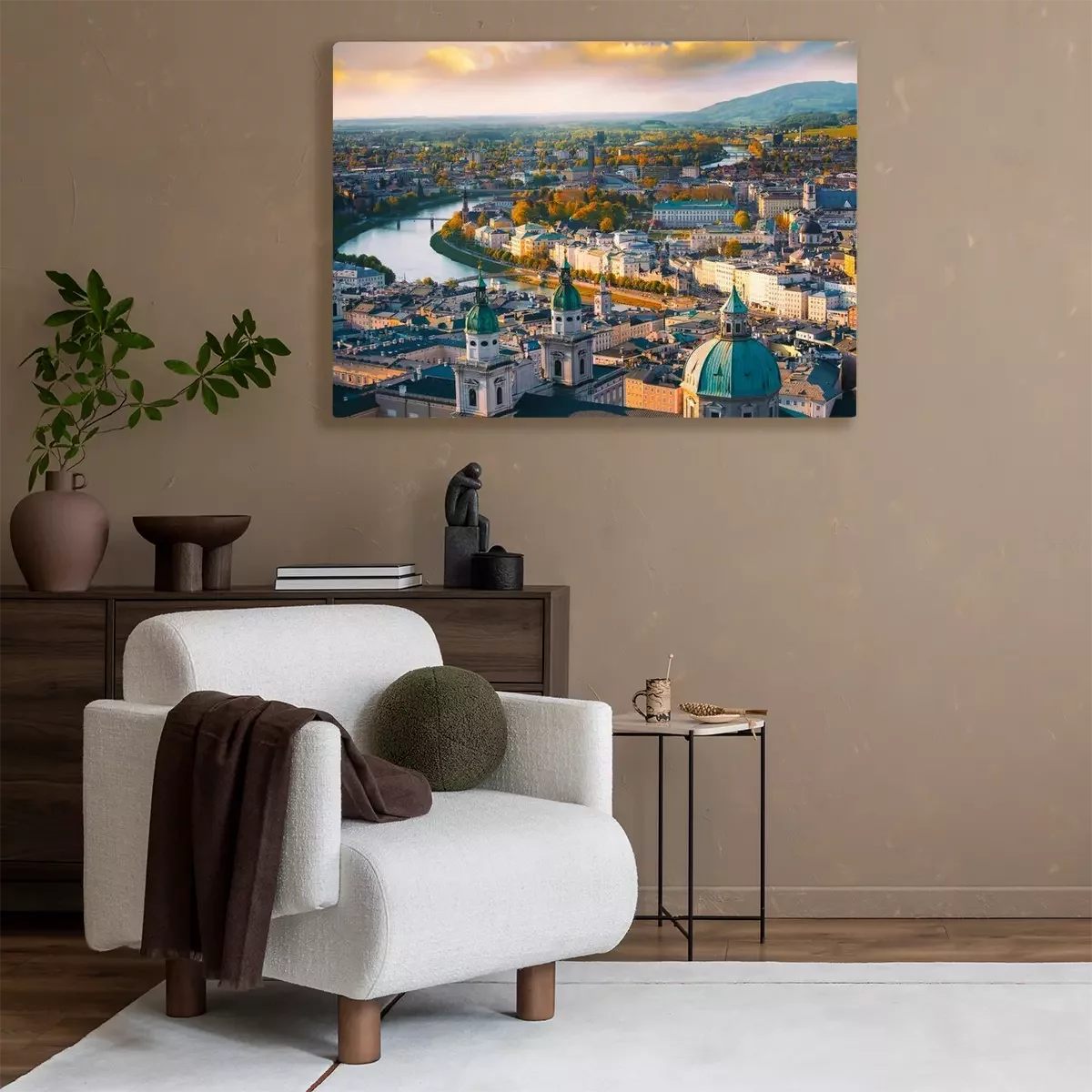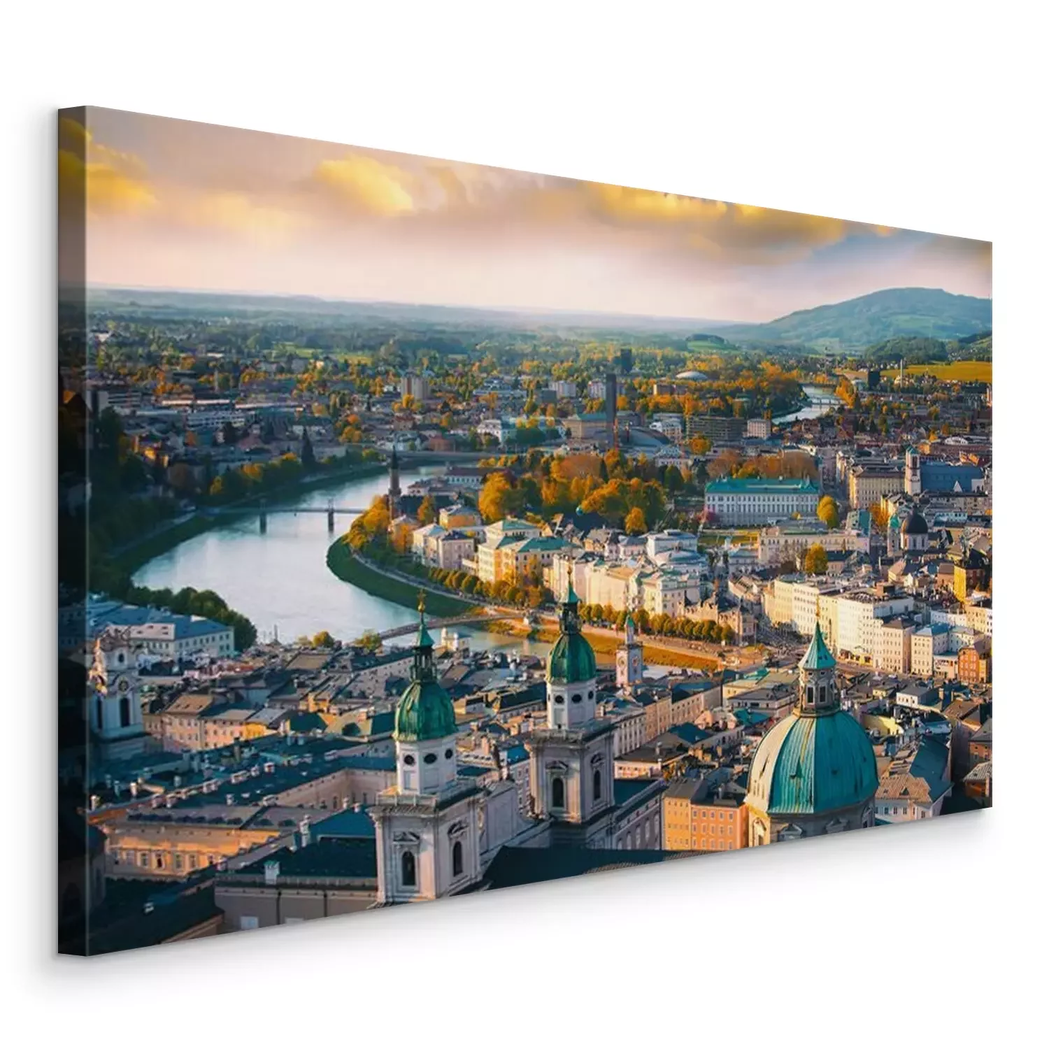 Canvas: Panorama uitzicht over de stad Salzburg met de rivier de Salzach