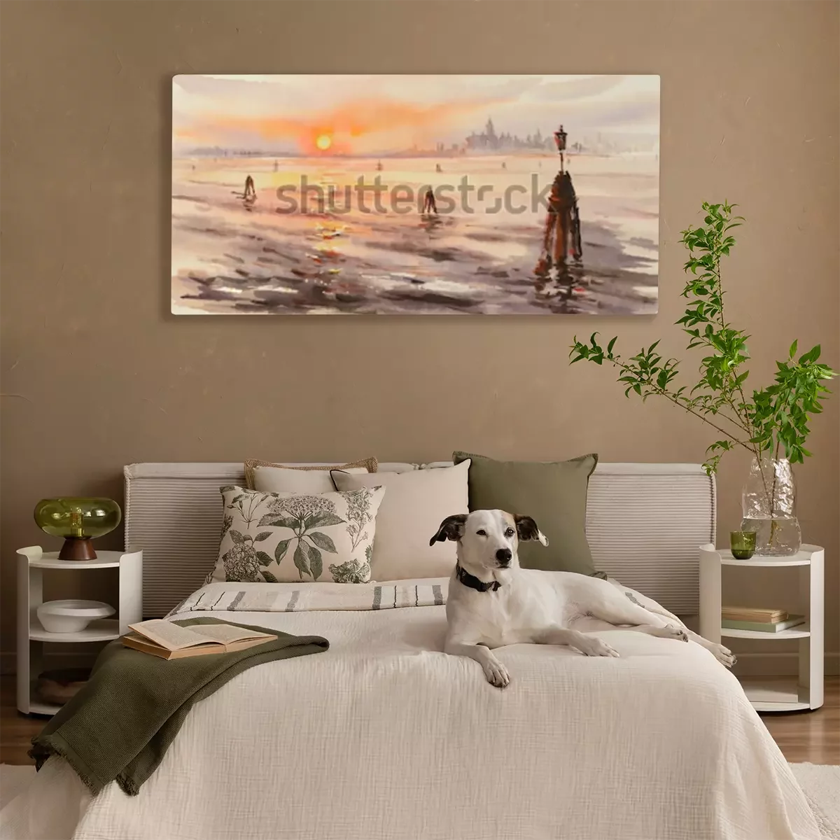 Canvas Panorama van de laguna van Venetië bij zonsondergang. Afbeelding gemaakt met aquarellen.