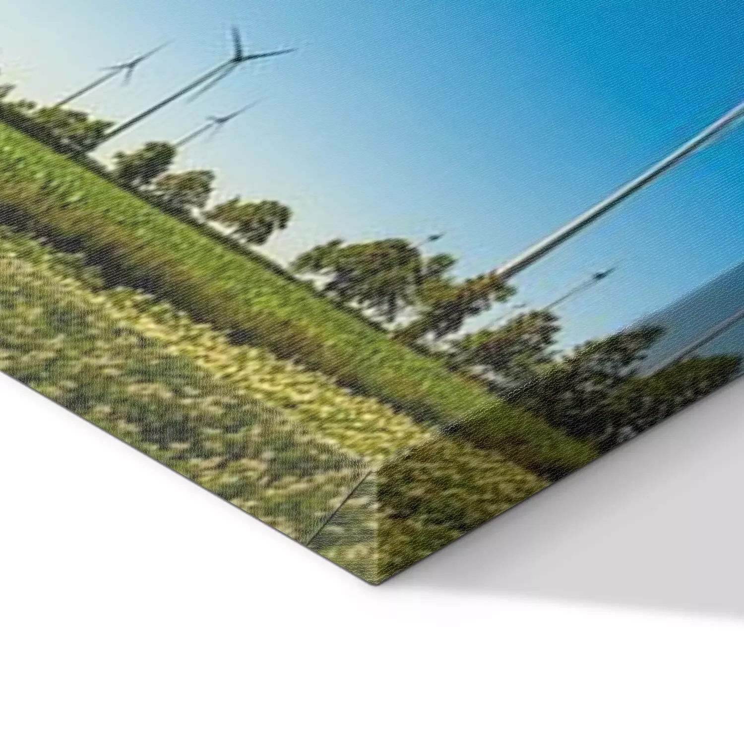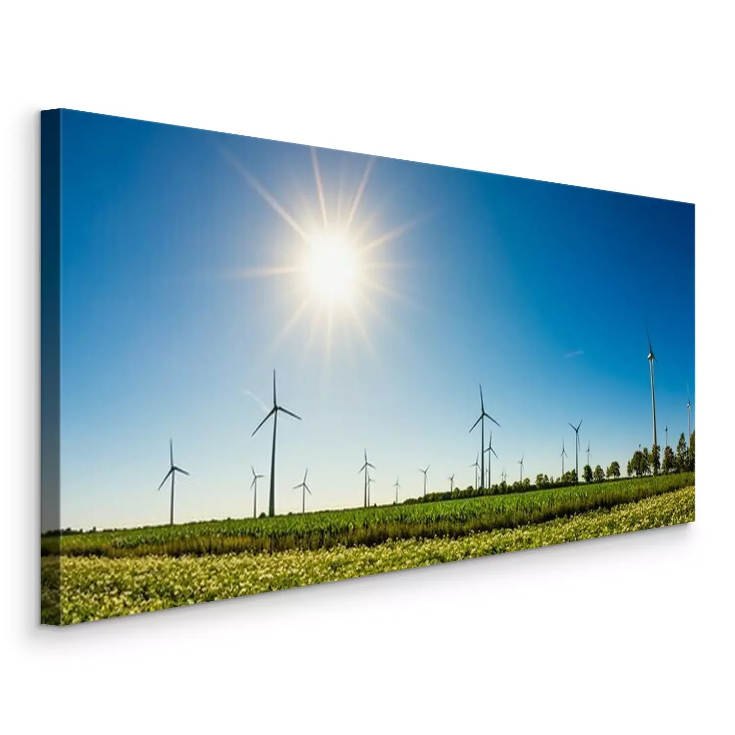 Canvas: Panorama van een zomer landschap met veel windturbines, groene velden en felle zon
