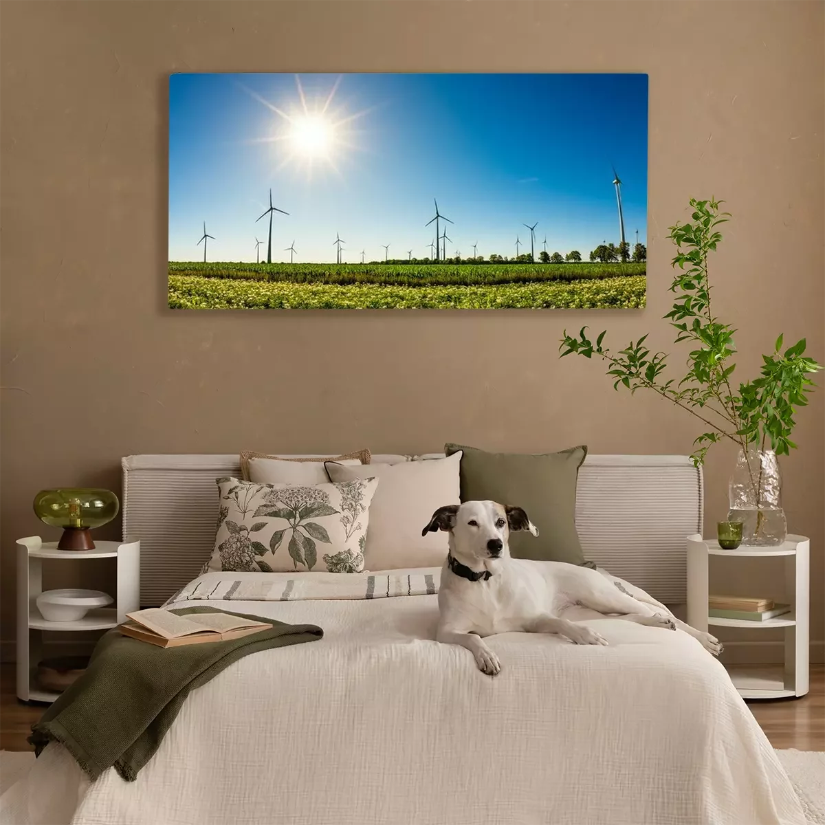Canvas Panorama van een zomer landschap met veel windturbines, groene velden en felle zon