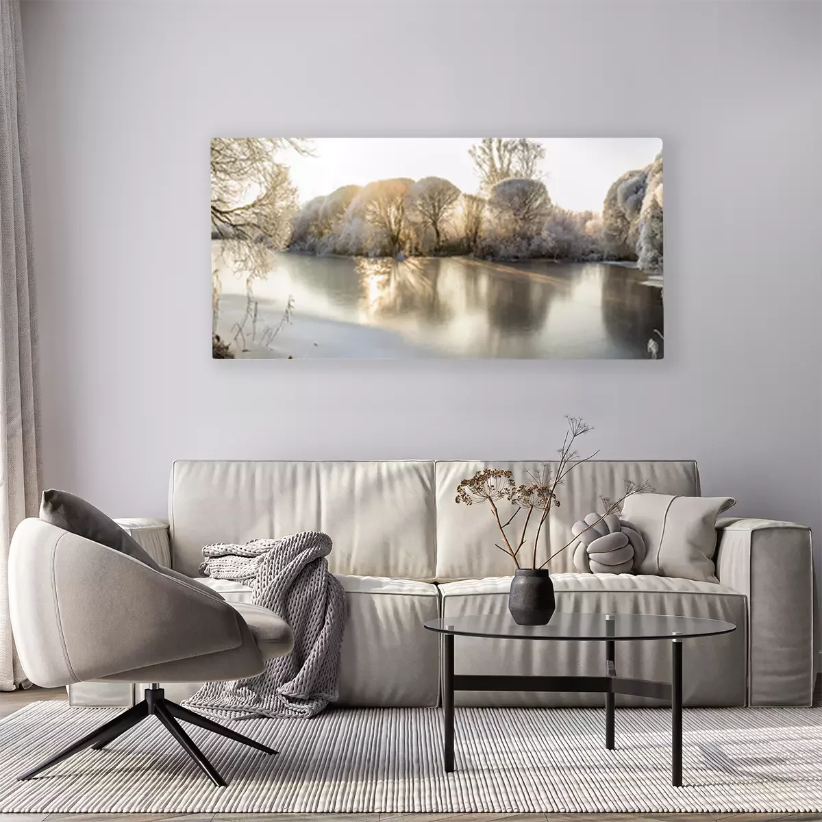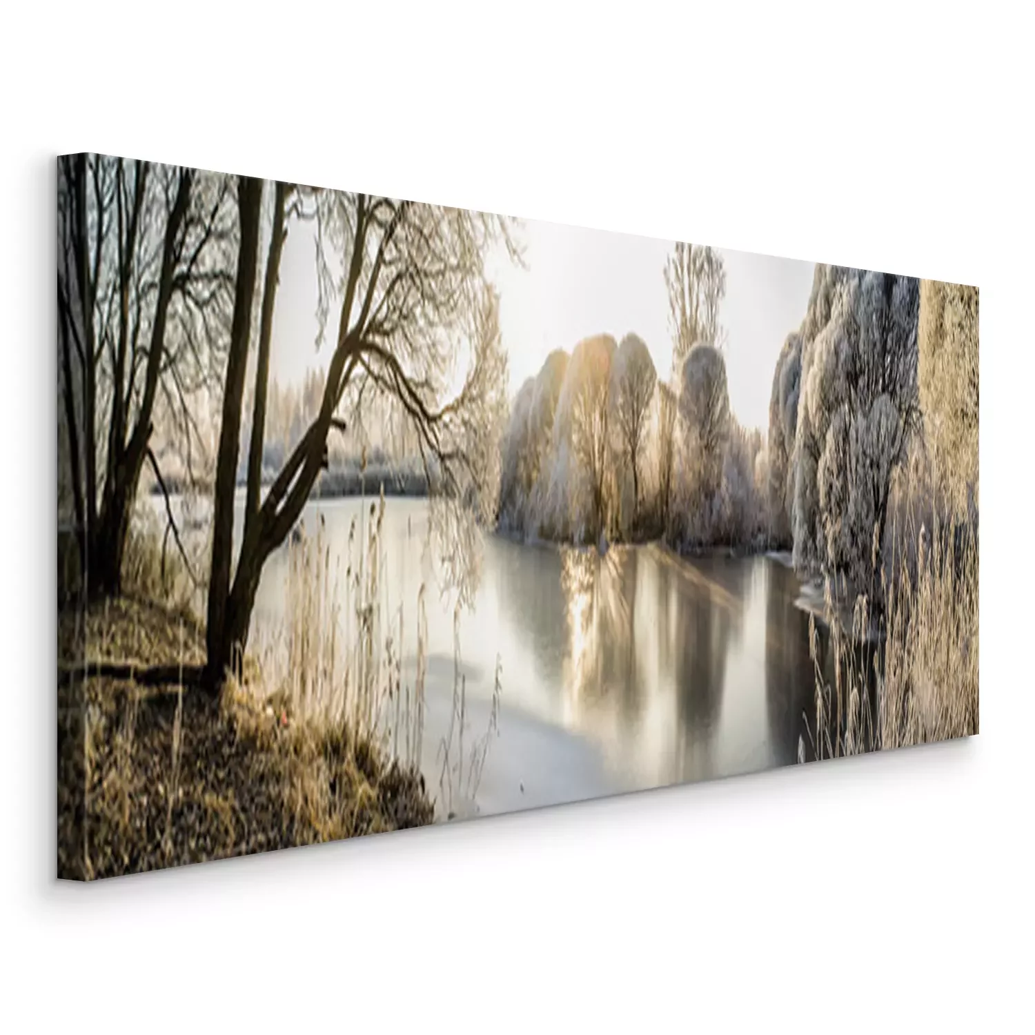 Canvas: Panorama van het bevroren meer en besneeuwde bomen