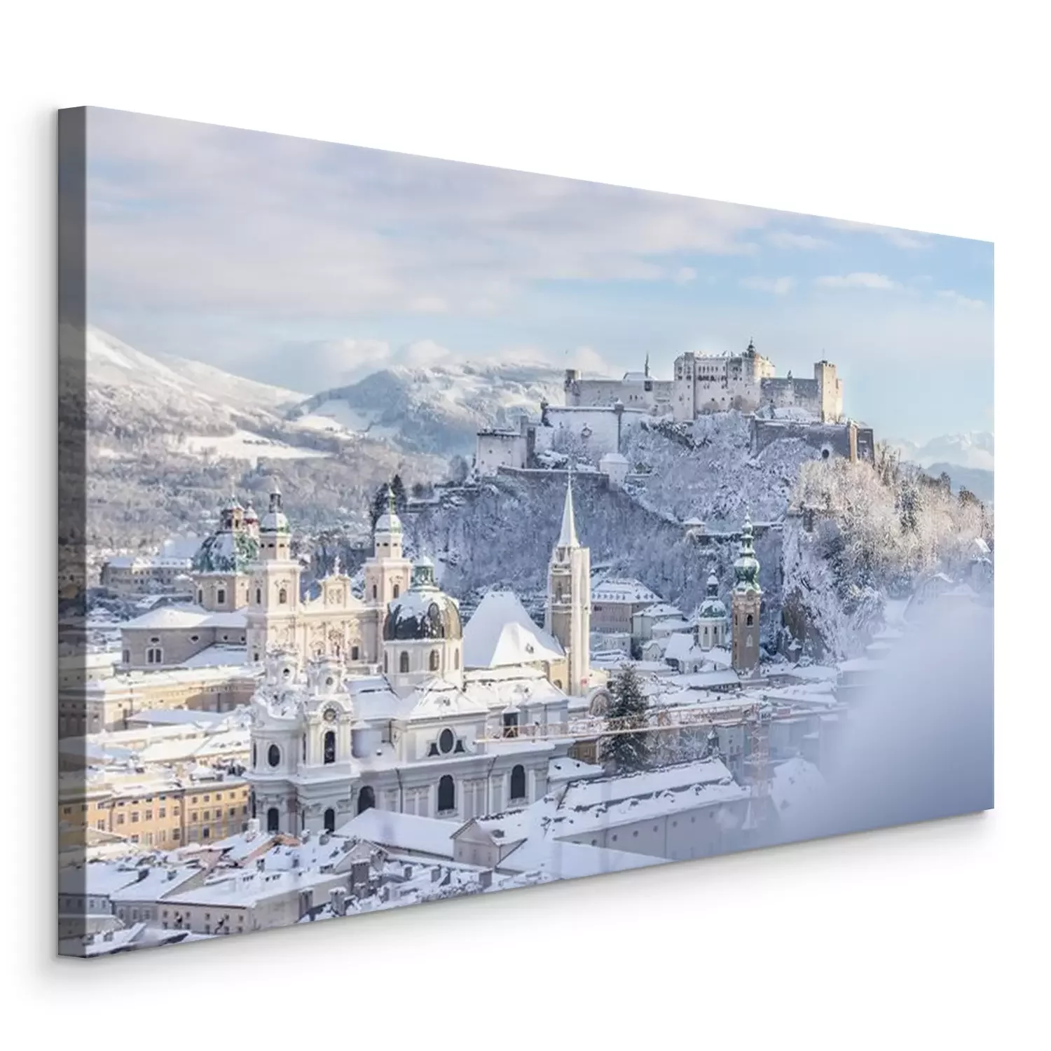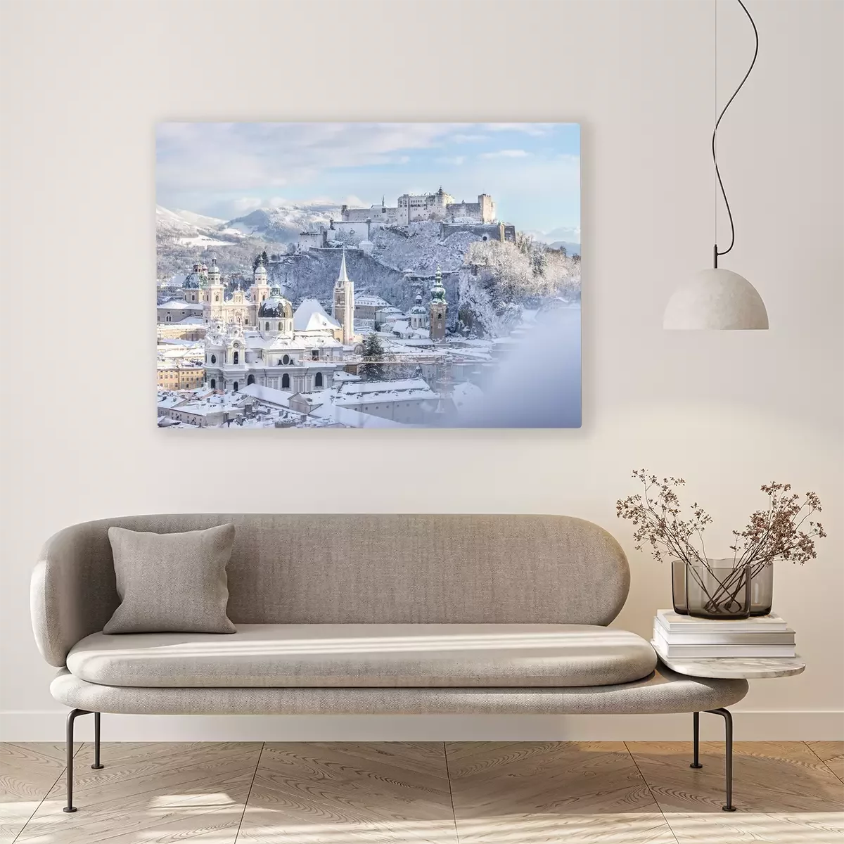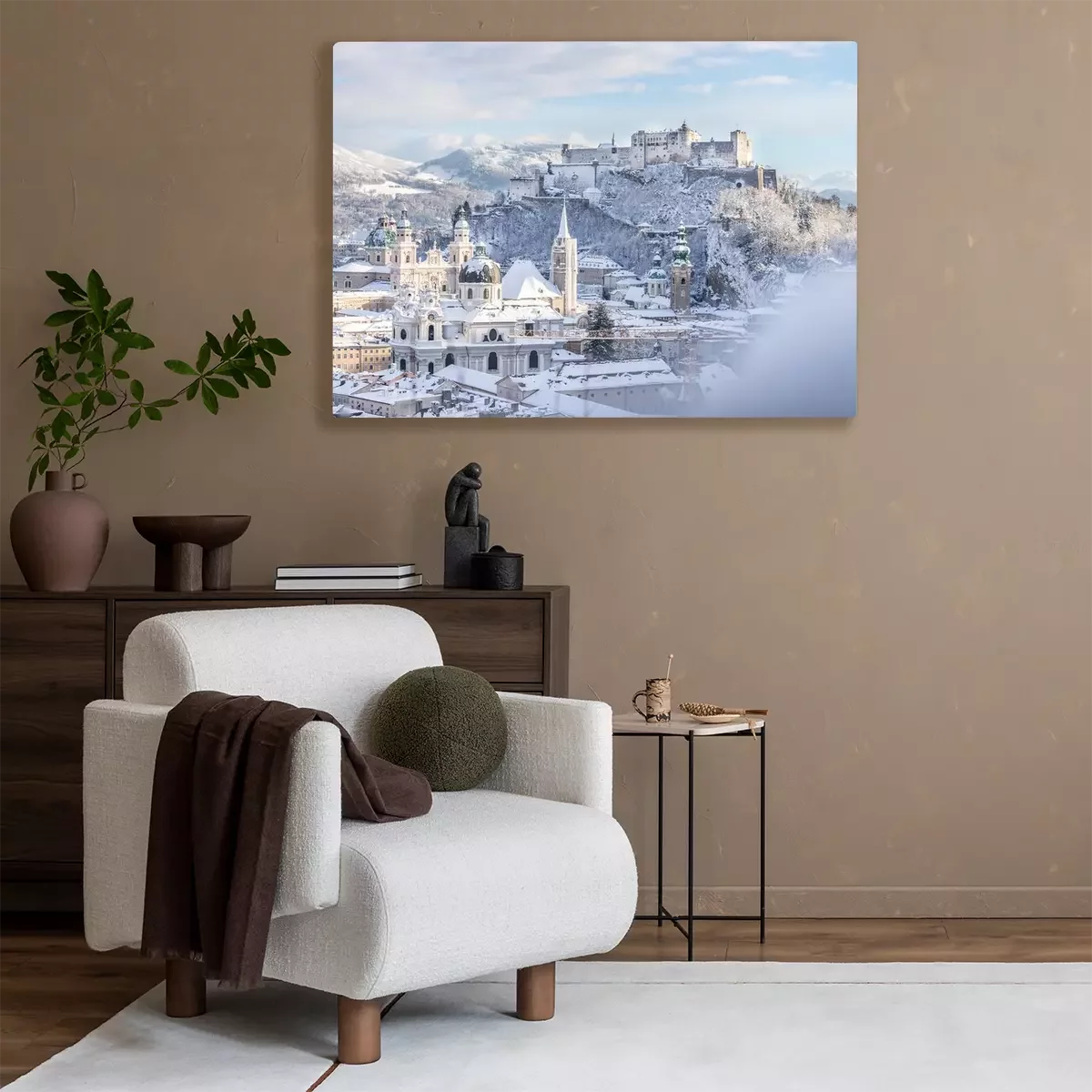 Canvas Panorama van Salzburg in de winter: Sneeuw historisch centrum, zonneschijn