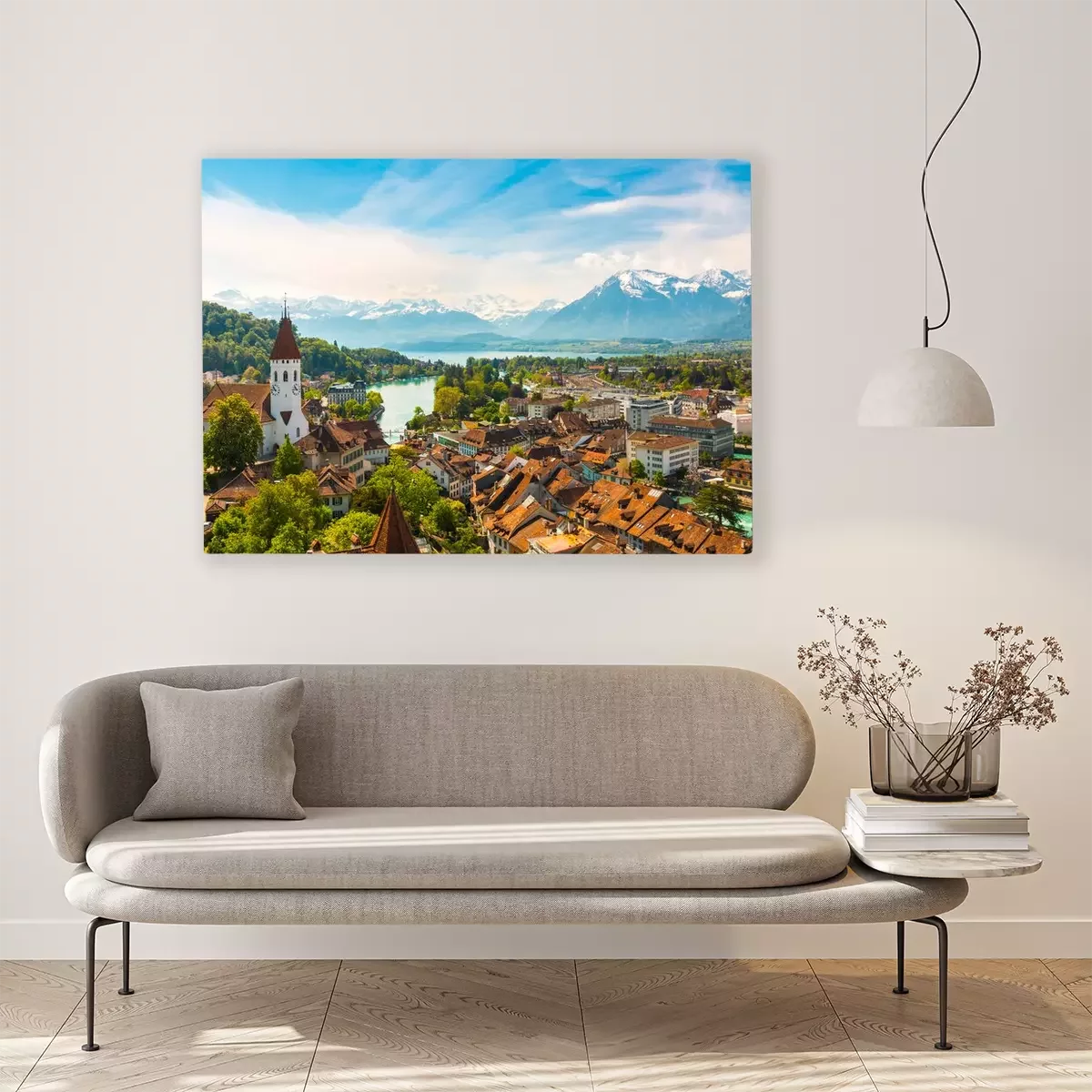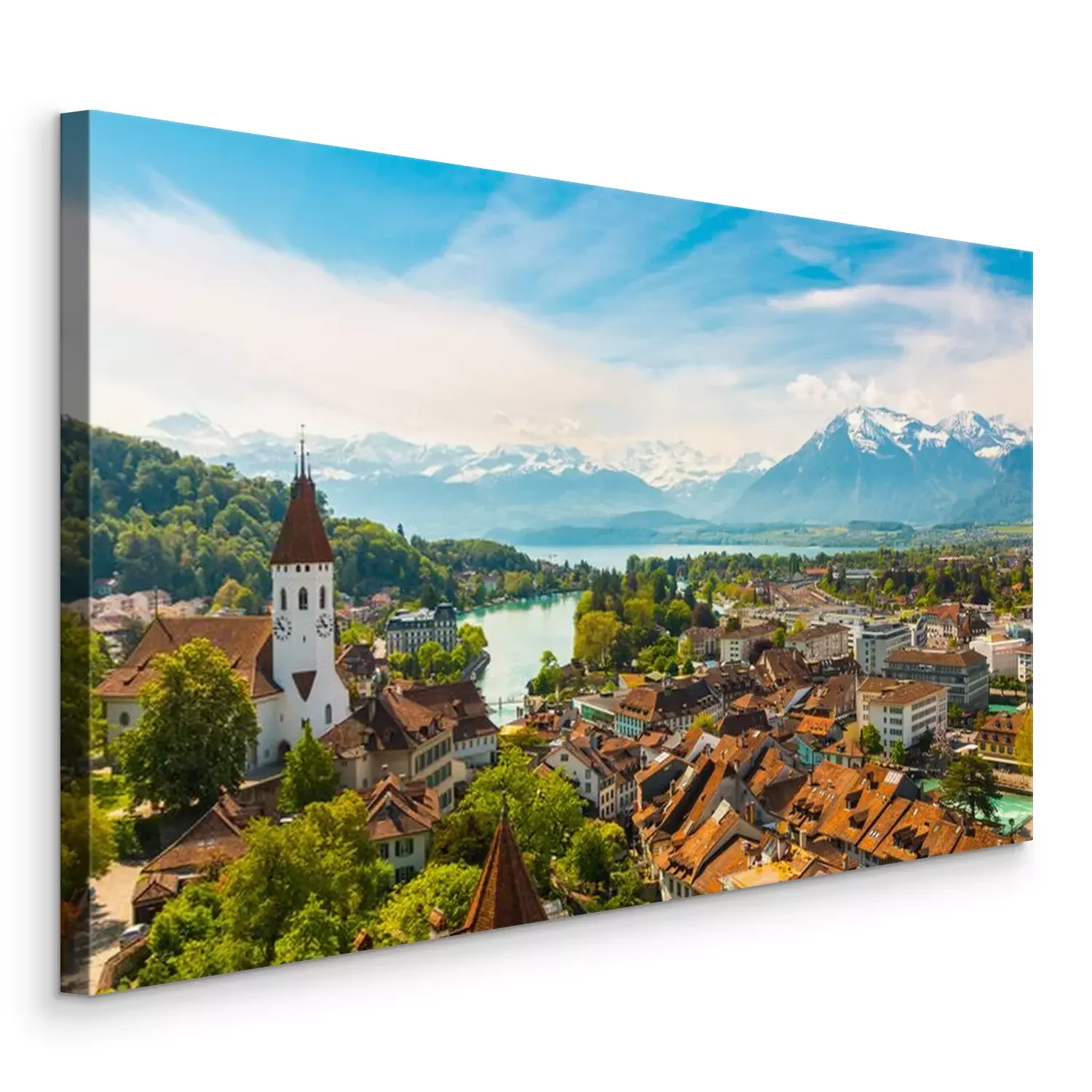 Canvas: Panorama van Thun stad met Alpen en Thunersee meer, Zwitserland.