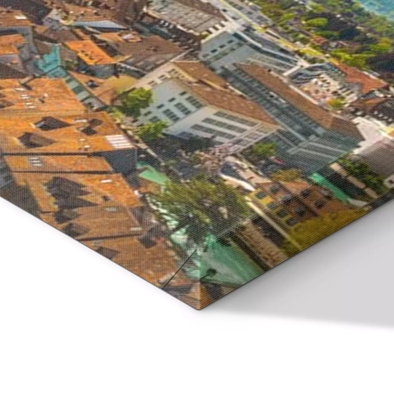 De print wordt aangebracht op hoogwaardig canvas dat op een schildersweefgetouw (spieraam) wordt gespannen. Omdat de print de zijranden bedekt, hoeft het ontwerp niet met een extra kader te worden omlijst. Wij raden ook composities aan die uit meerdere foto's bestaan en zo een coherente compositie vormen.