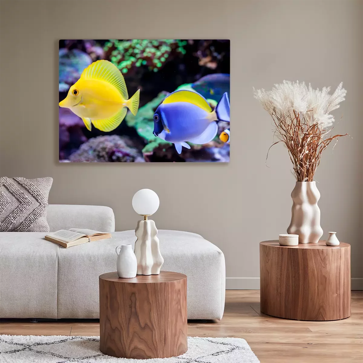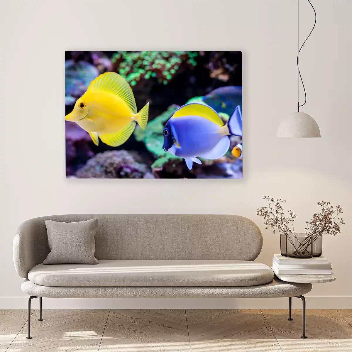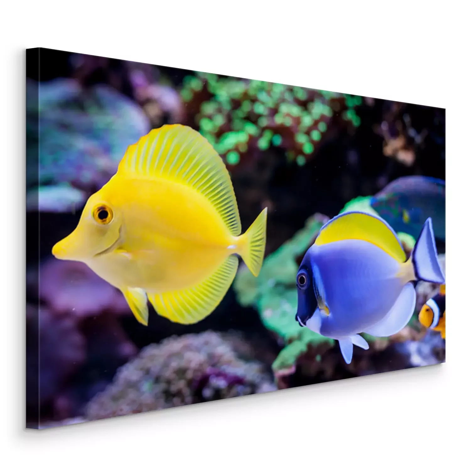 Canvas: Paracanthurus hepatus, Blue tang (Acanthurus leucosternon) and Zebrasoma flavescens in Home Coral reef aquarium. Selective focus