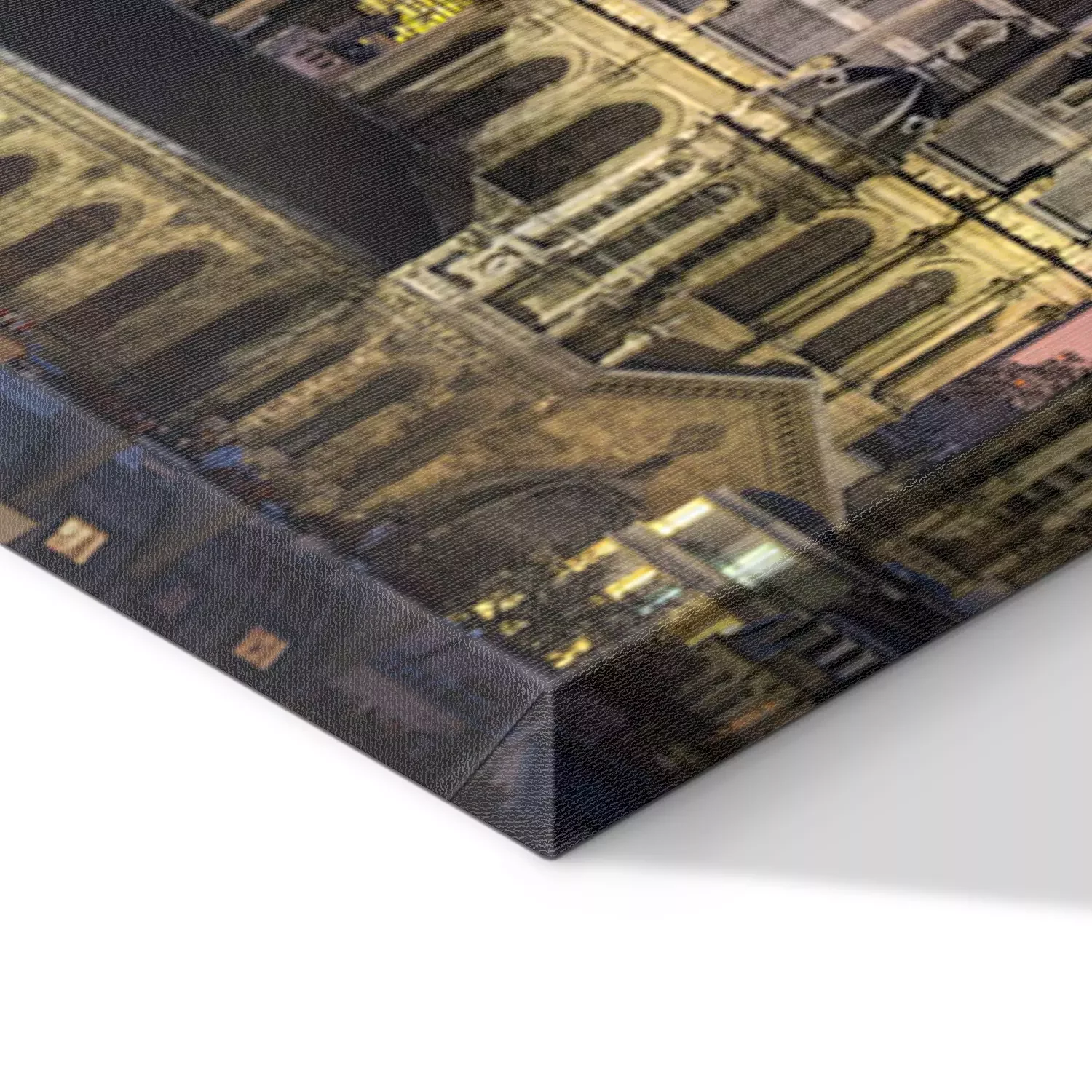 De print wordt aangebracht op hoogwaardig canvas dat op een schildersweefgetouw (spieraam) wordt gespannen. Omdat de print de zijranden bedekt, hoeft het ontwerp niet met een extra kader te worden omlijst. Wij raden ook composities aan die uit meerdere foto's bestaan en zo een coherente compositie vormen.