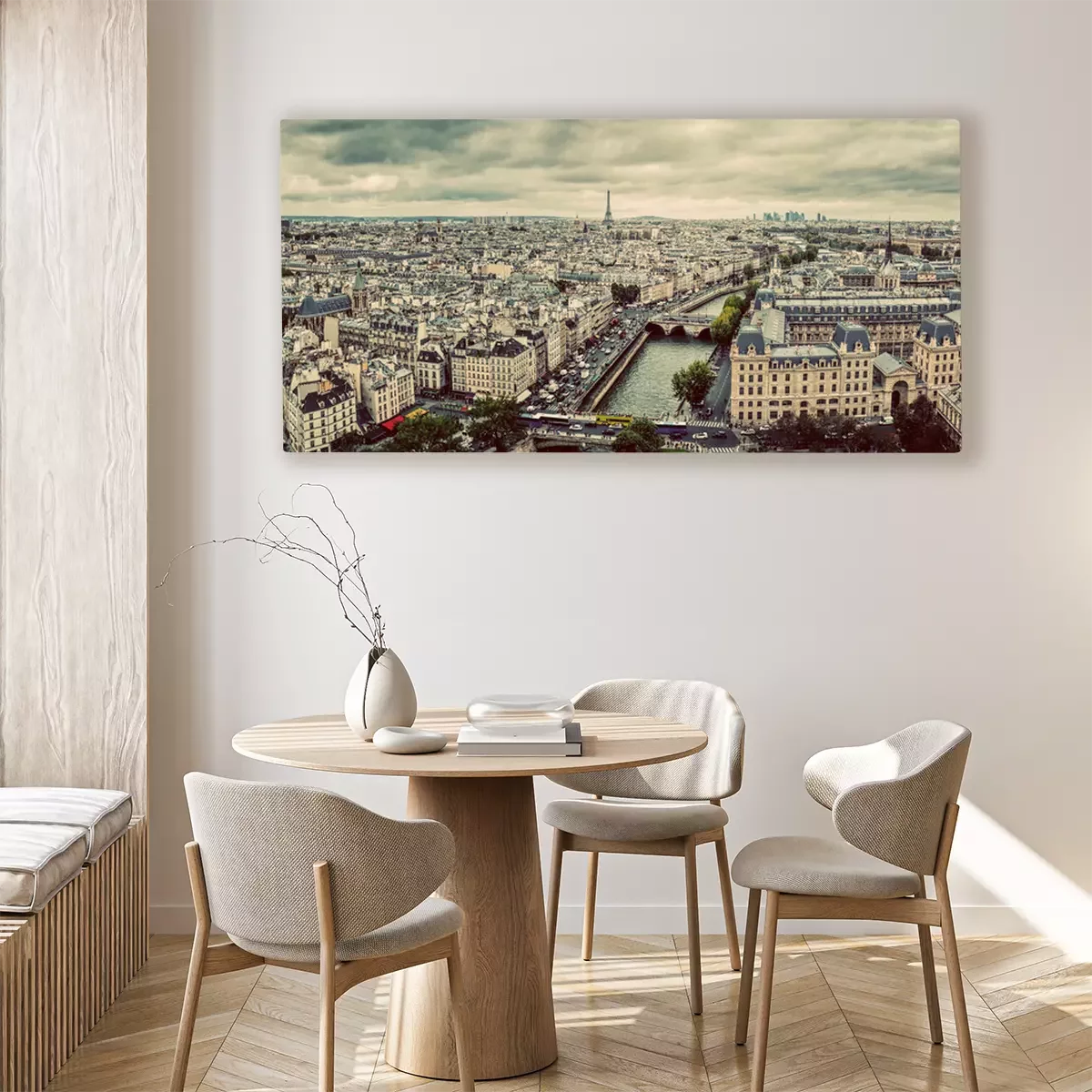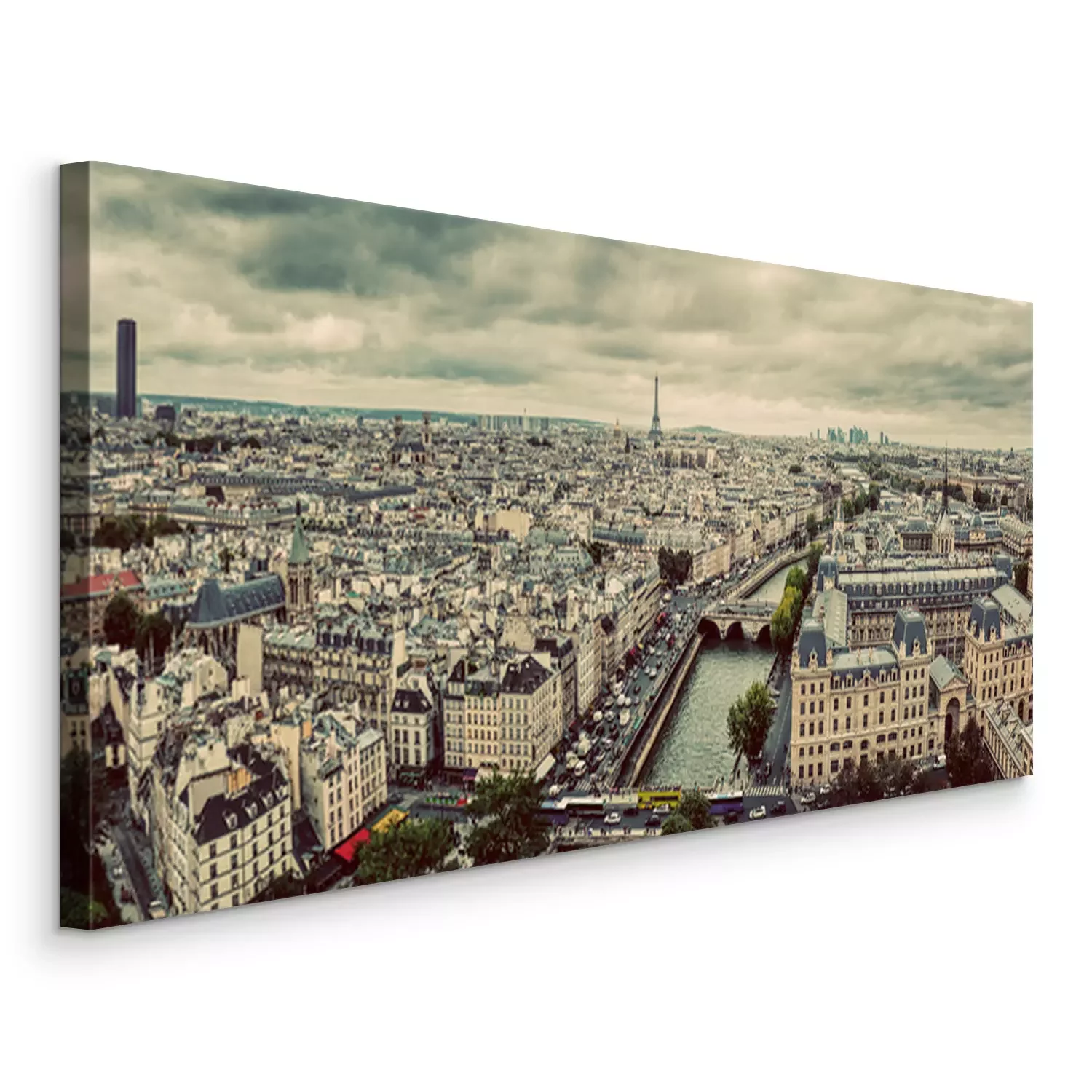 Canvas Parijs, Frankrijk panorama met Eiffeltoren, de rivier de Seine en bruggen. Wijnoogst