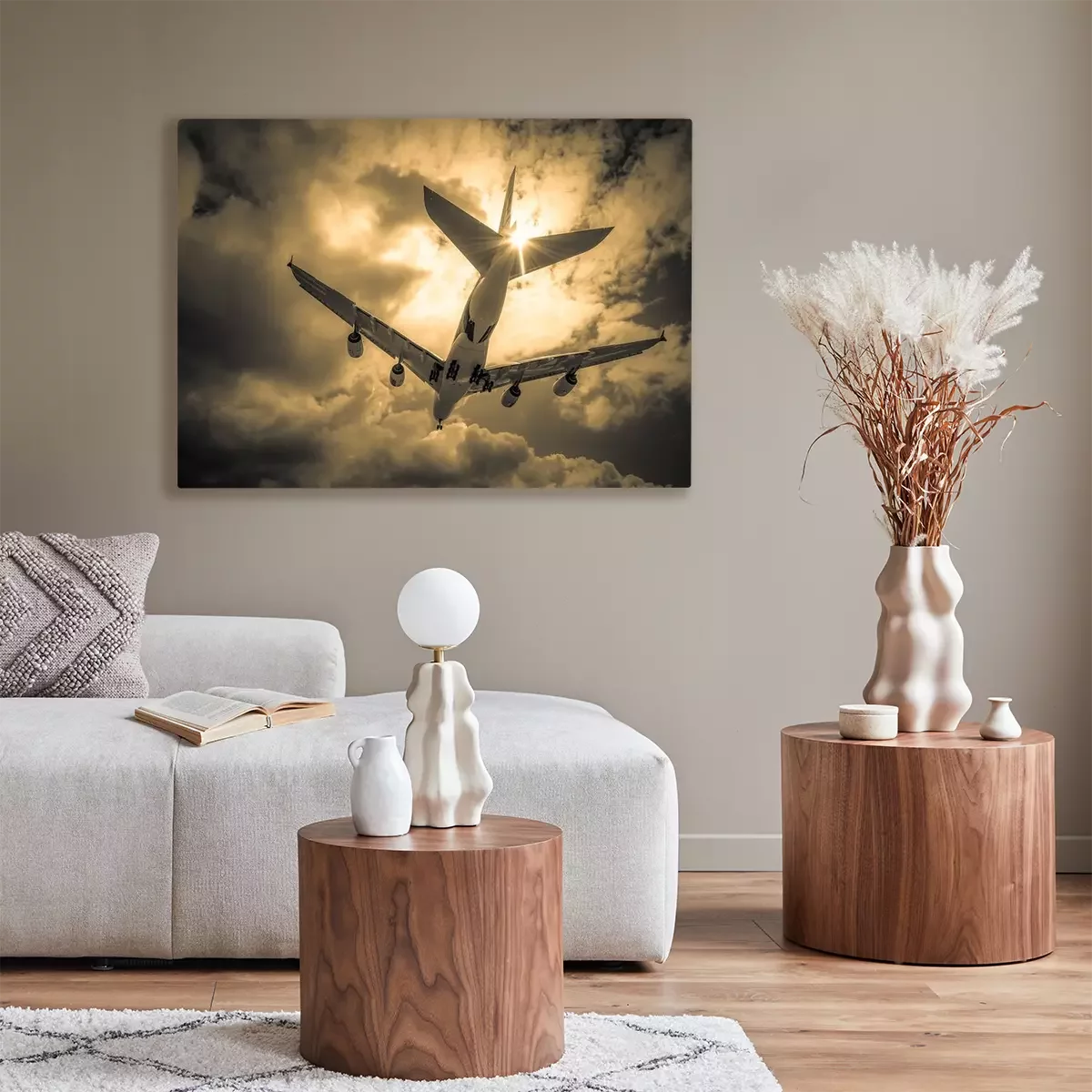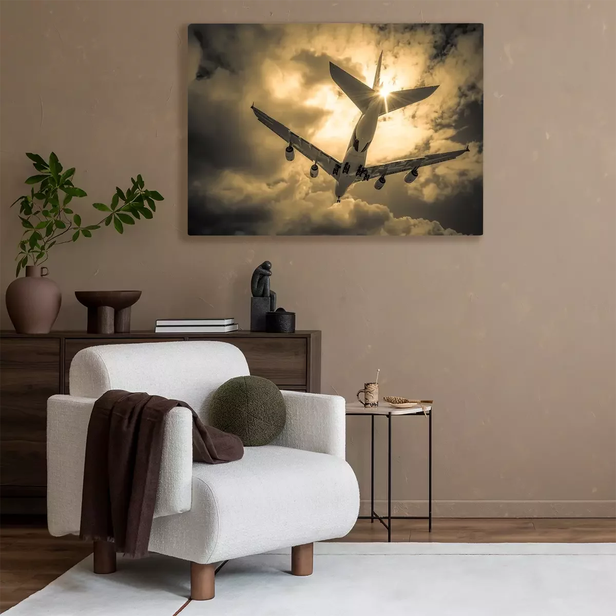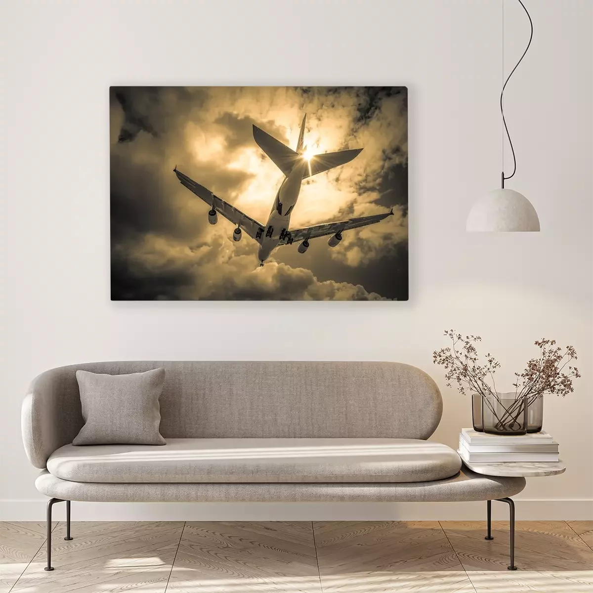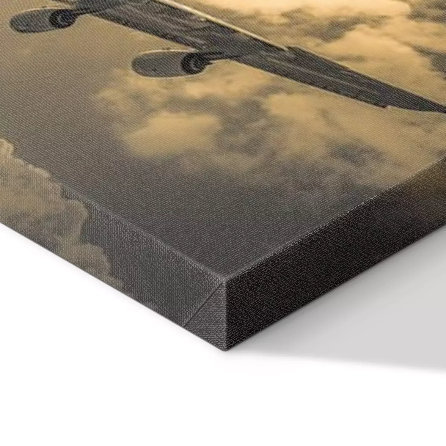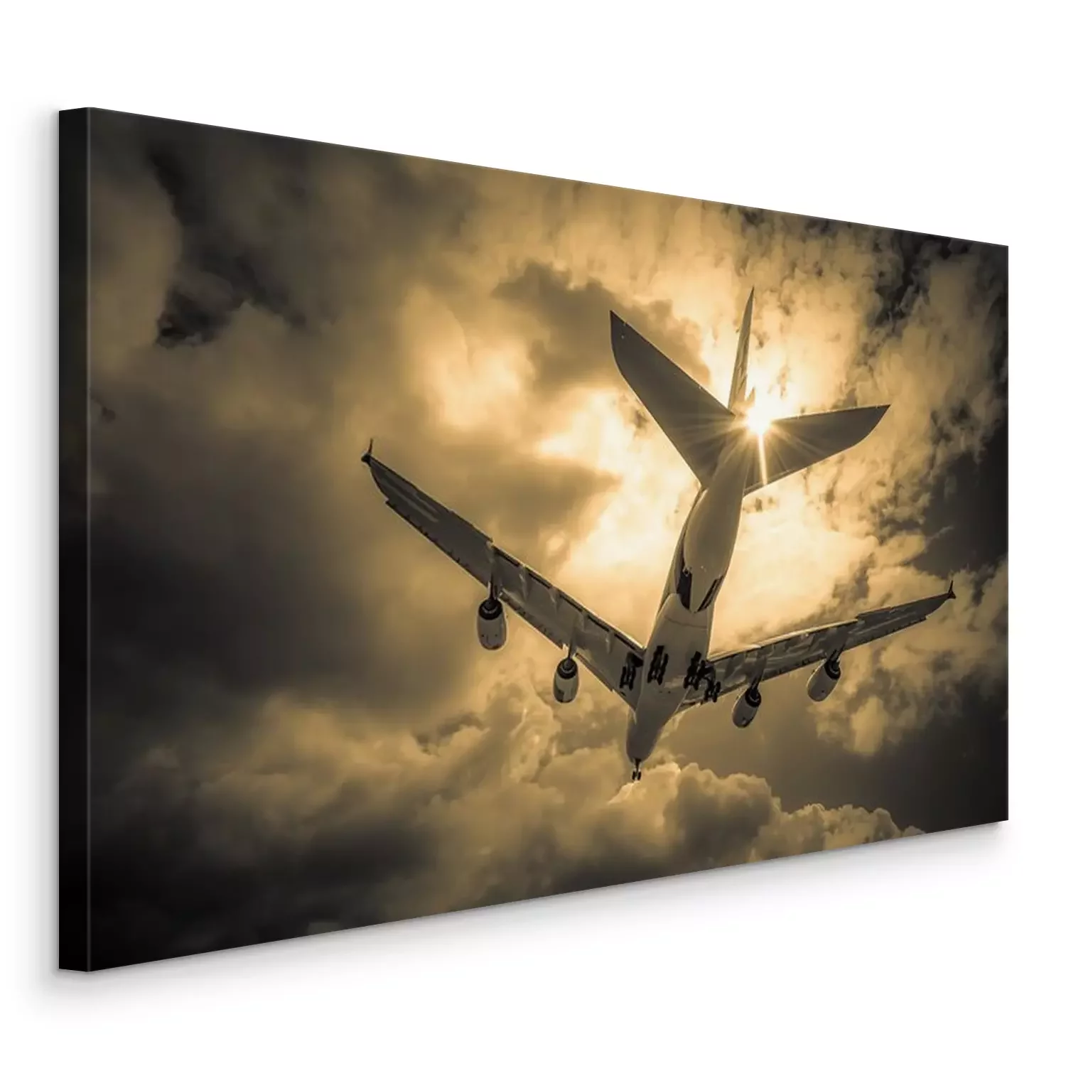 Canvas: passagiersvliegtuig landing door gouden wolken