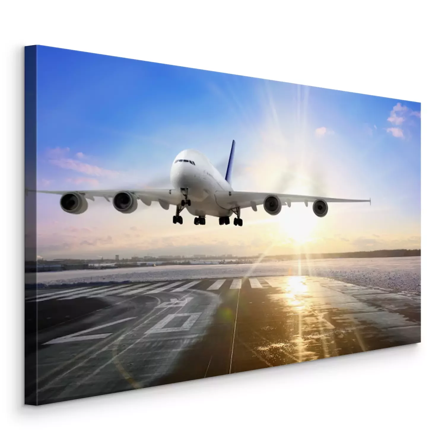 Canvas Passagiersvliegtuig landing op baan in de luchthaven. Avond