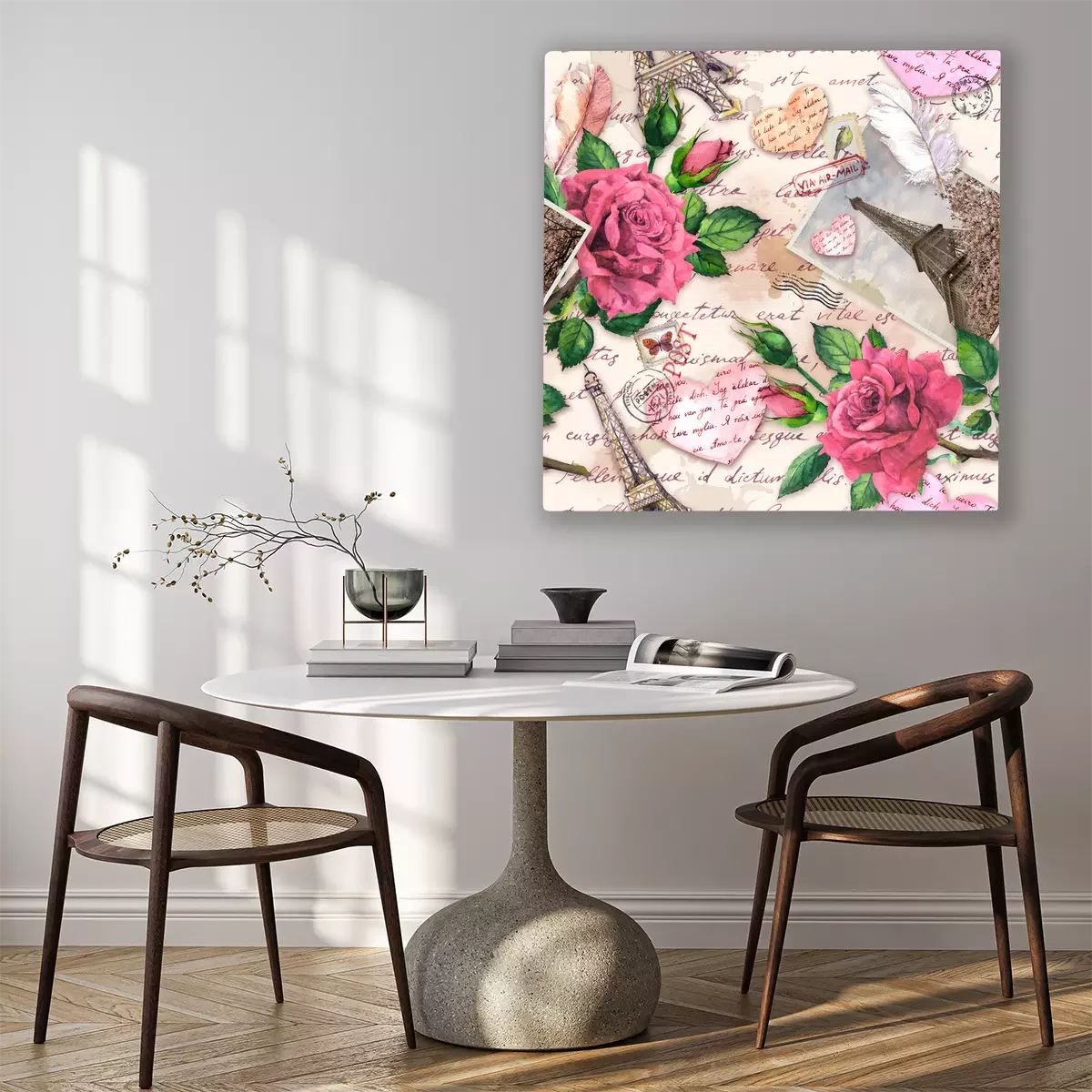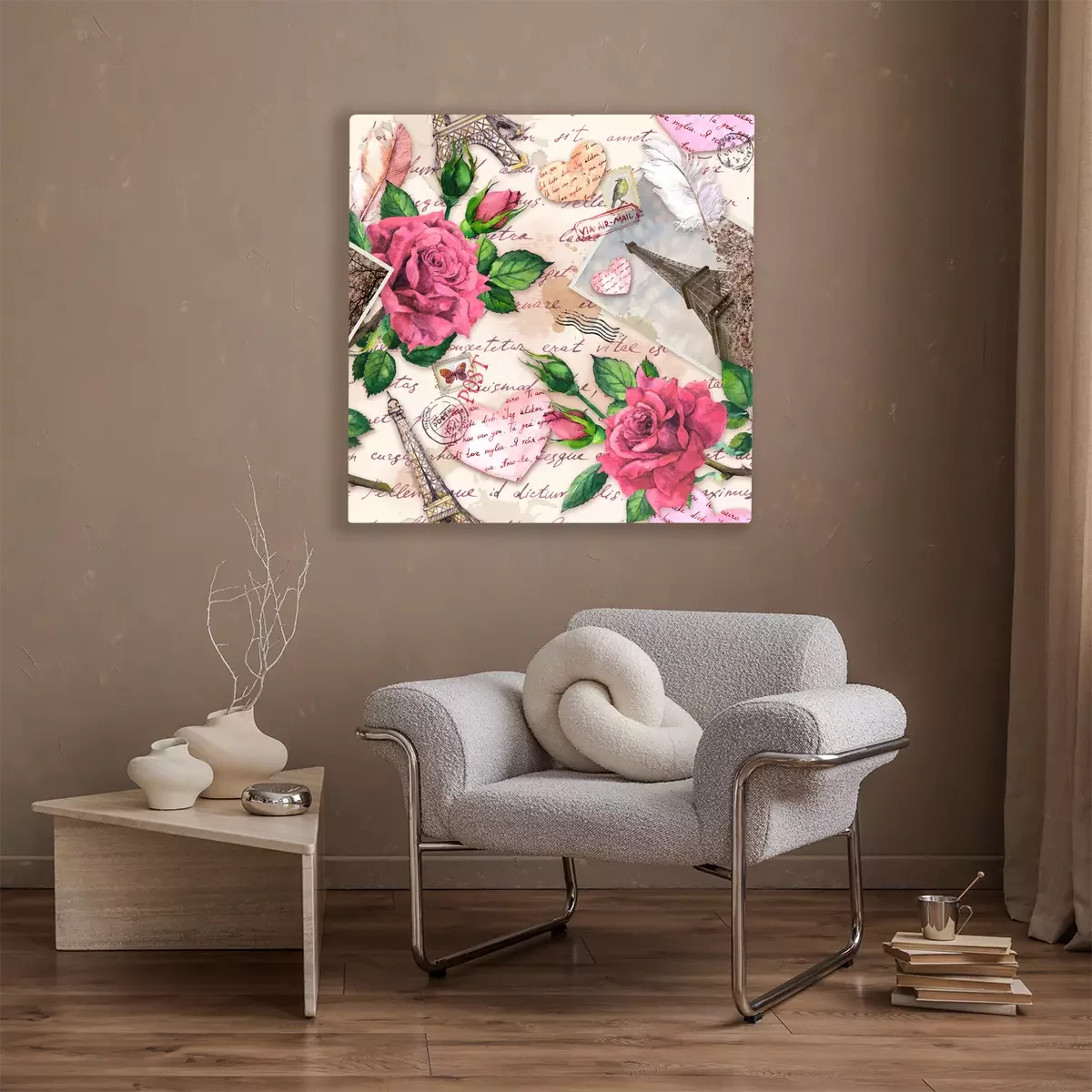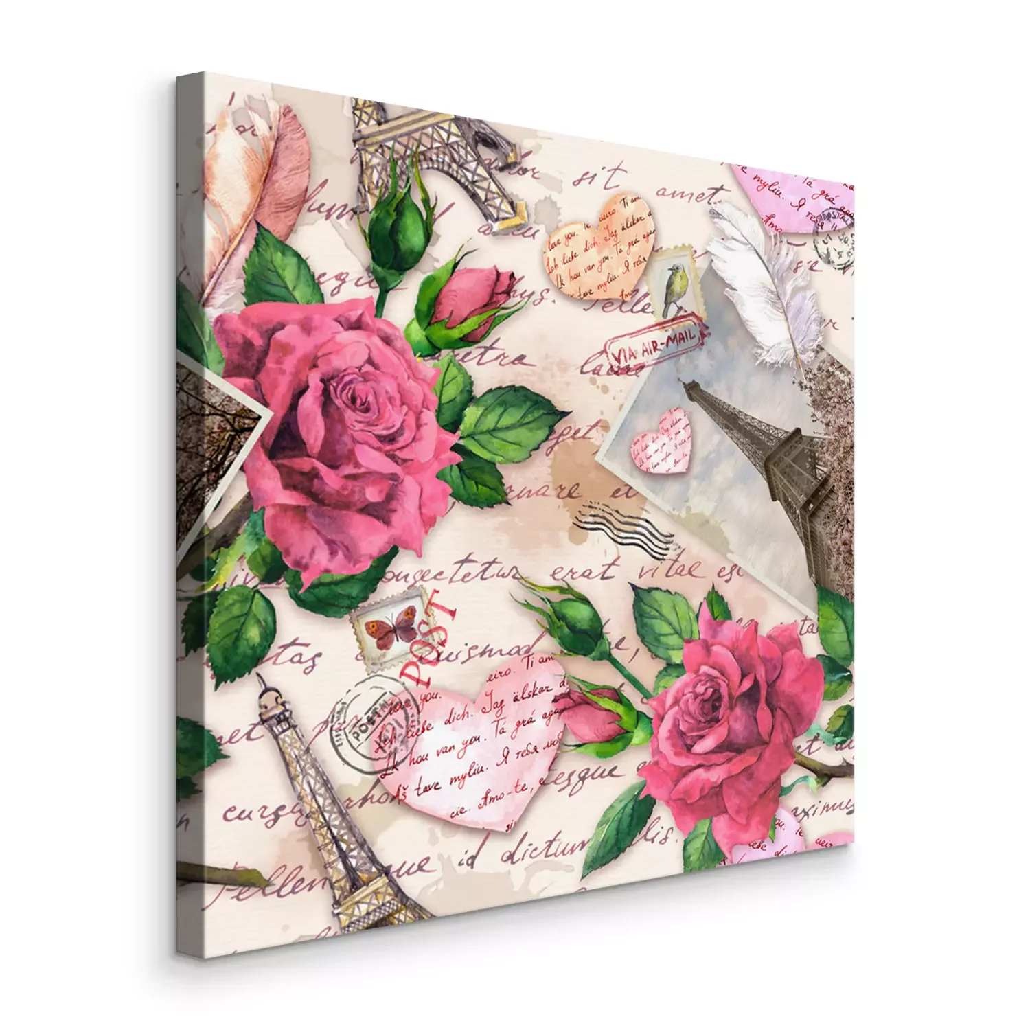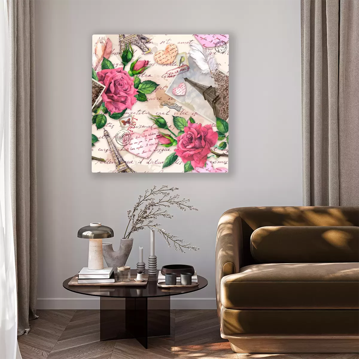 Hand written letters, hearts, bicycle with flowers in basket, vintage photo of Eiffel Tower, rose flowers, postal stamps, feathers. Seamless pattern about love, France, Paris