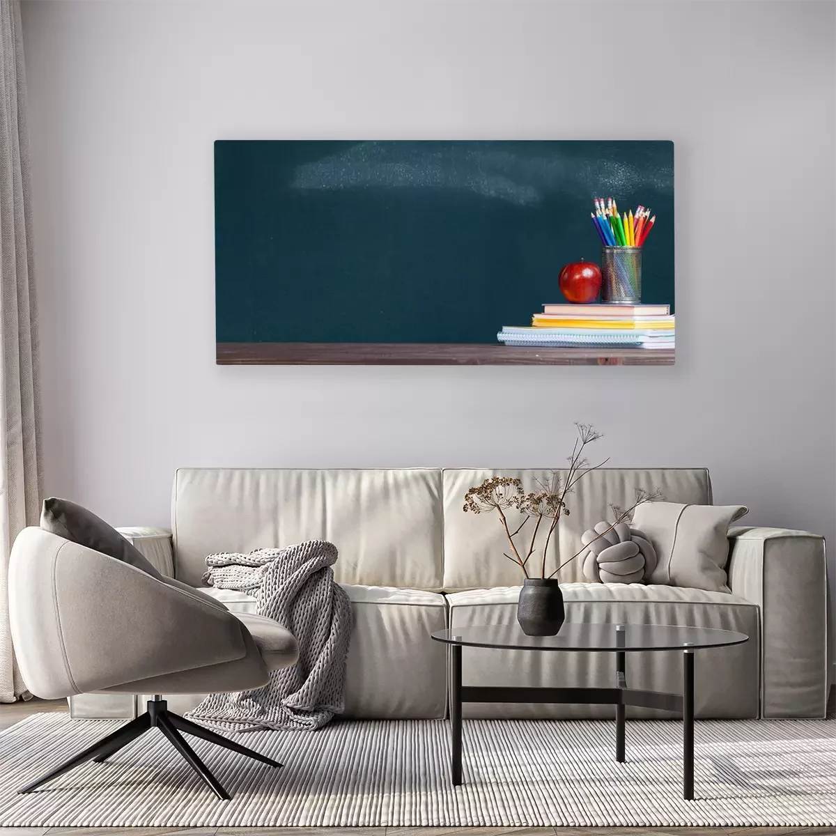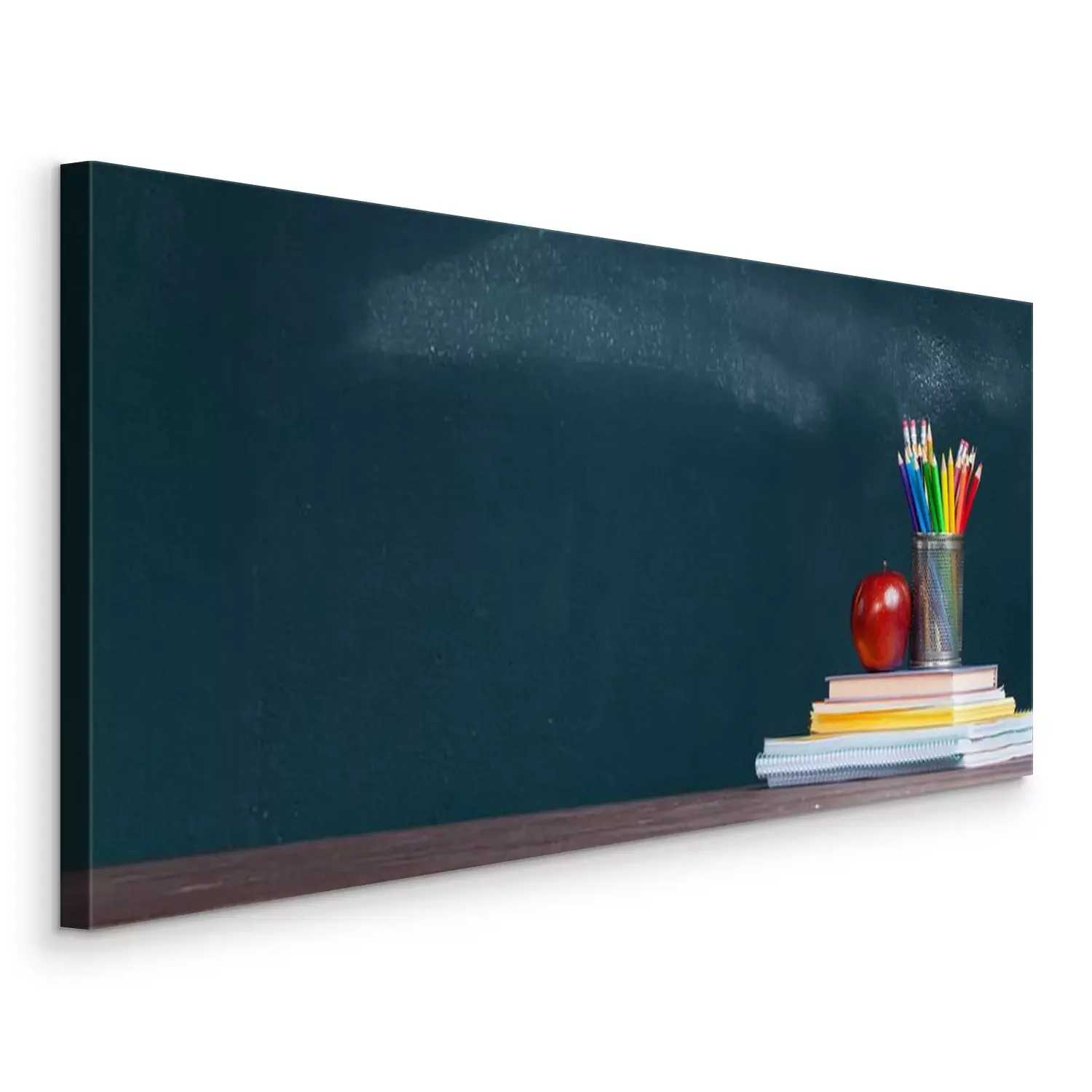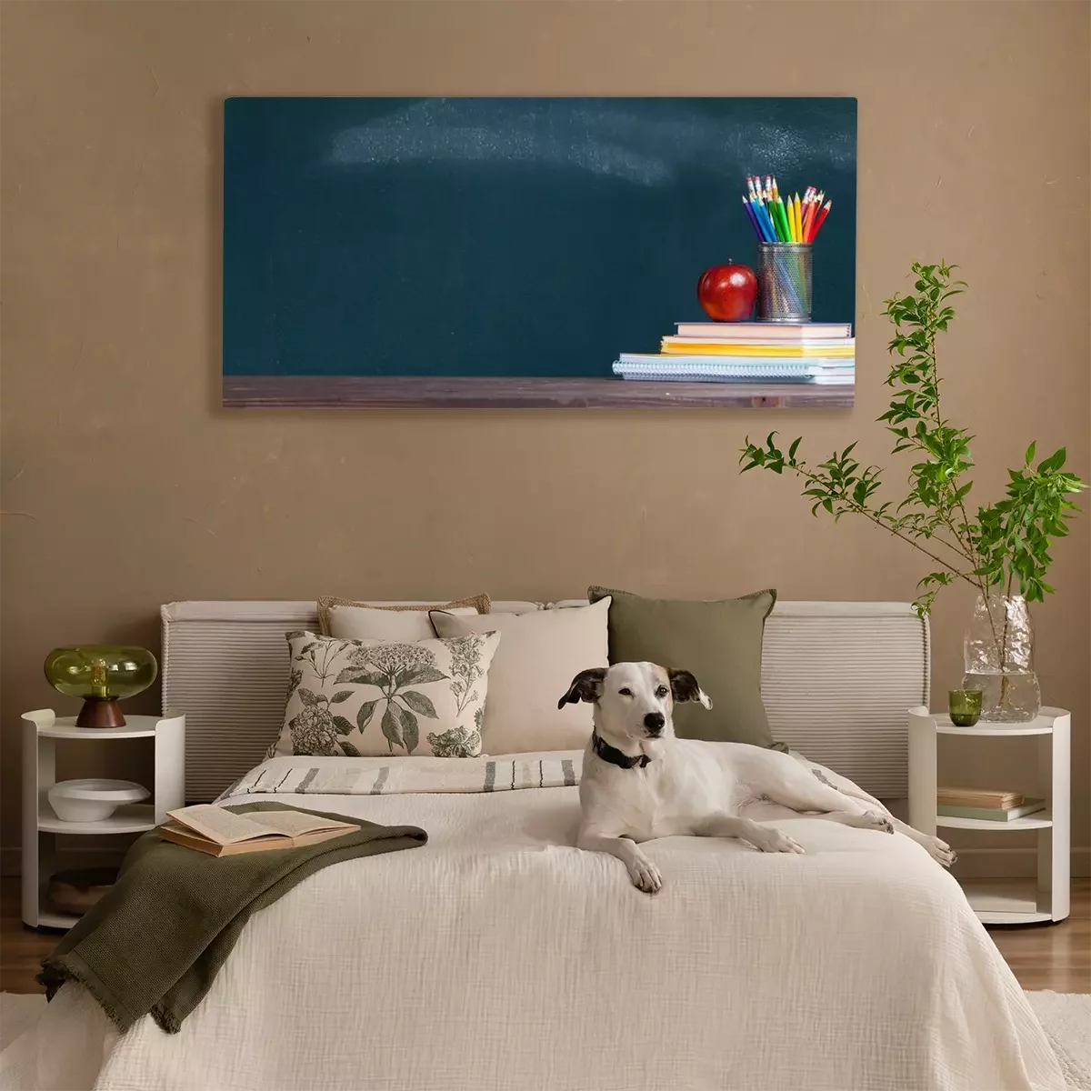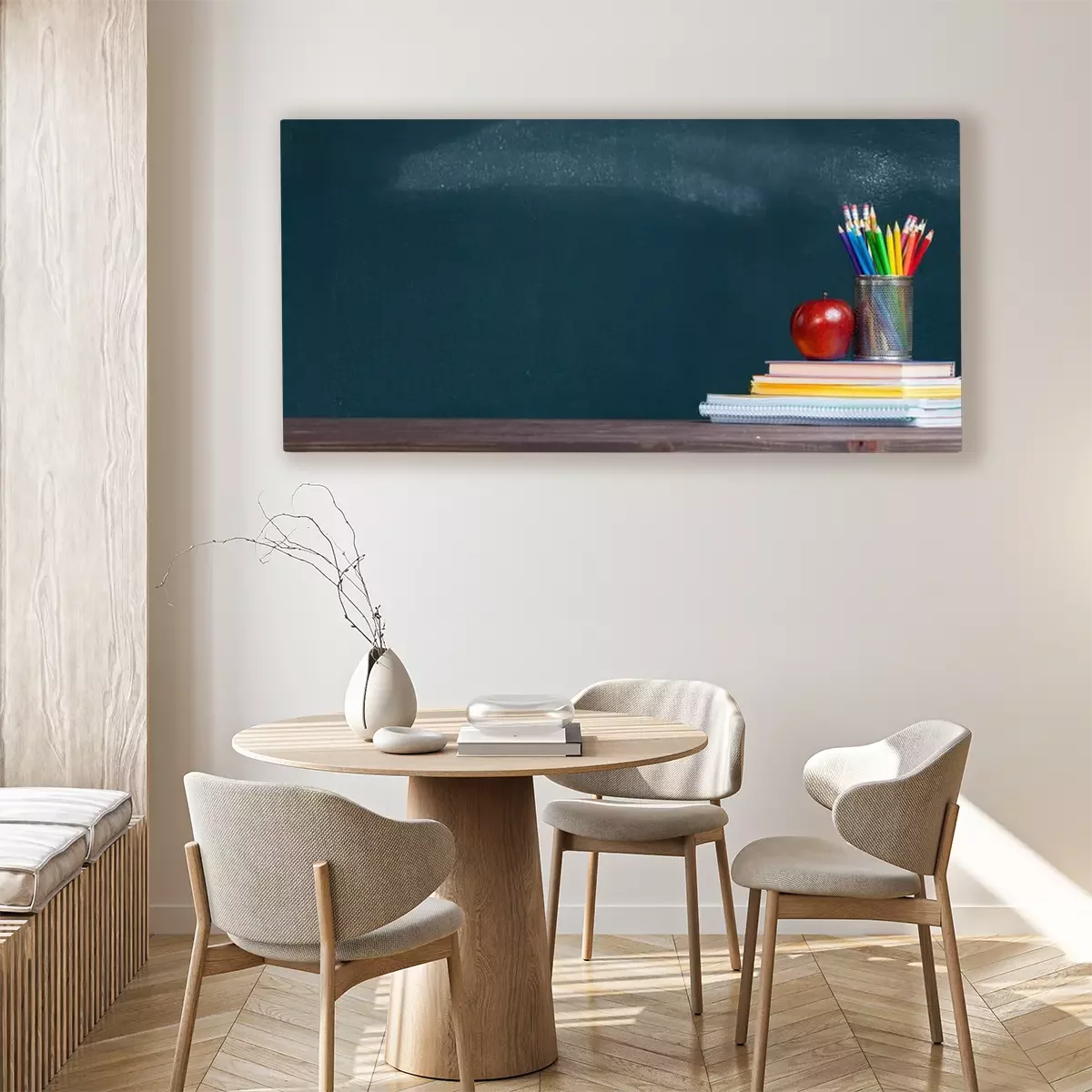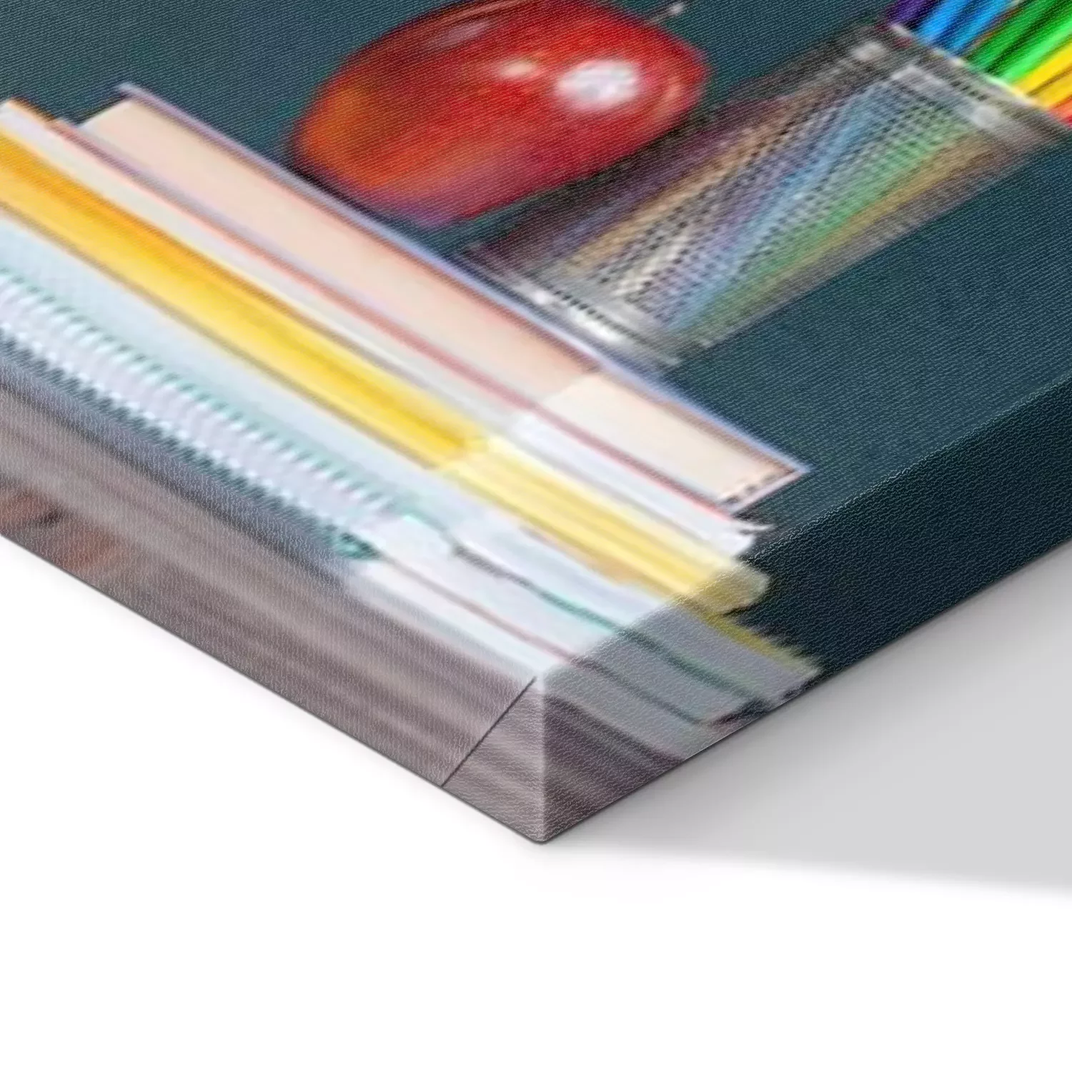 Canvas: Pencil tray and an apple on notebooks on school teacher's desk.