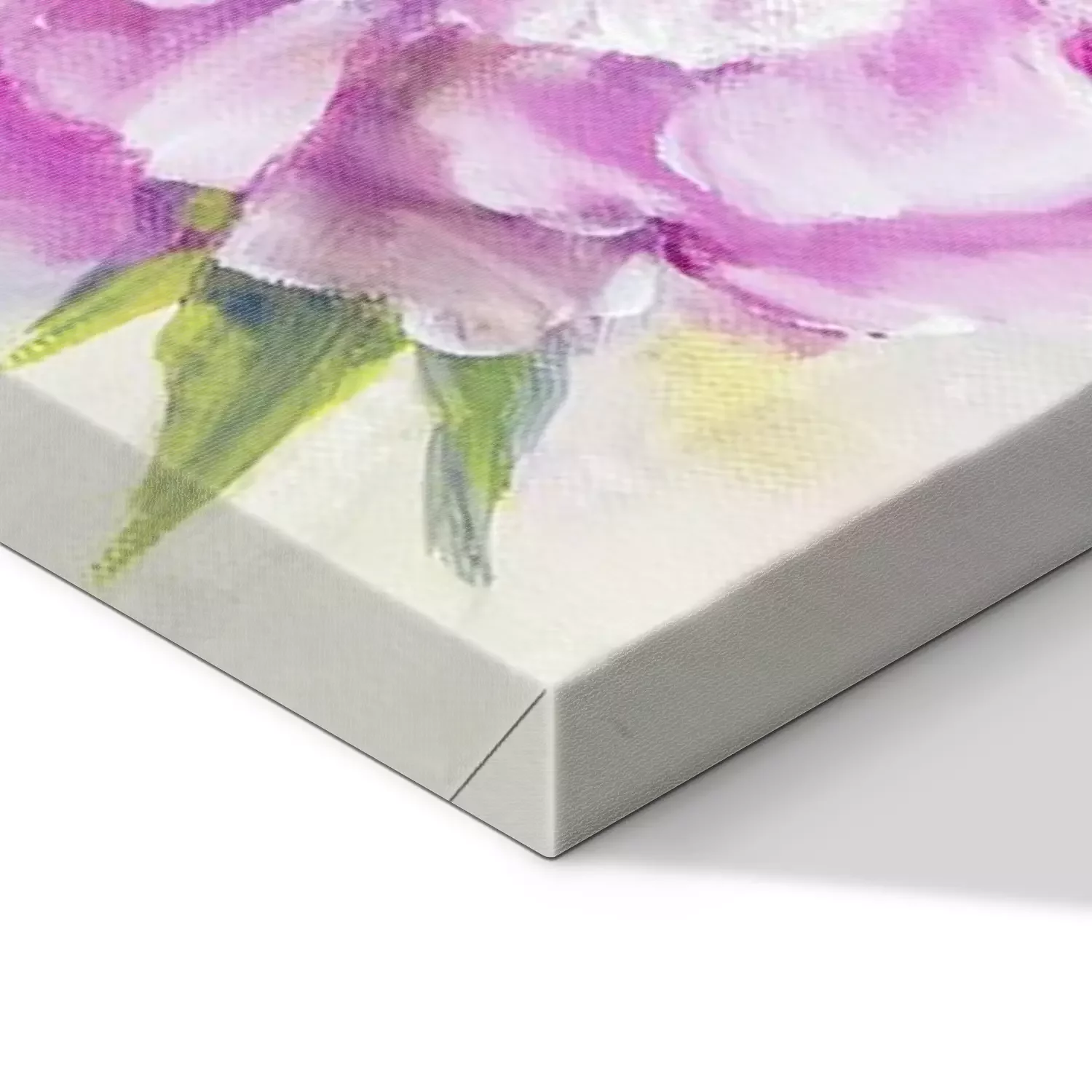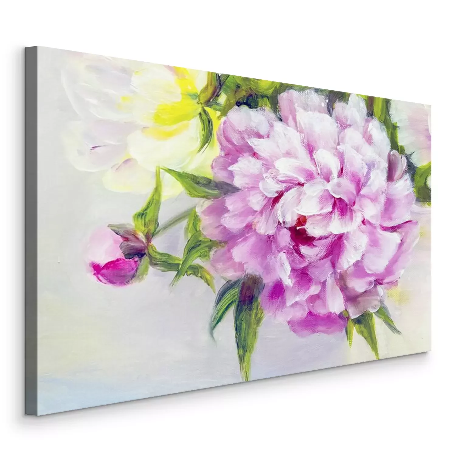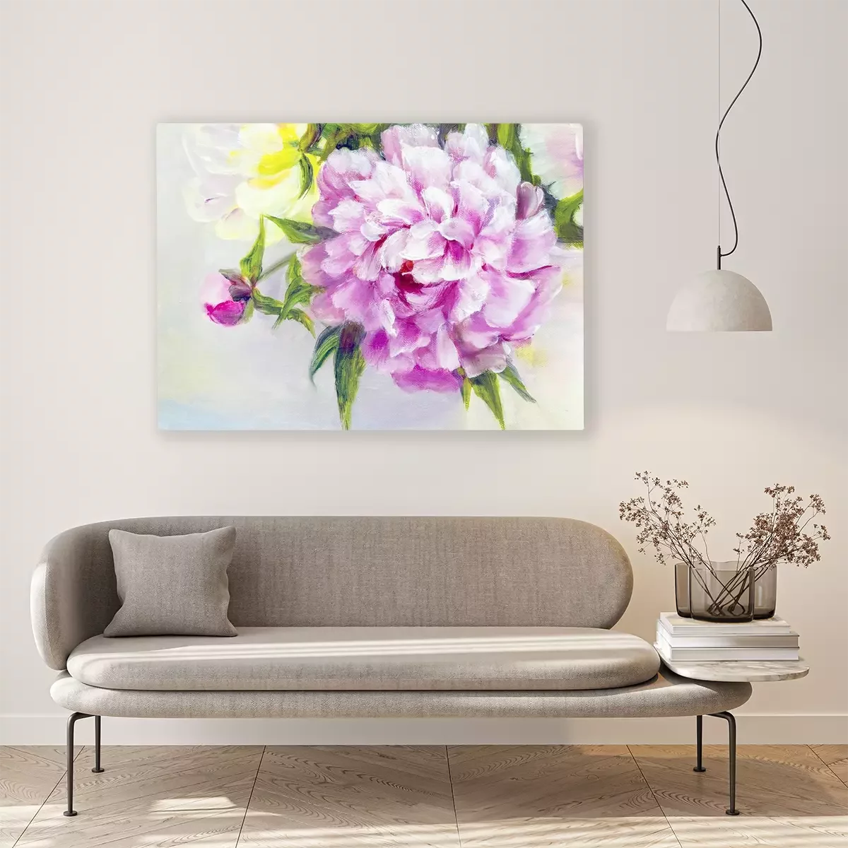 Canvas: Peony roze bloemen in een witte vaas. Olieverf schilderij illustratie