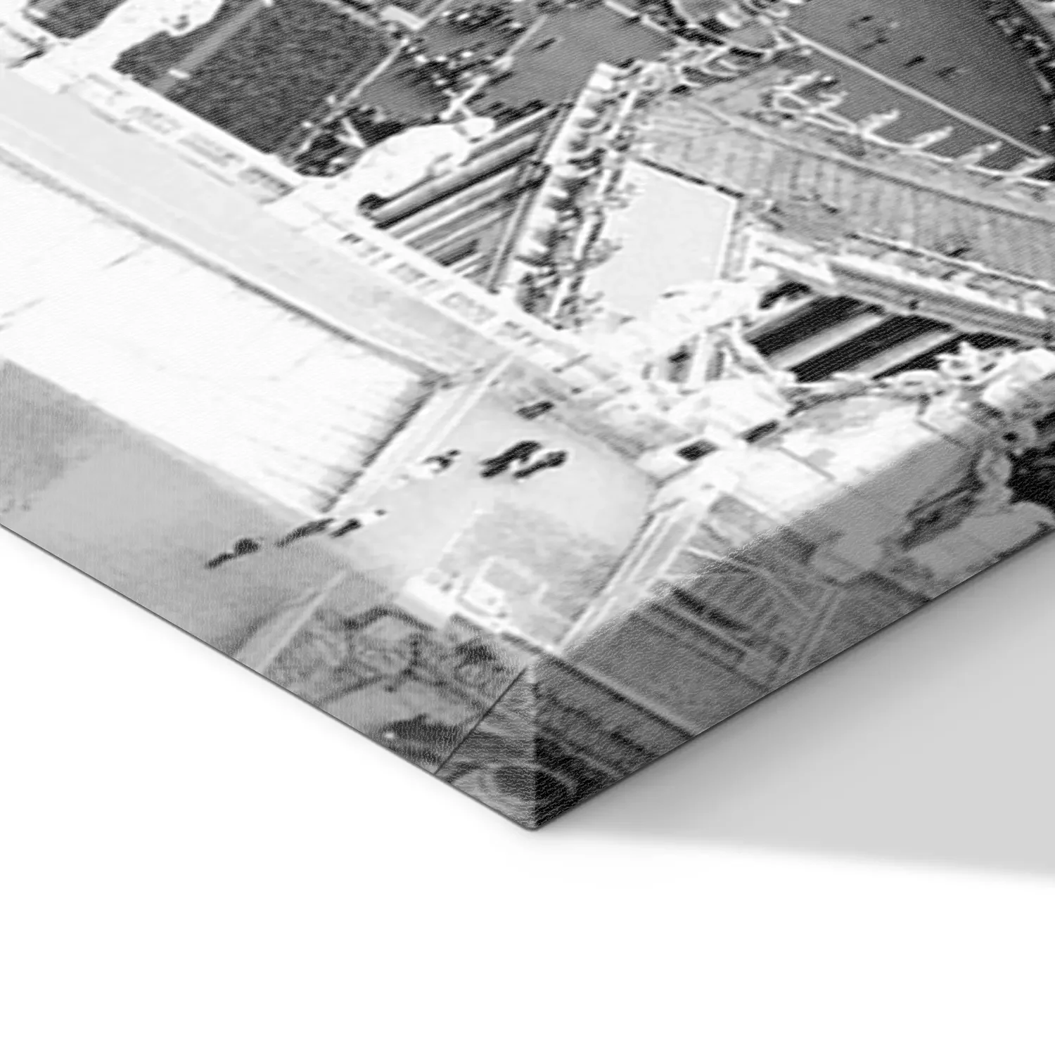 De print wordt aangebracht op hoogwaardig canvas dat op een schildersweefgetouw (spieraam) wordt gespannen. Omdat de print de zijranden bedekt, hoeft het ontwerp niet met een extra kader te worden omlijst. Wij raden ook composities aan die uit meerdere foto's bestaan en zo een coherente compositie vormen.
