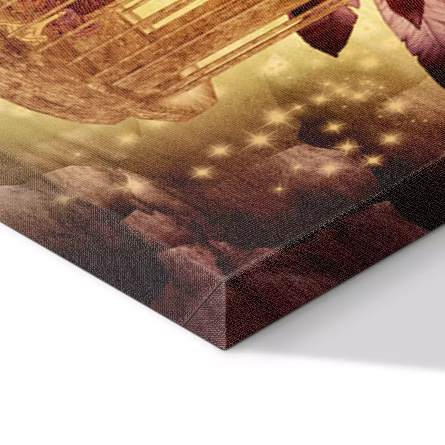 De print wordt aangebracht op hoogwaardig canvas dat op een schildersweefgetouw (spieraam) wordt gespannen. Omdat de print de zijranden bedekt, hoeft het ontwerp niet met een extra kader te worden omlijst. Wij raden ook composities aan die uit meerdere foto's bestaan en zo een coherente compositie vormen.
