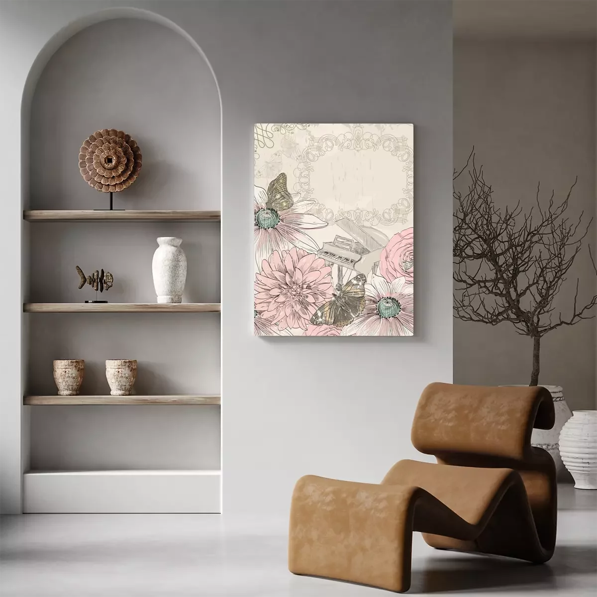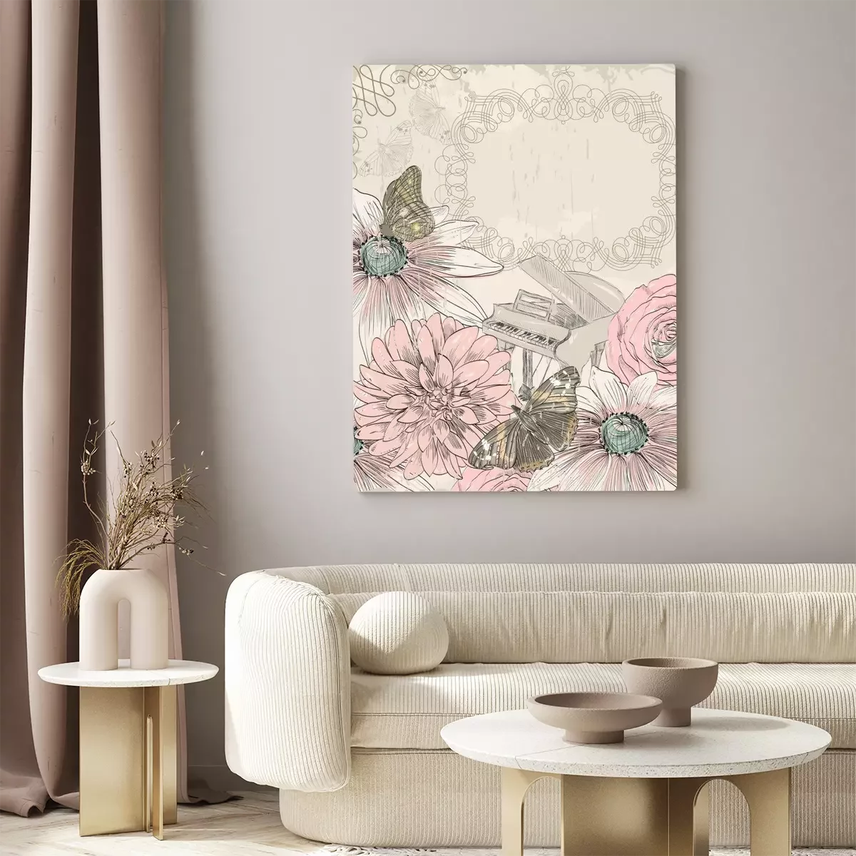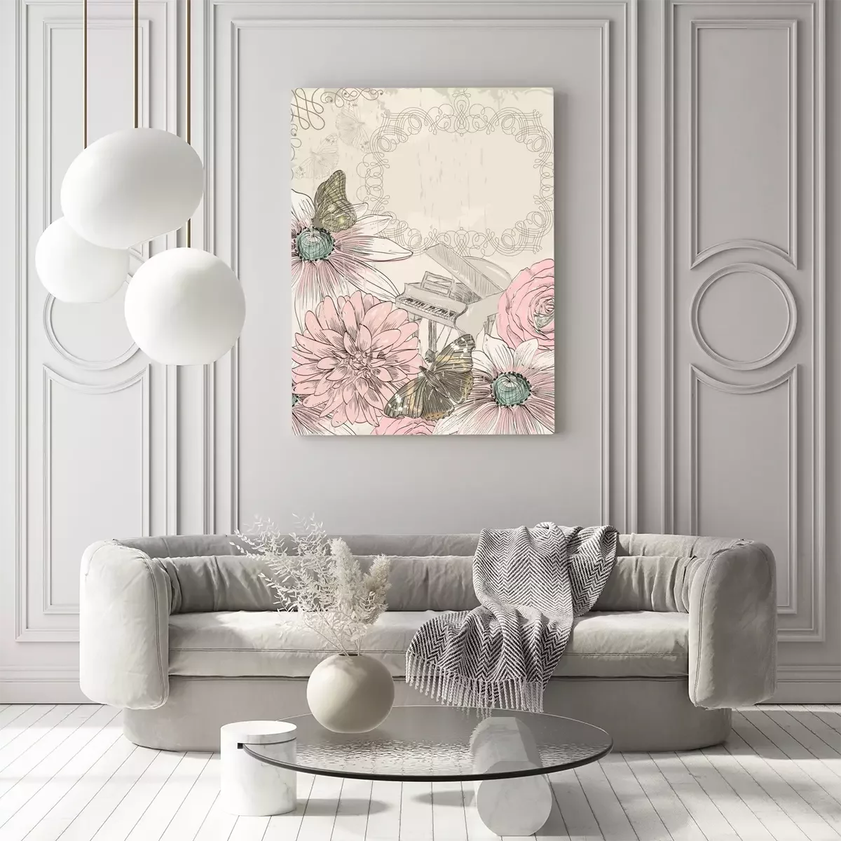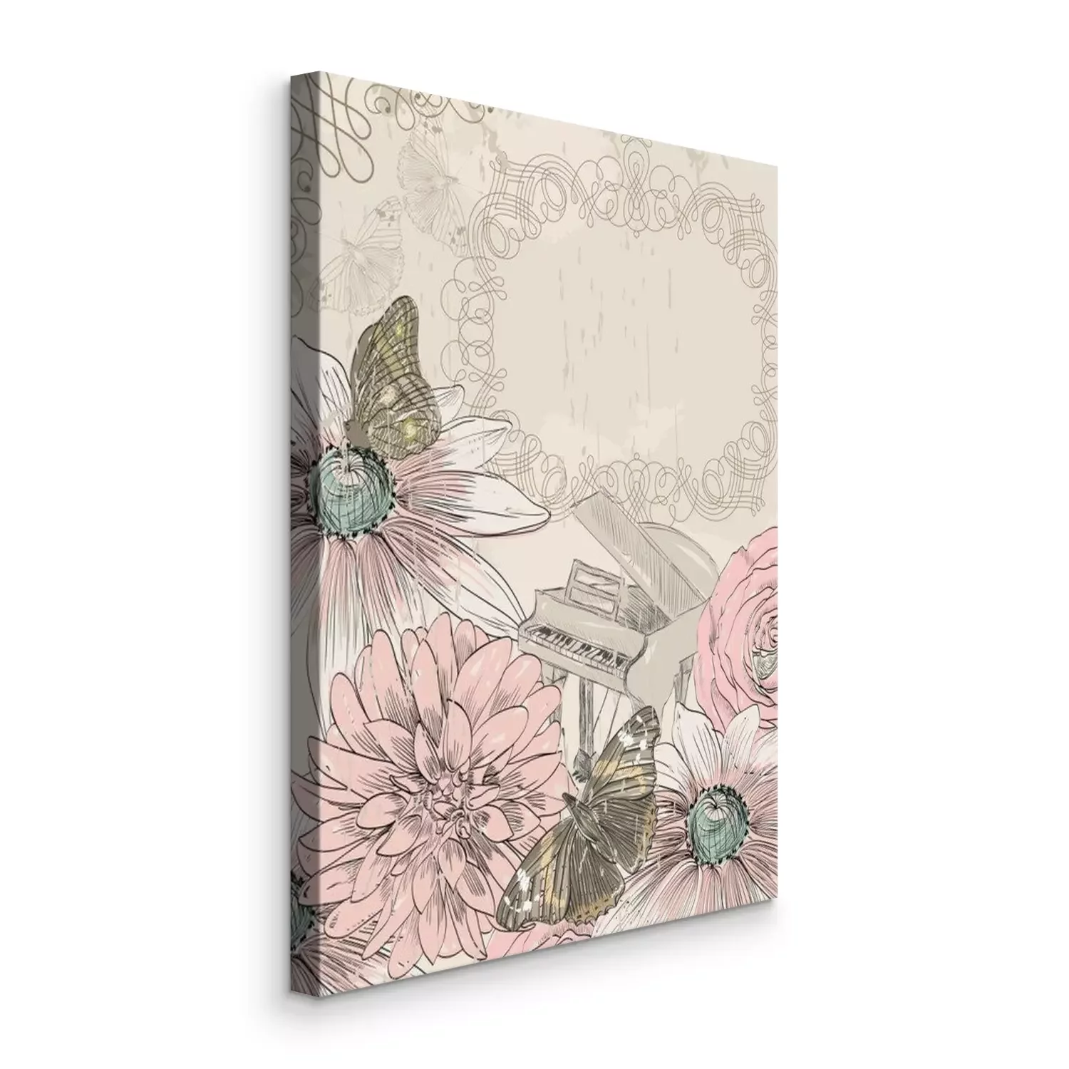 Canvas: Piano, bloemen en vlinders