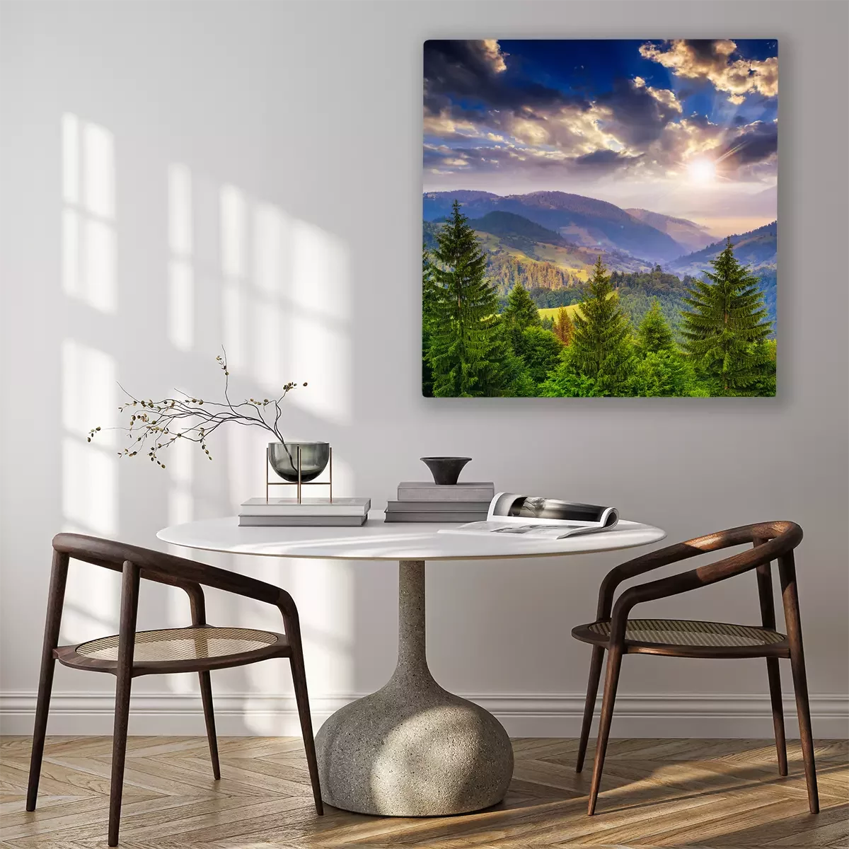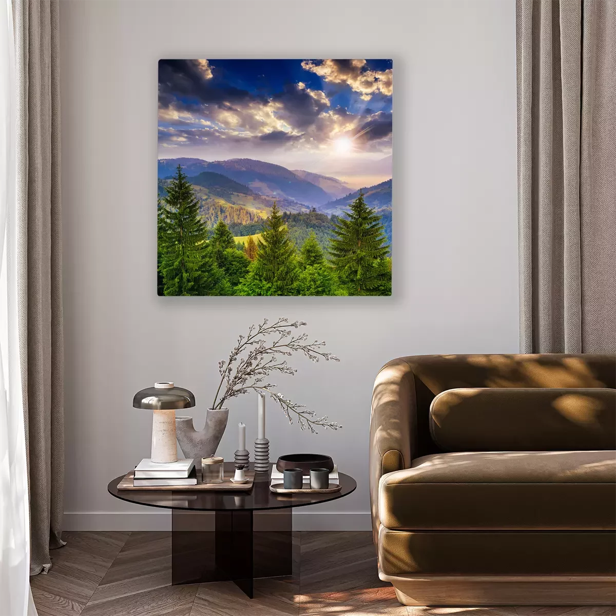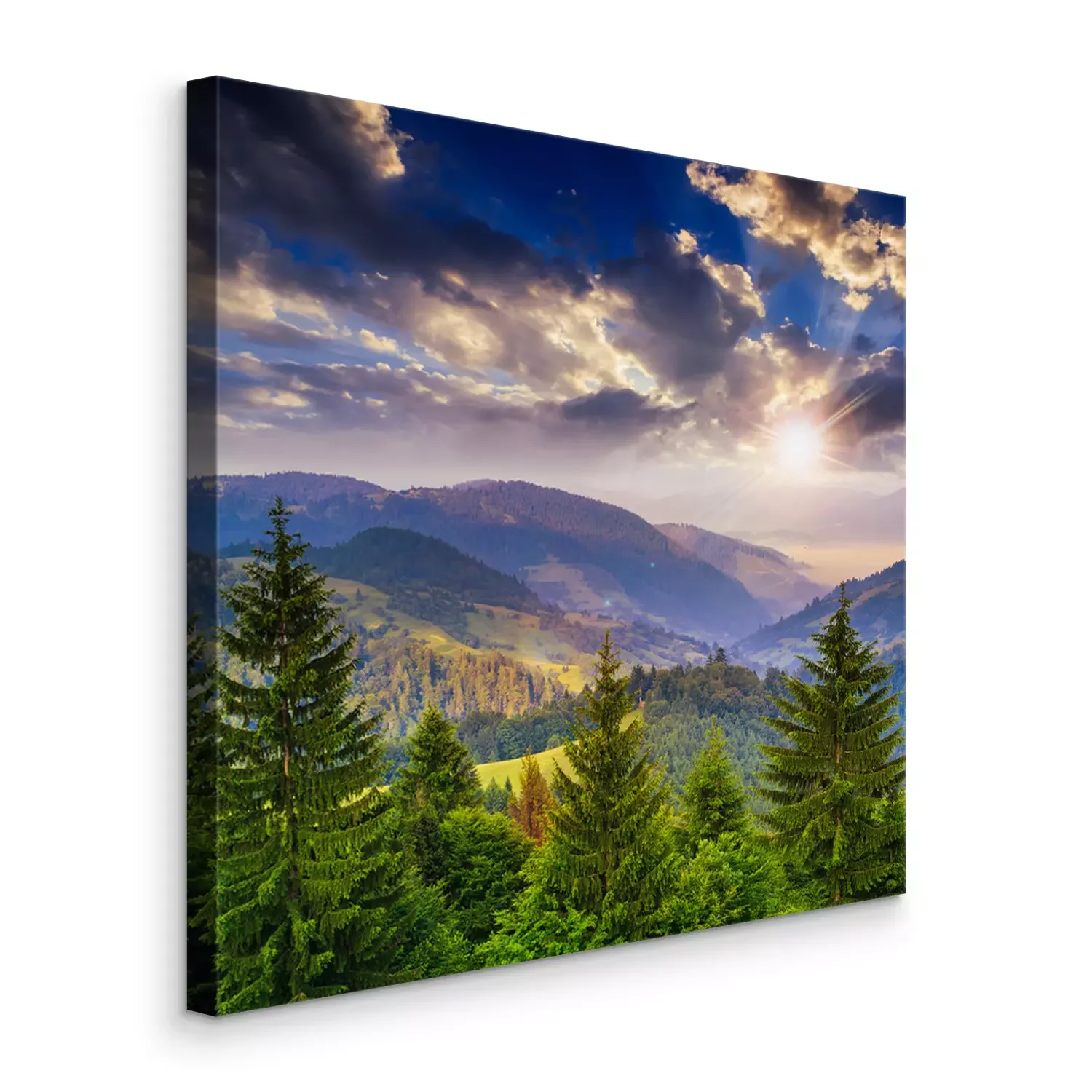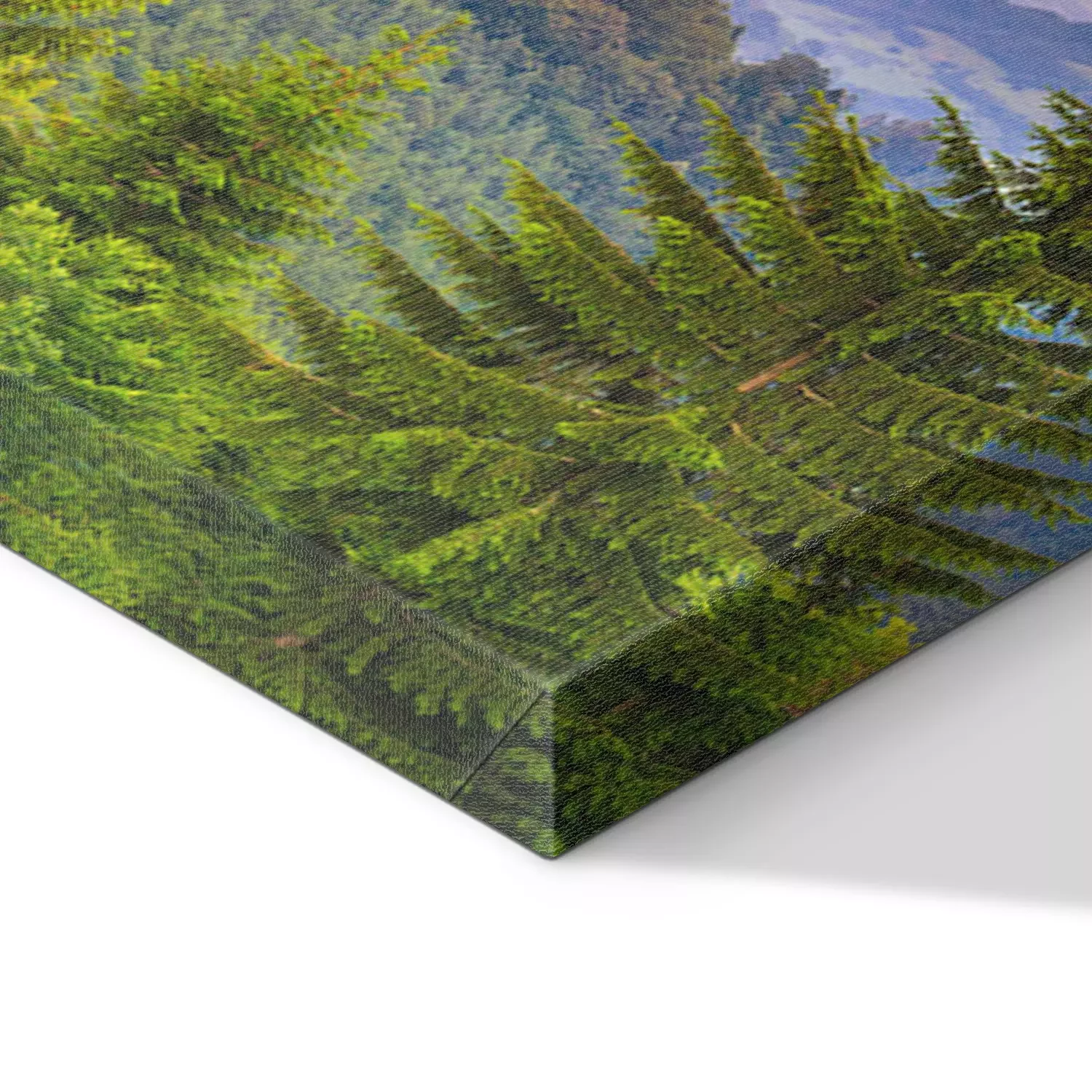 Canvas: pijnbomen nabij vallei in de bergen en bossen op de heuvel onder