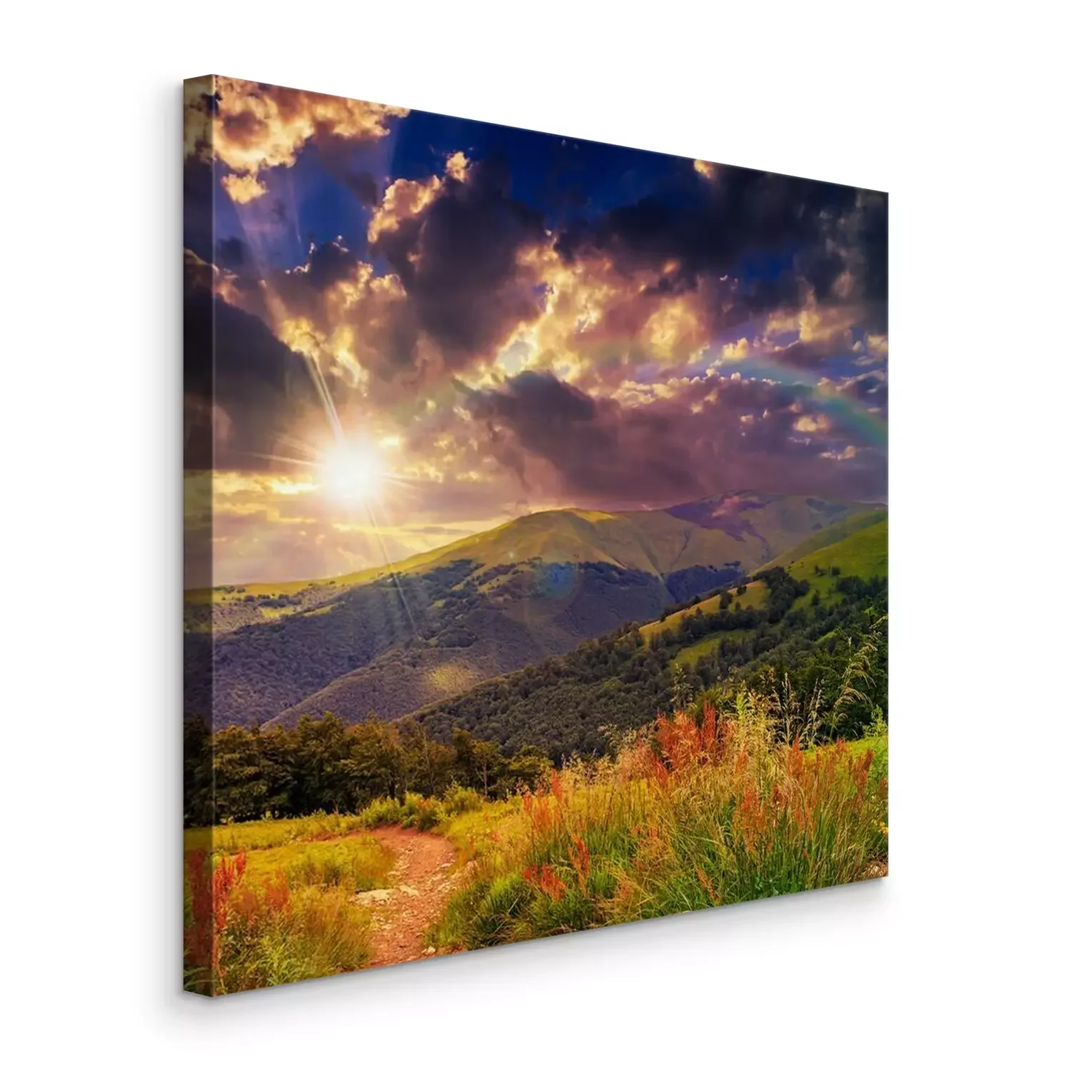 Canvas: Pijnbomen nabij vallei in de bergen op de heuvel onder avond s