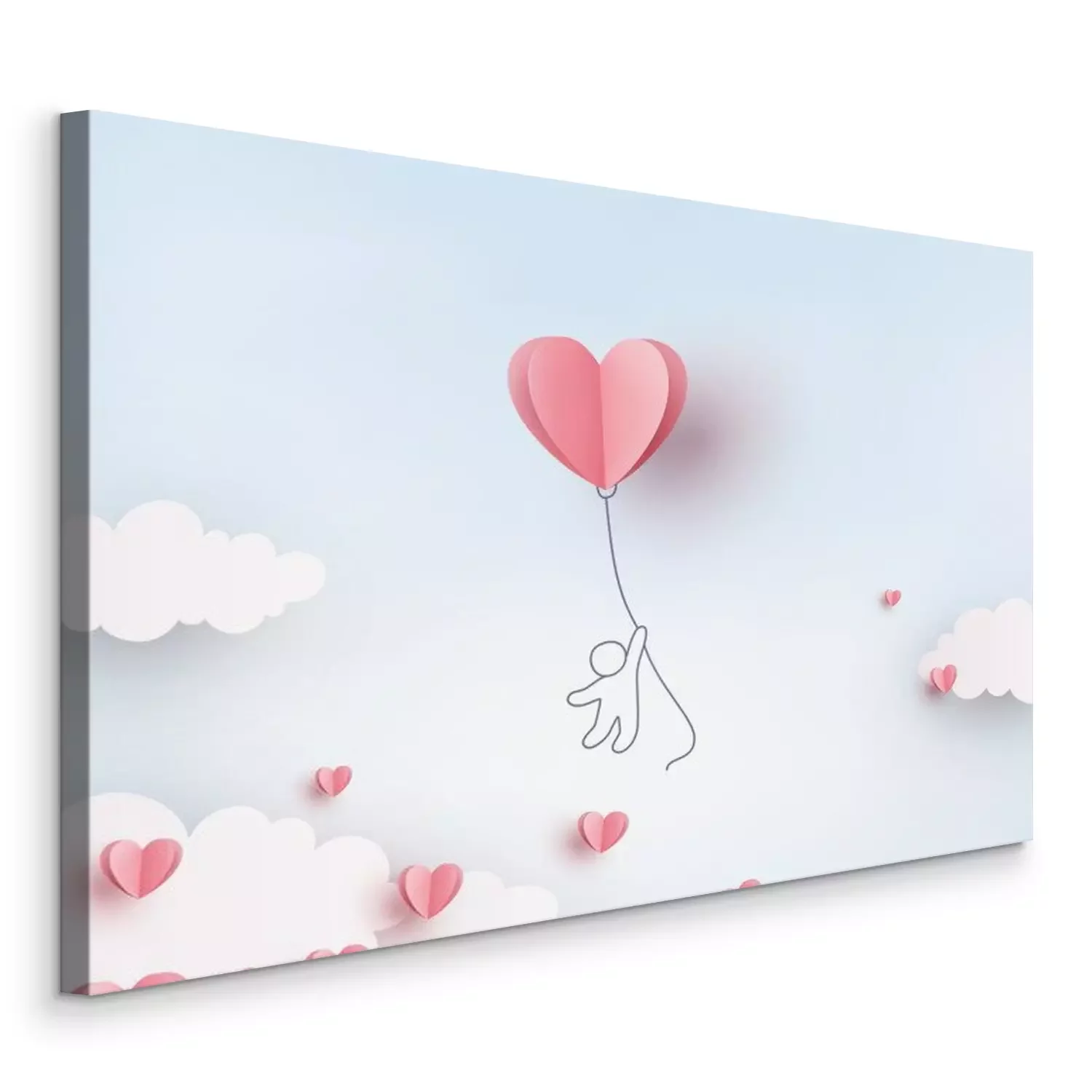 Canvas Pink heart flying balloon with man on blue sky background. Vector love postcard for Happy Mother's, Valentine's Day or birthday greeting card design..