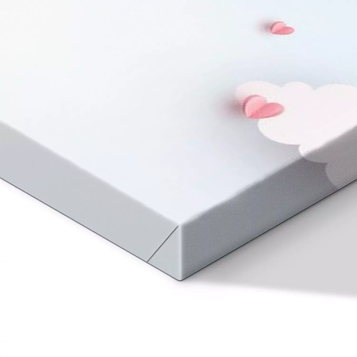 Canvas: Pink heart flying balloon with man on blue sky background. Vector love postcard for Happy Mother's, Valentine's Day or birthday greeting card design..